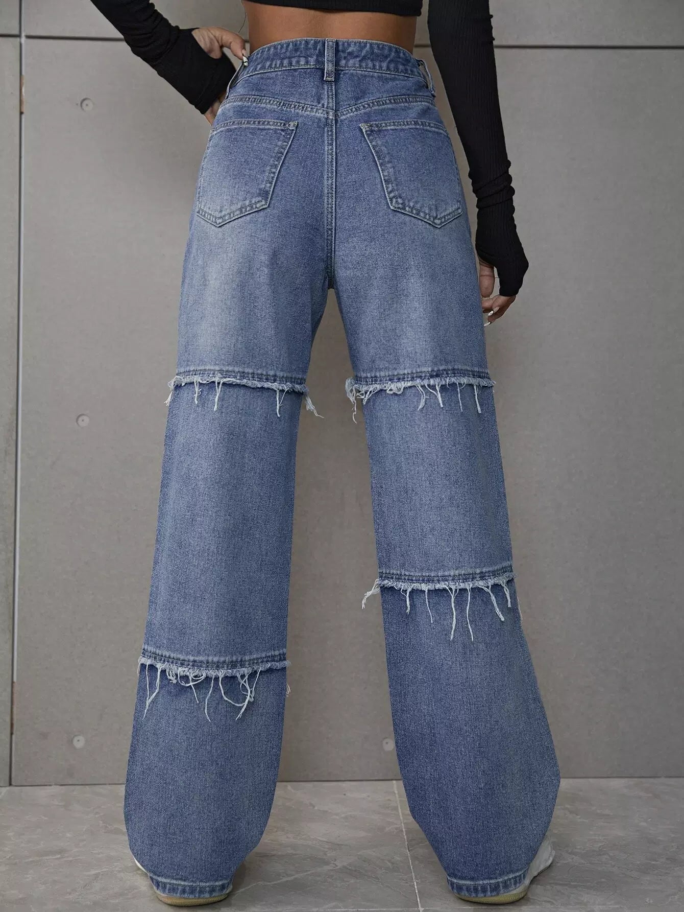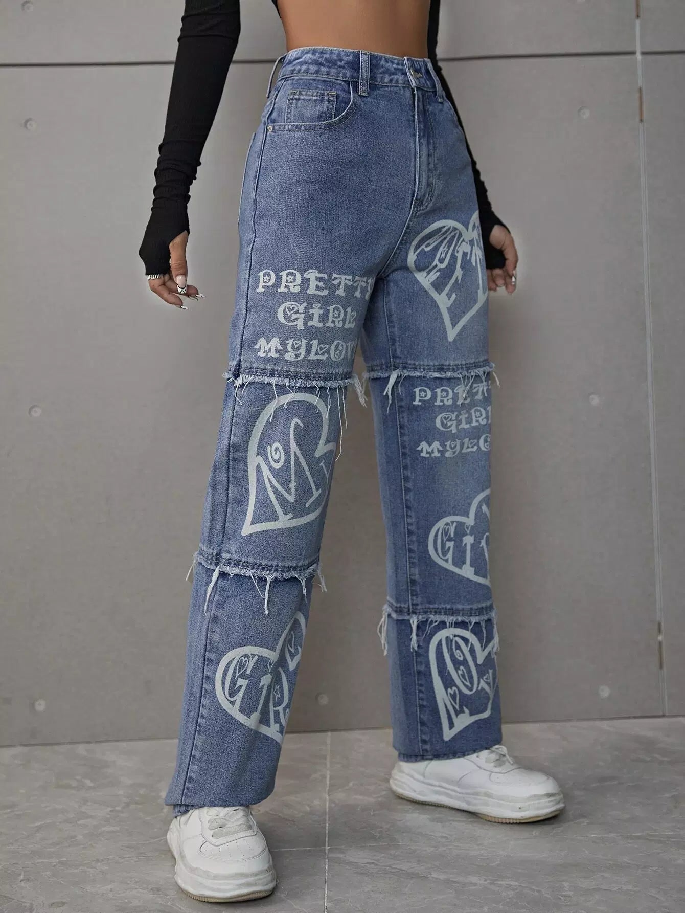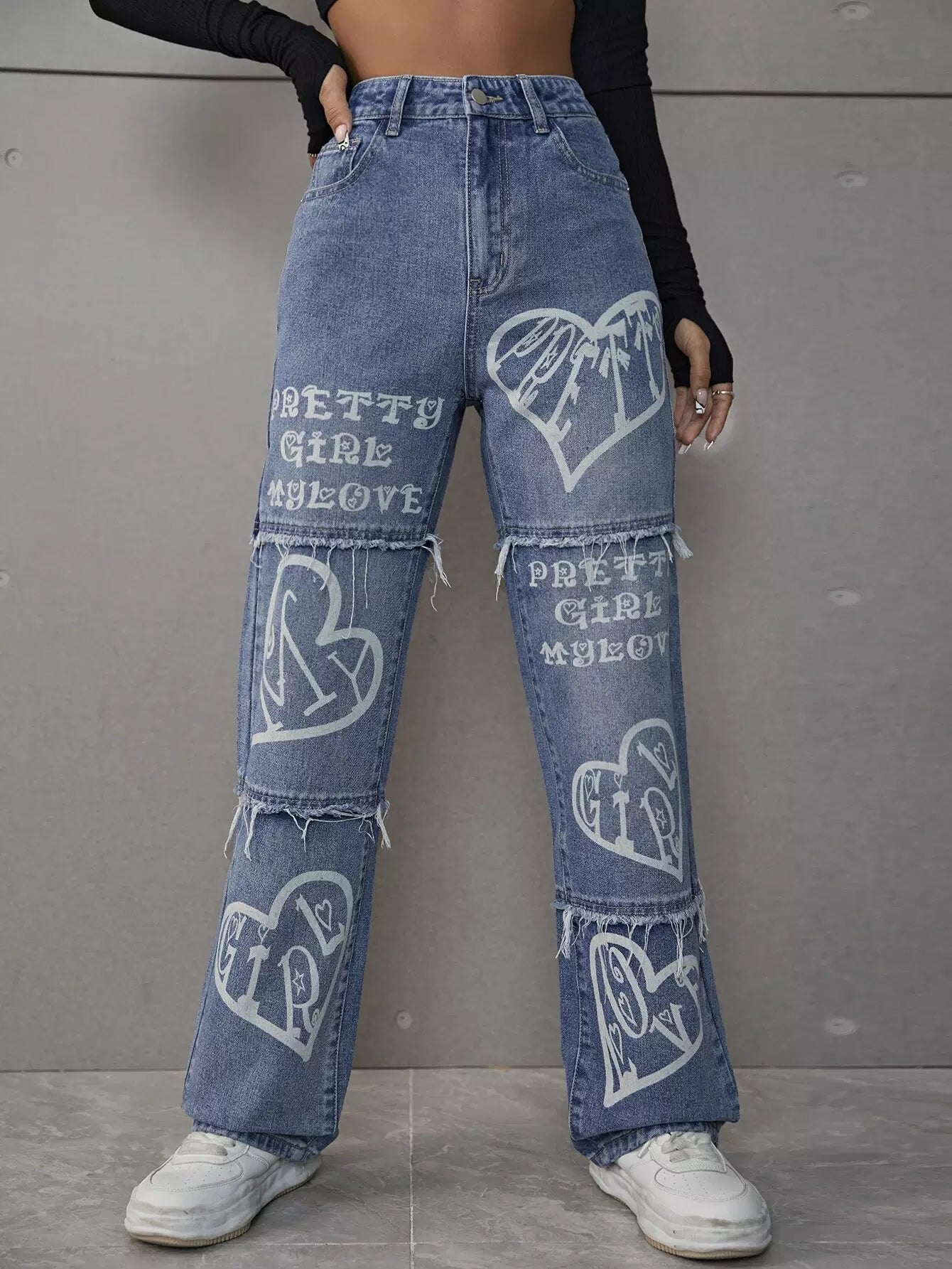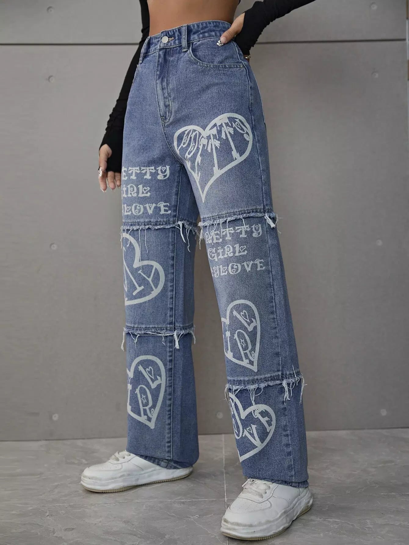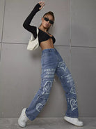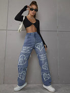 بنطال جينز عريض الساق مطبوع عليه شعار وقلب