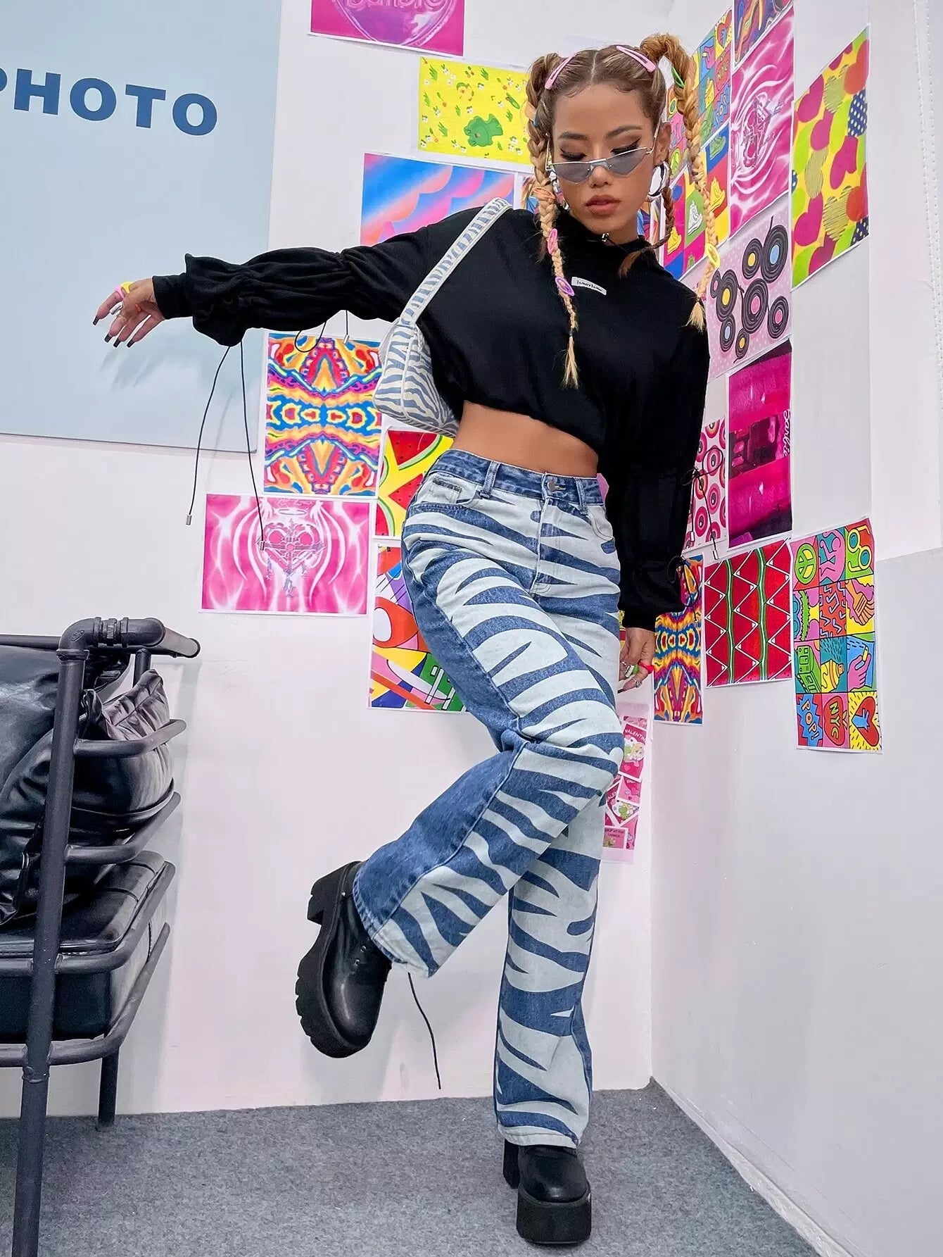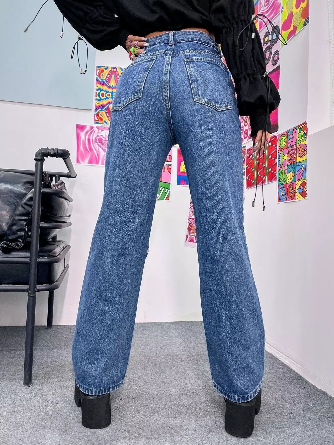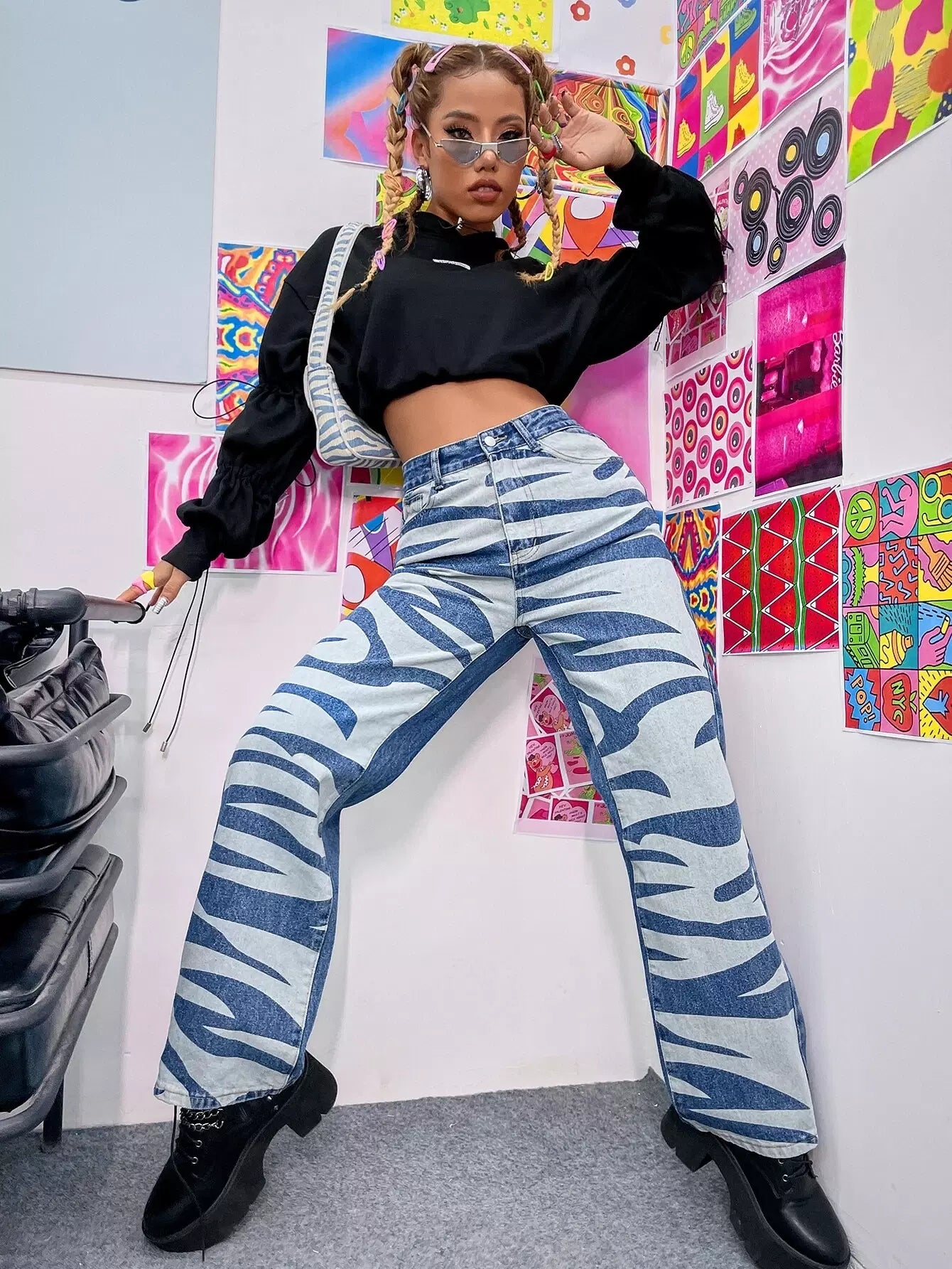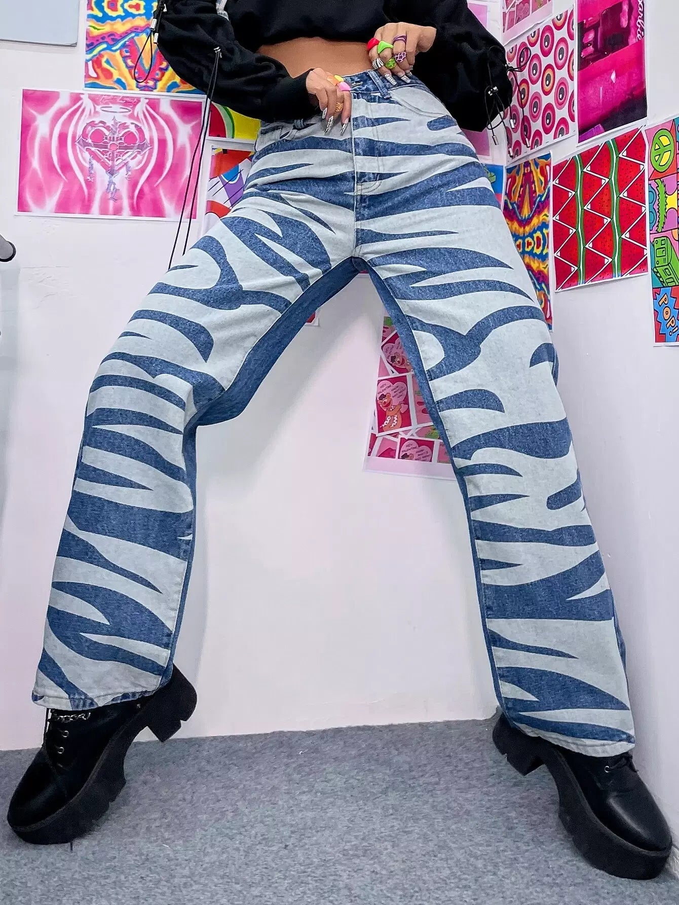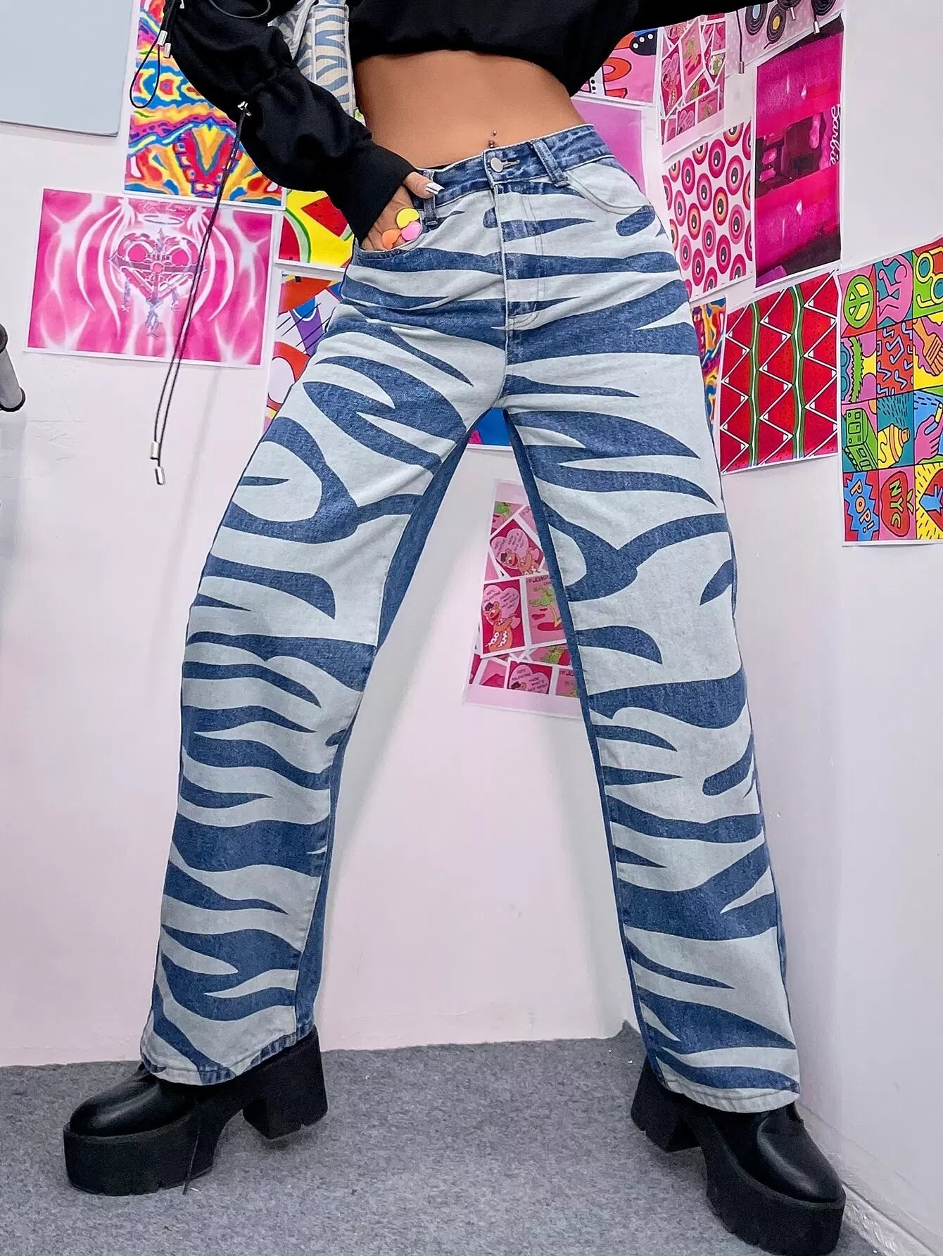 بنطلون جينز بخصر عالي الساق مستقيم بخطوط زيبرا