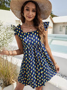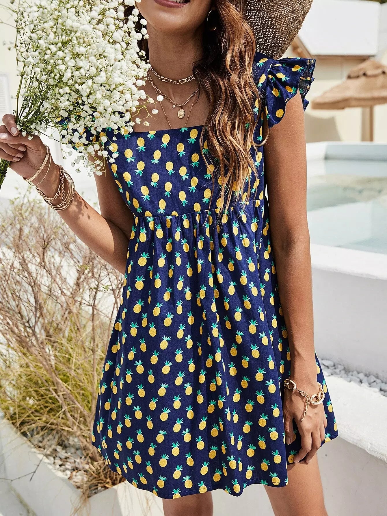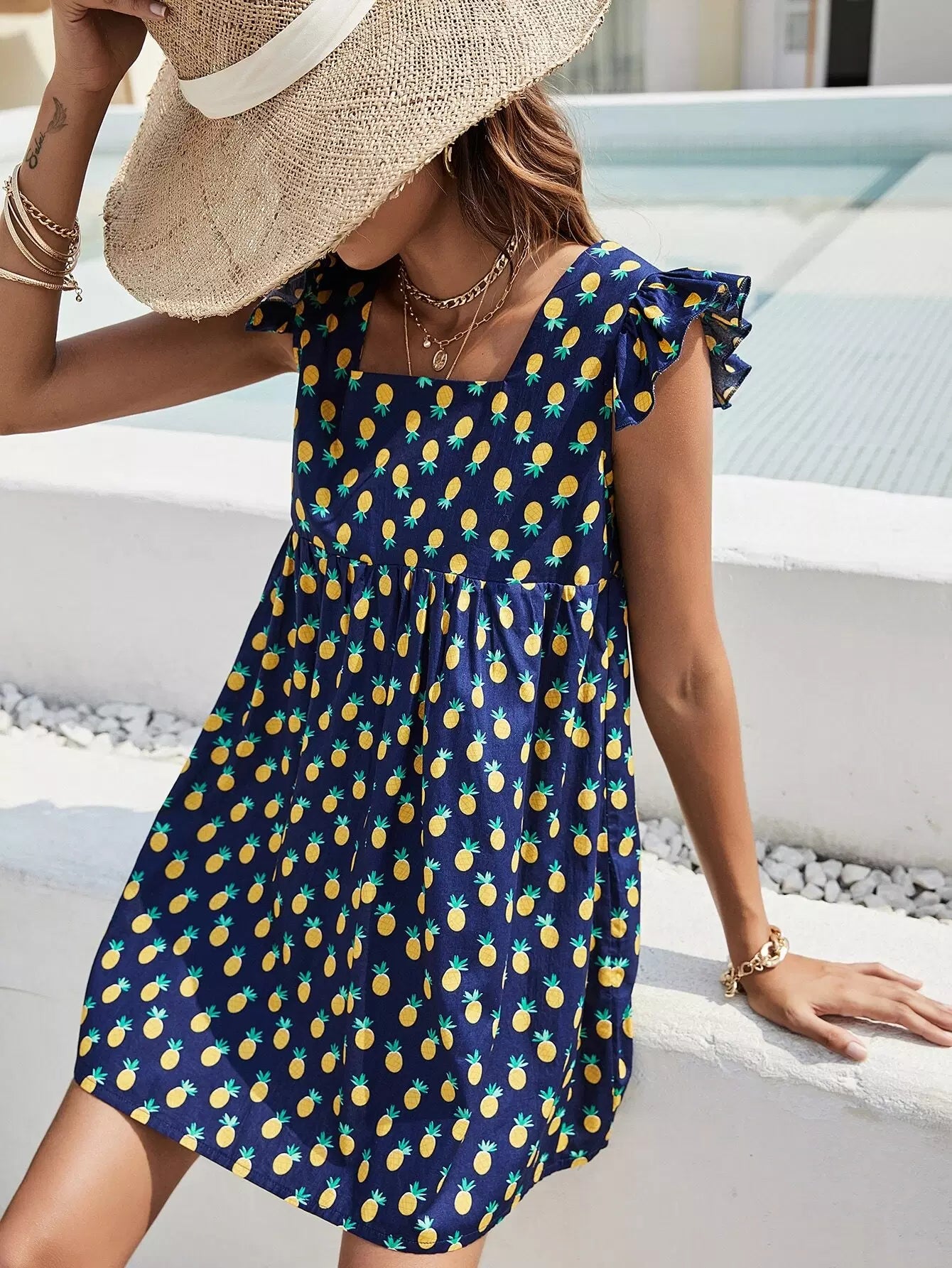 فستان أناناس مطبوع بالكامل بطبعة أناناس وكشكش بحواف مكشكشة