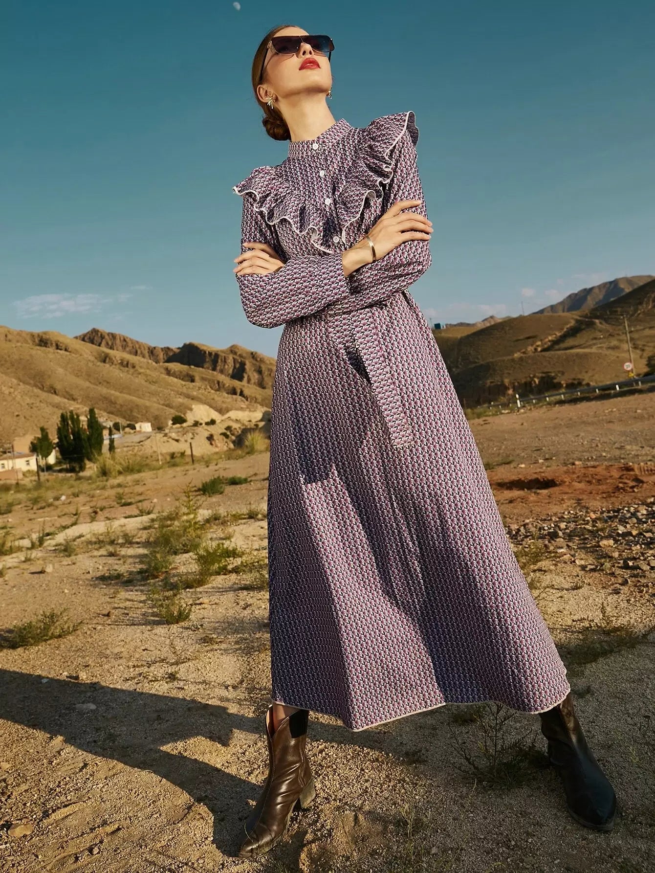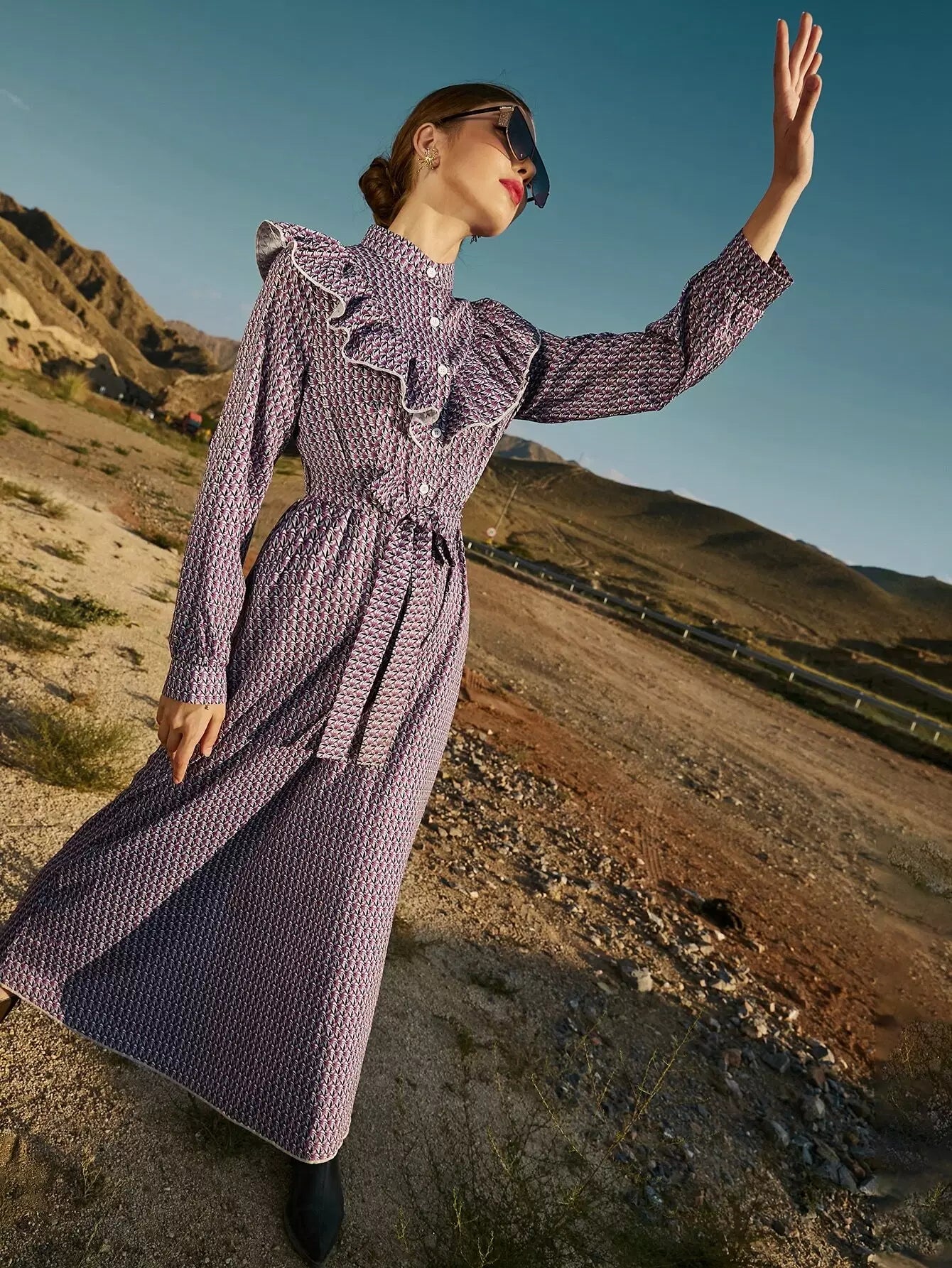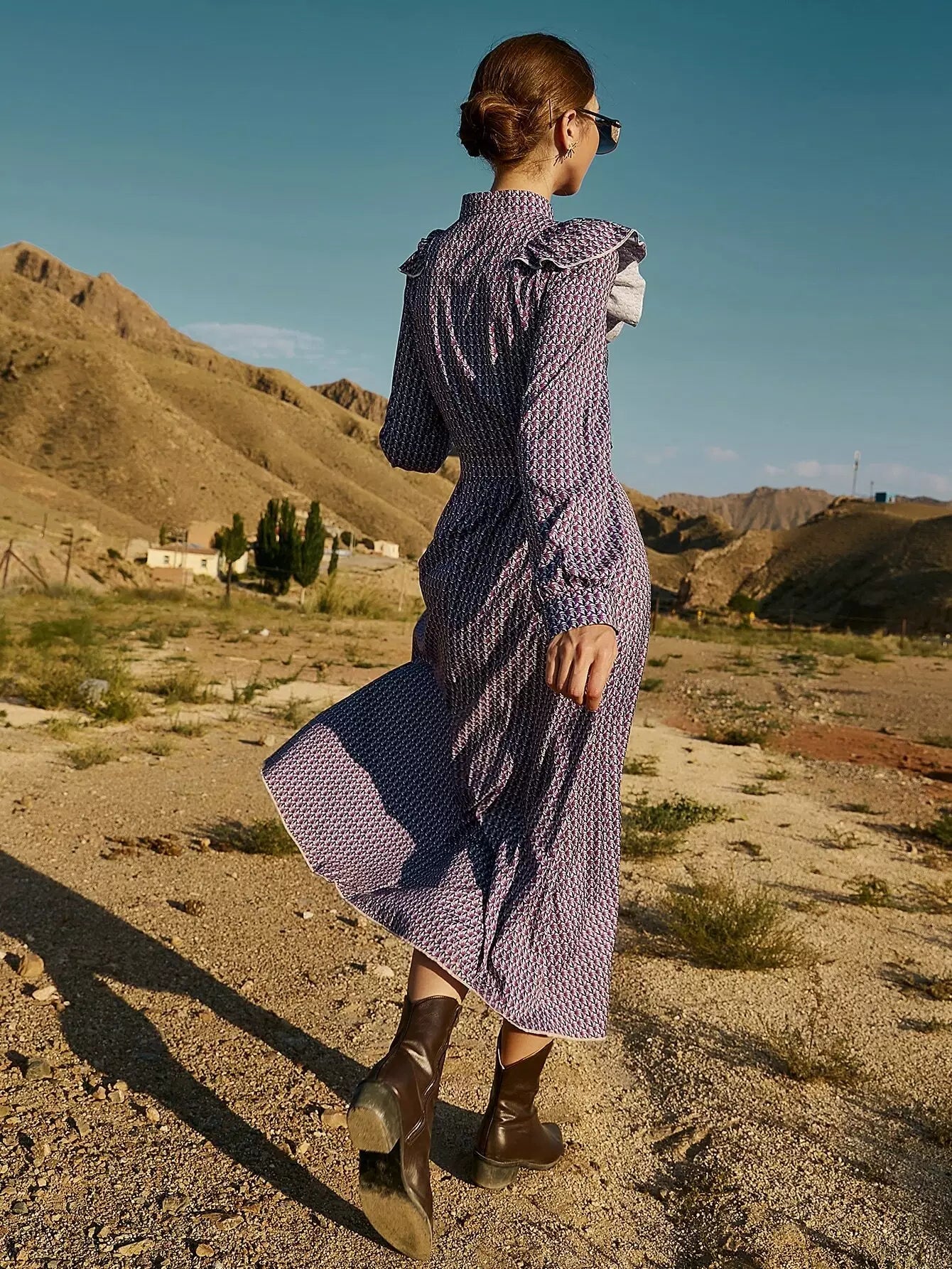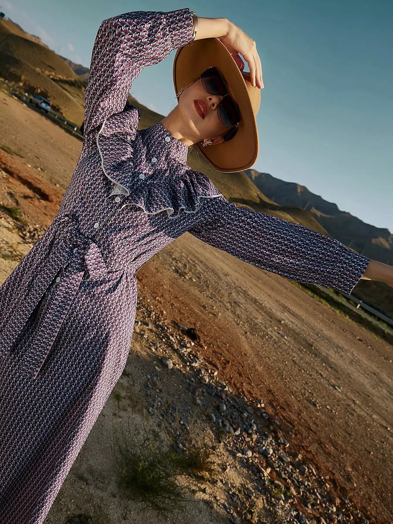 فستان مطبوع بالكامل بطبعة أزرار أمامية مكشكشة بالكامل