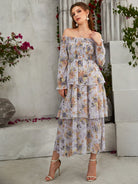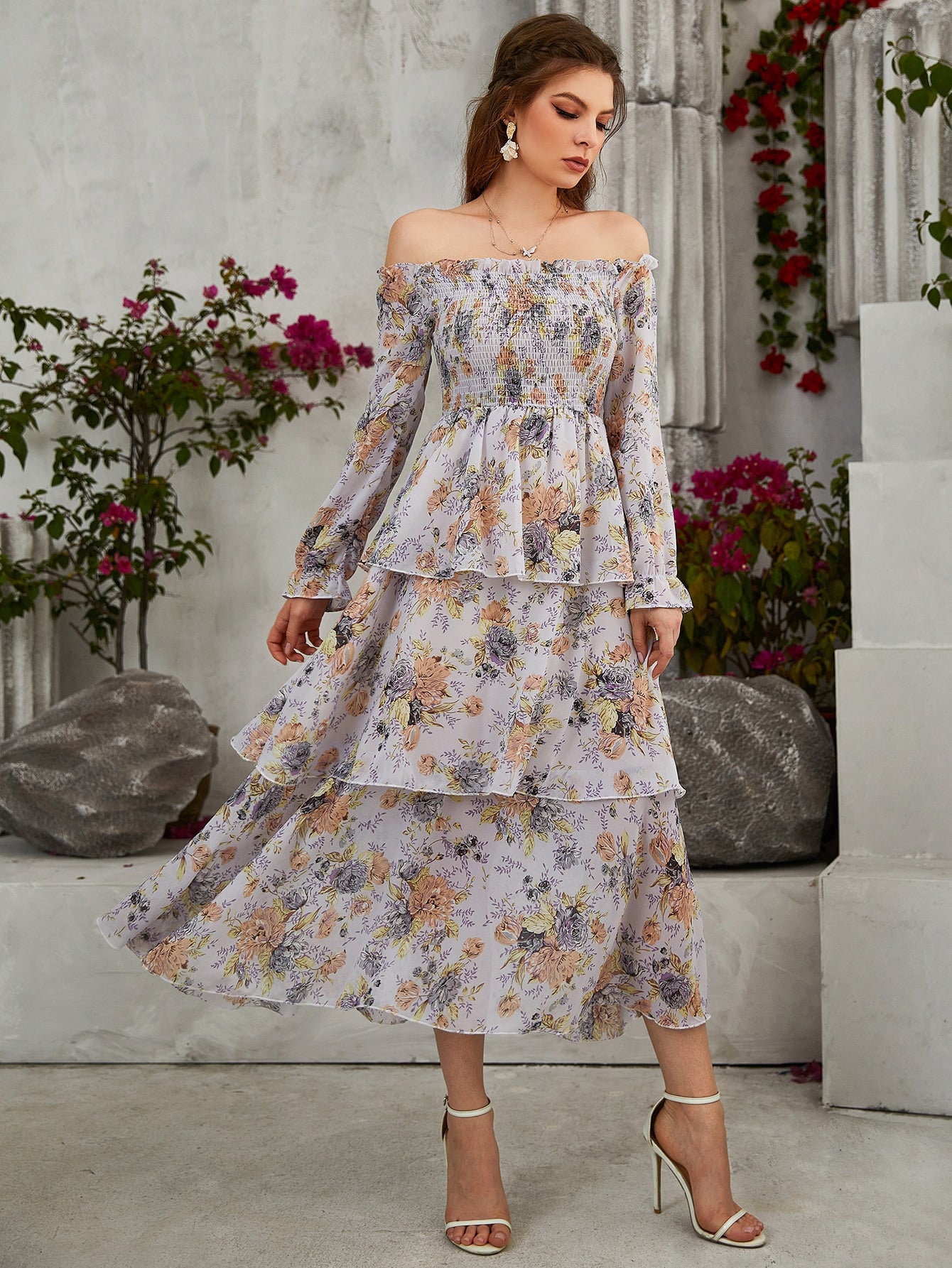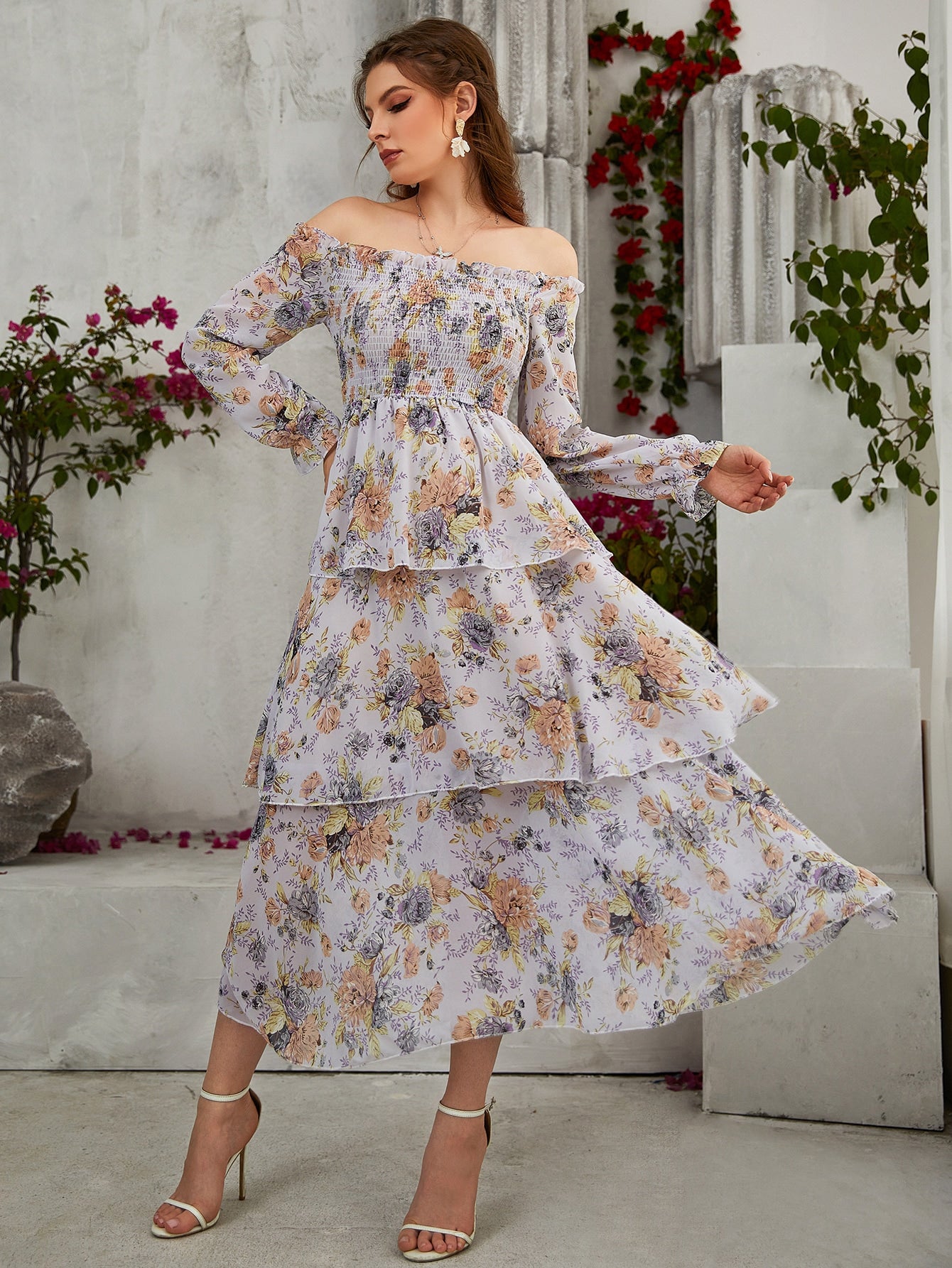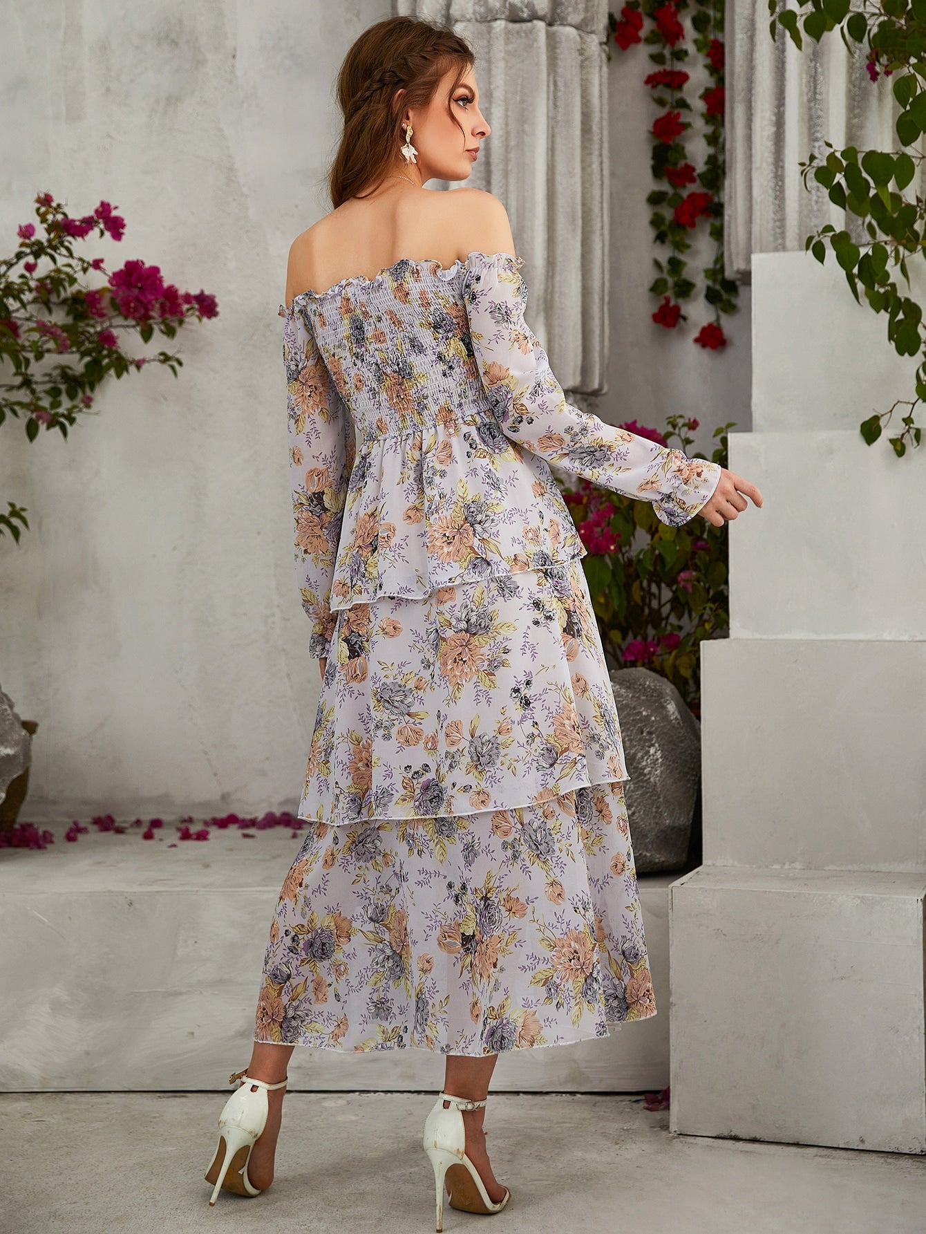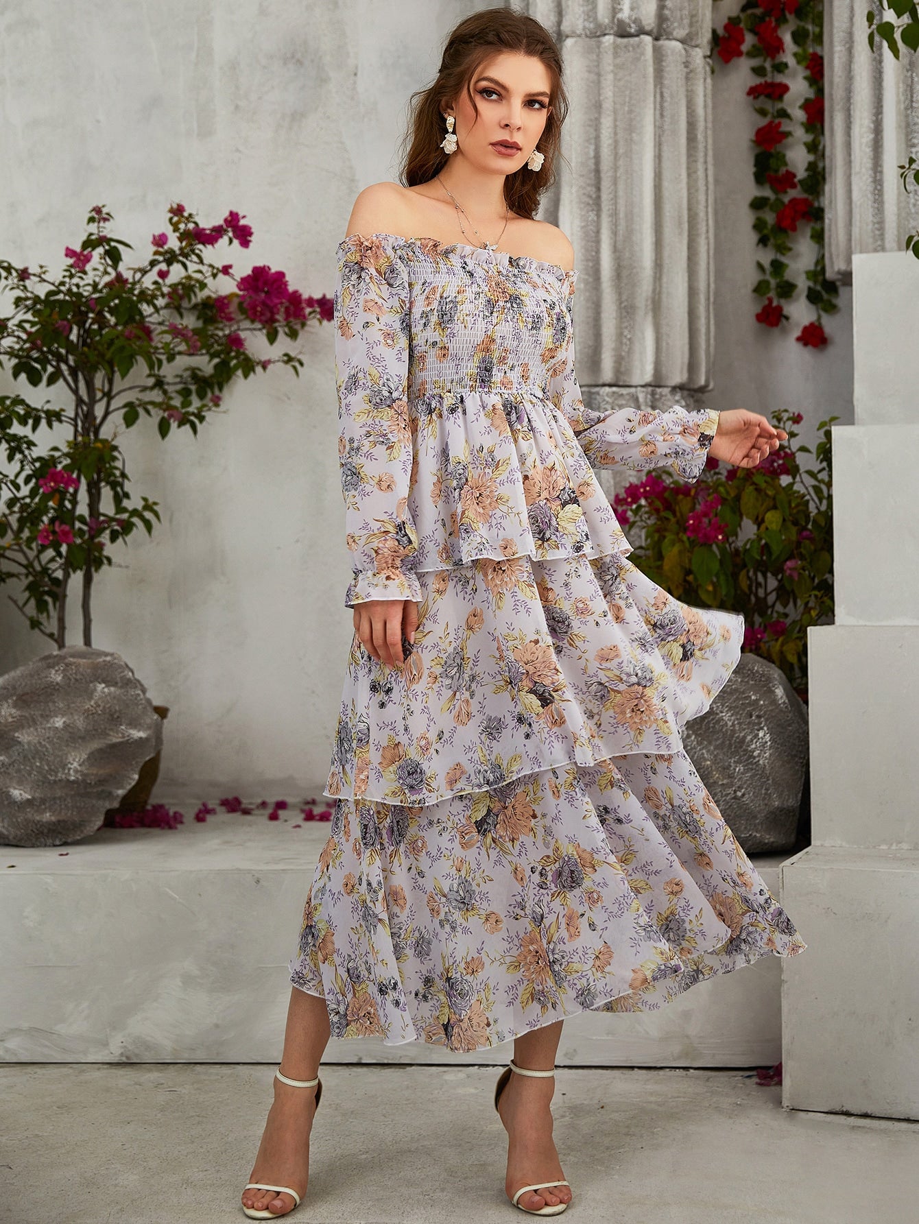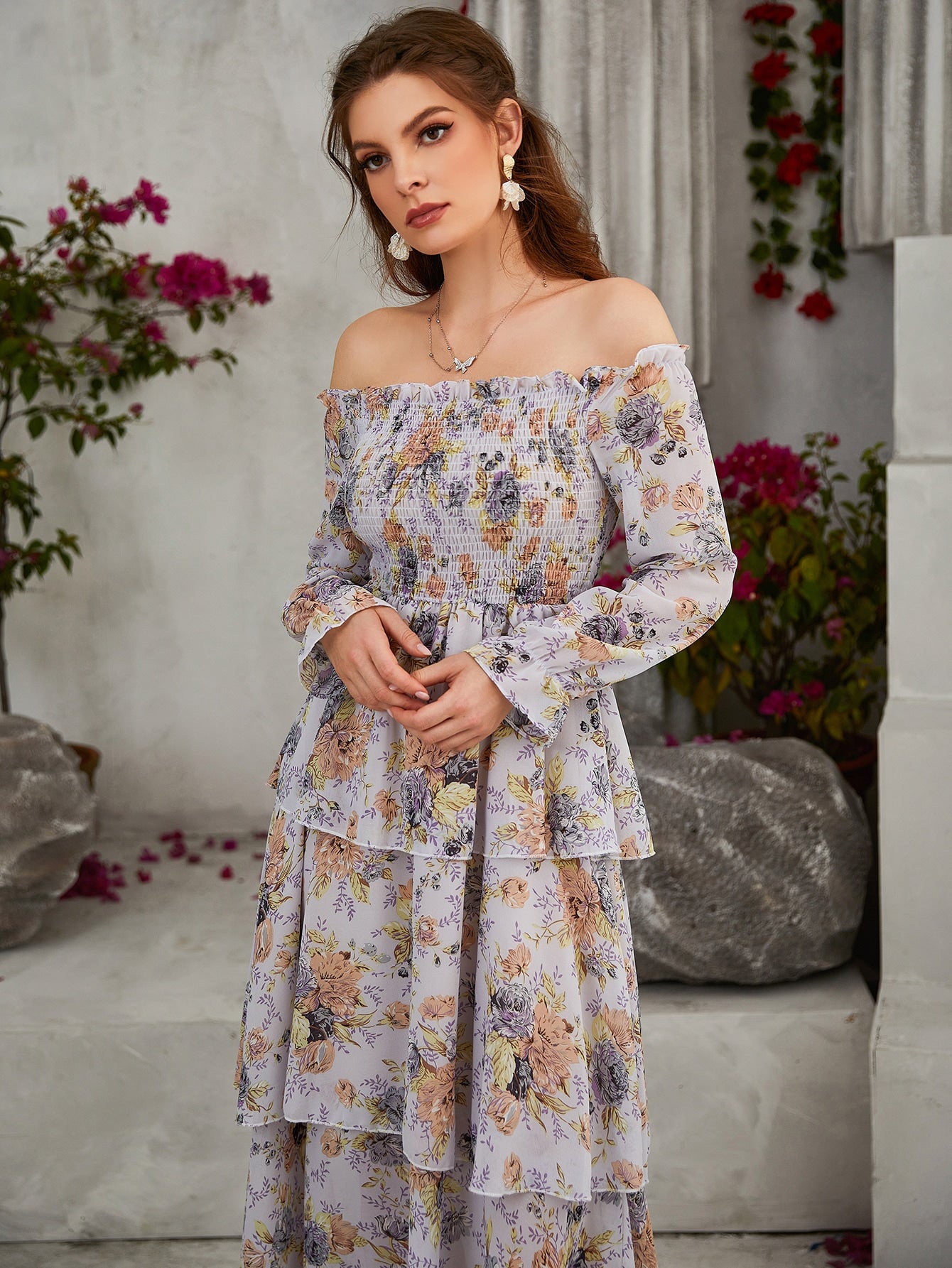Allover Floral Print Off The Shoulder Shirred Layered Hem Dress