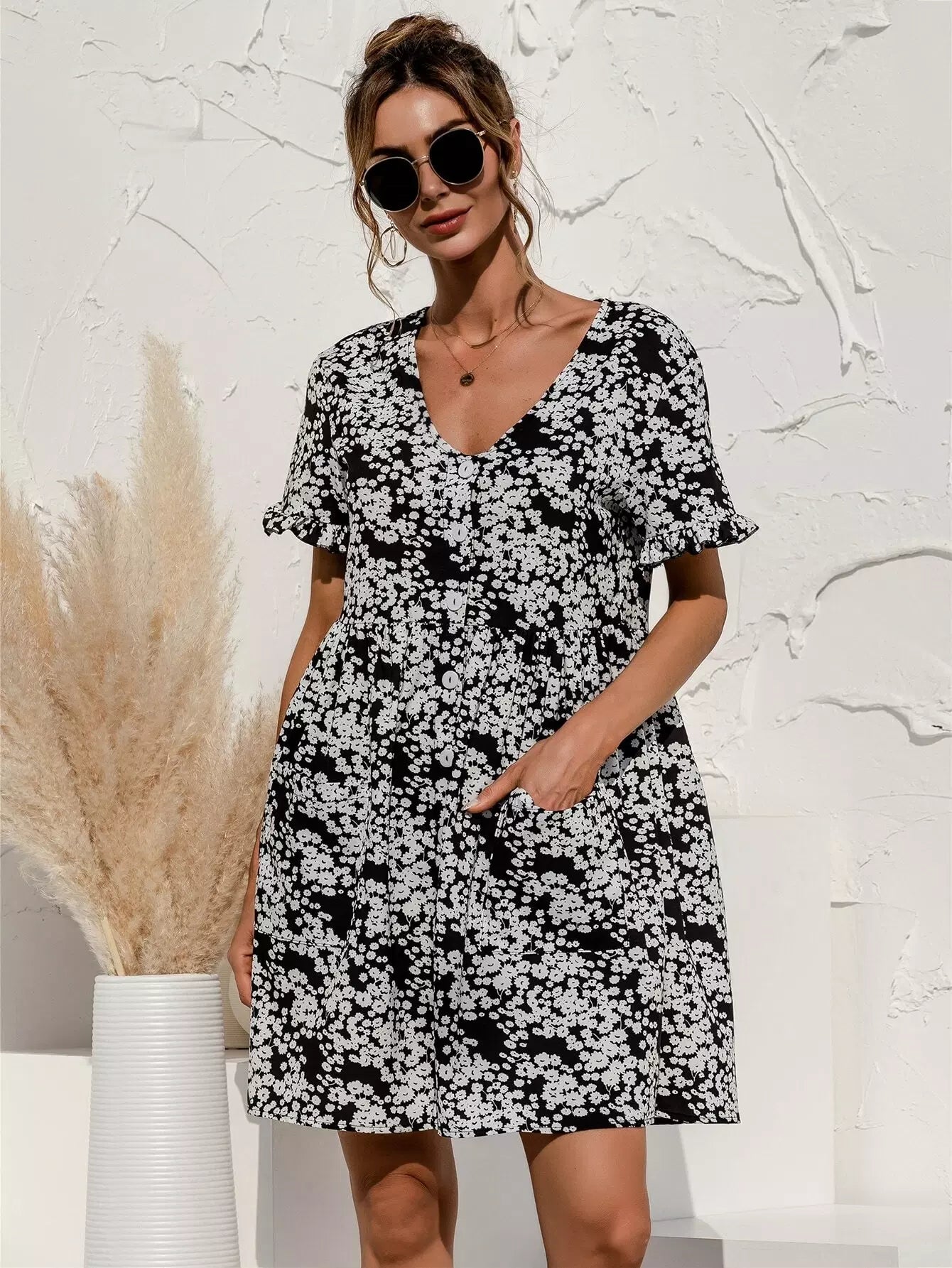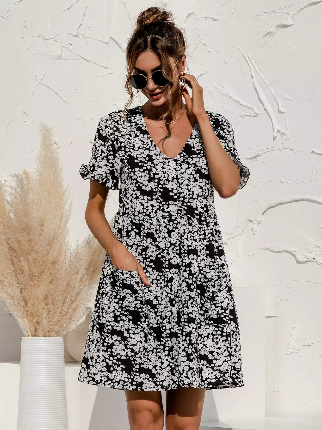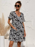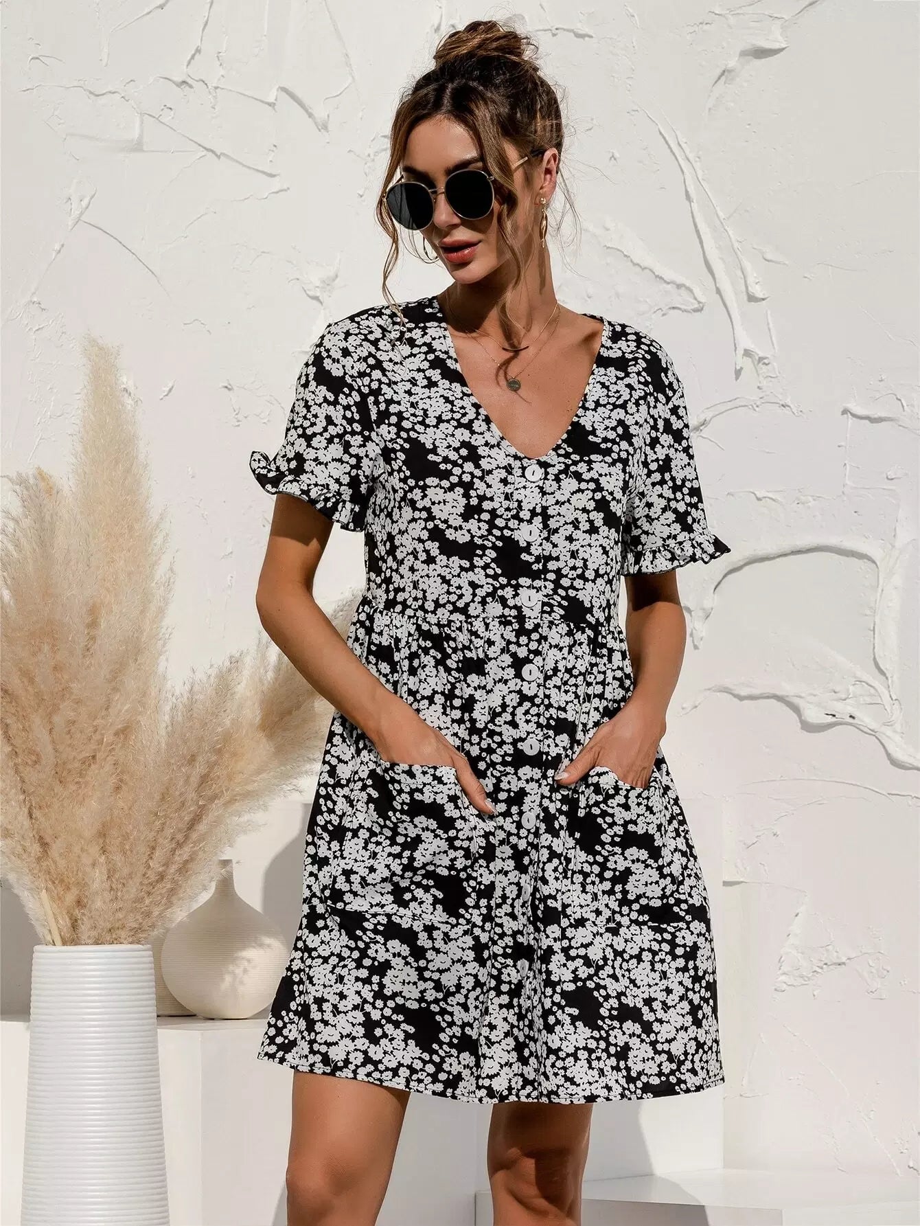 فستان مزين بطبعة زهور مطبوع على الجيب بالكامل