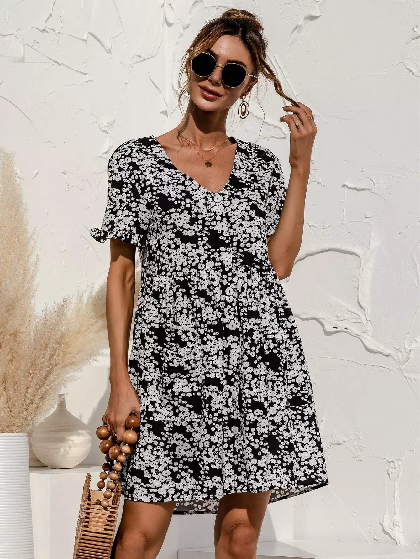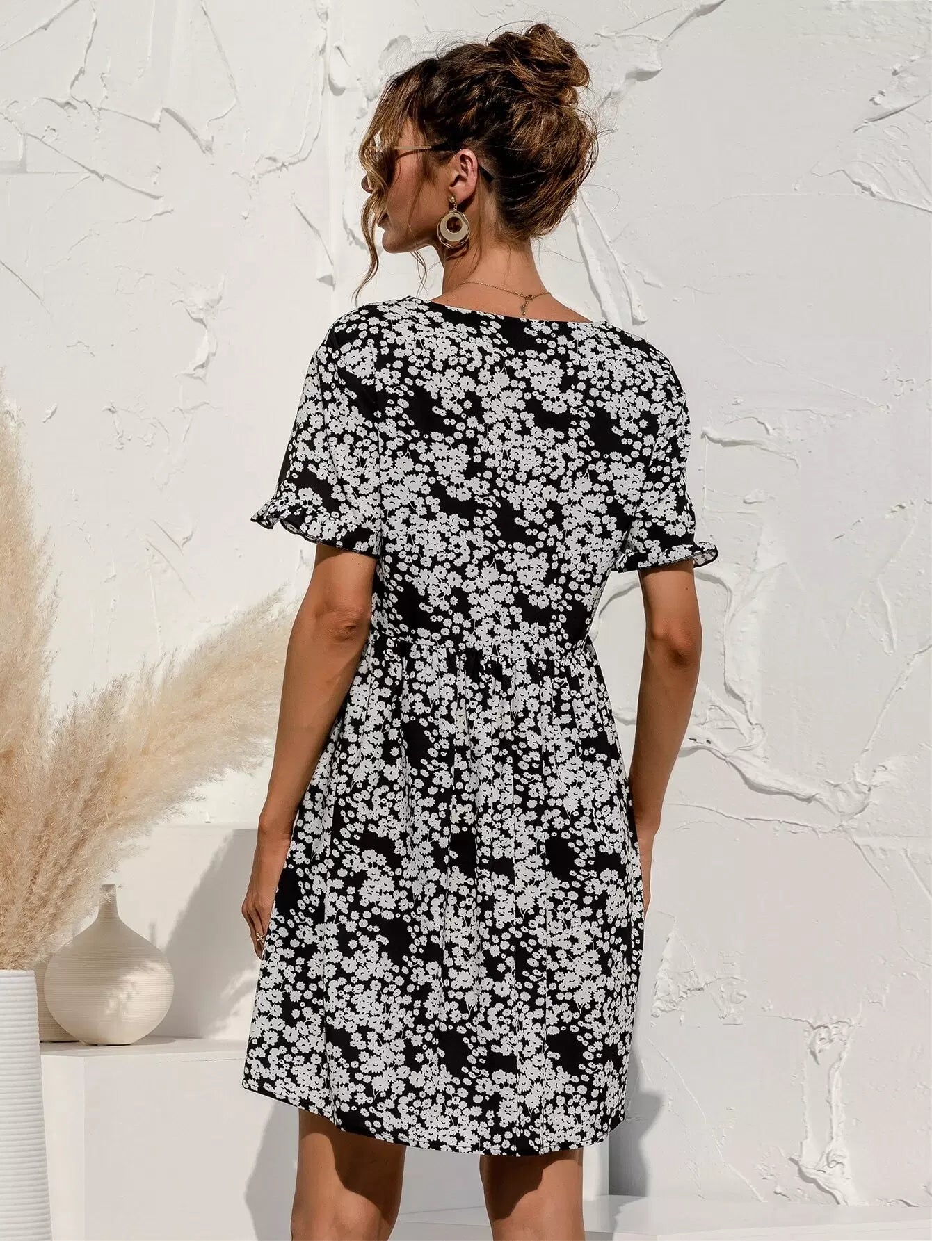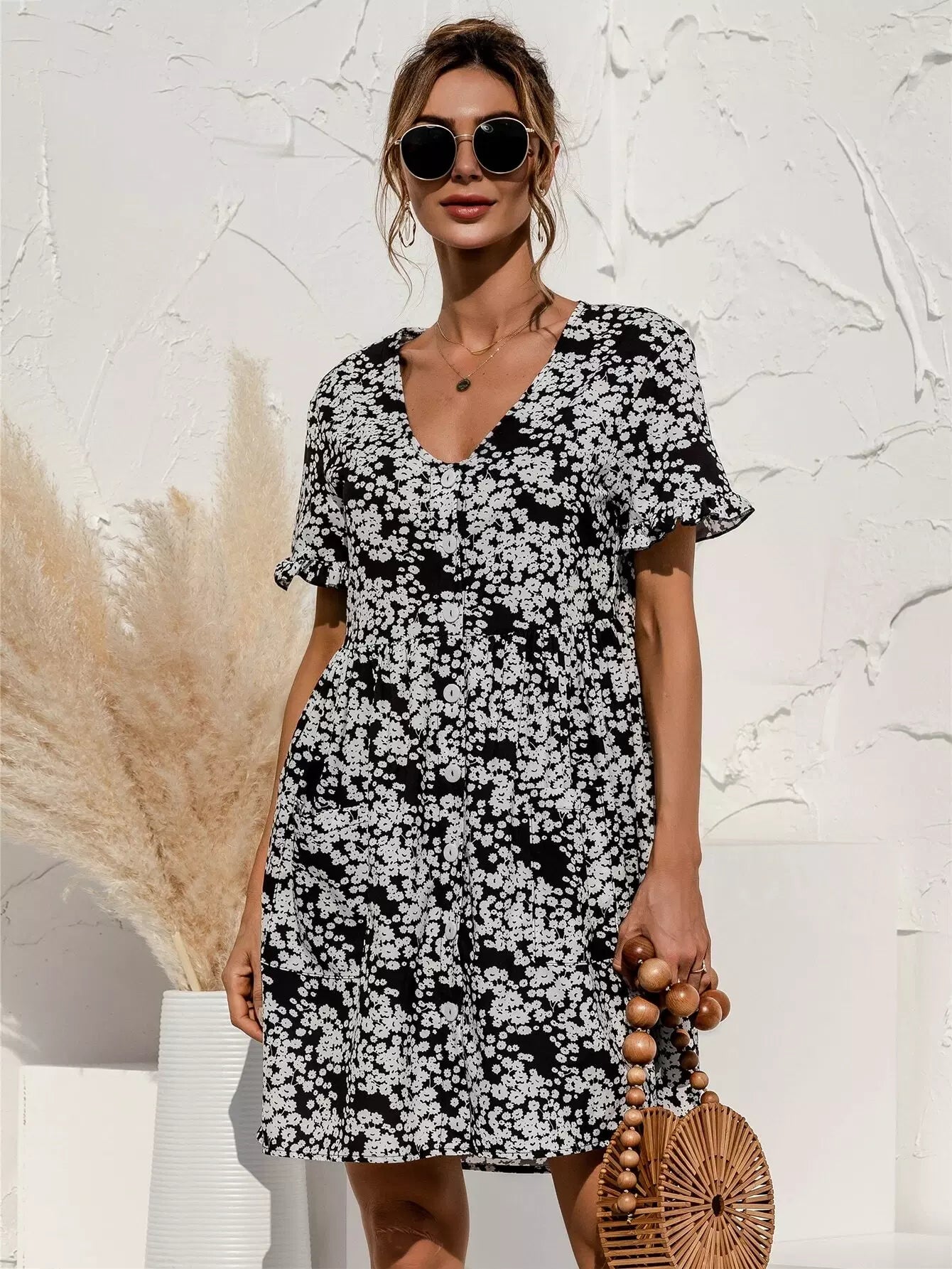 فستان مزين بطبعة زهور مطبوع على الجيب بالكامل