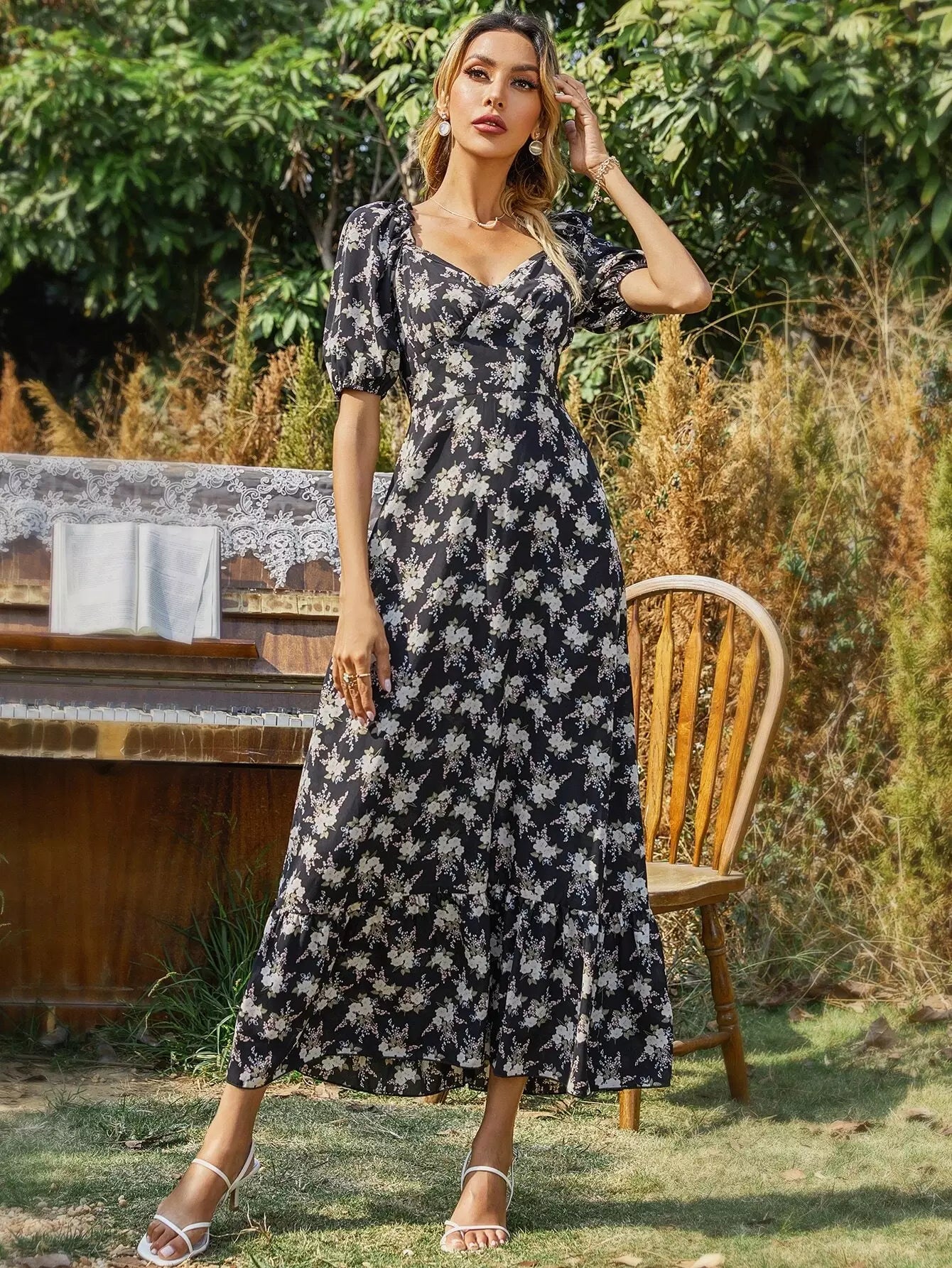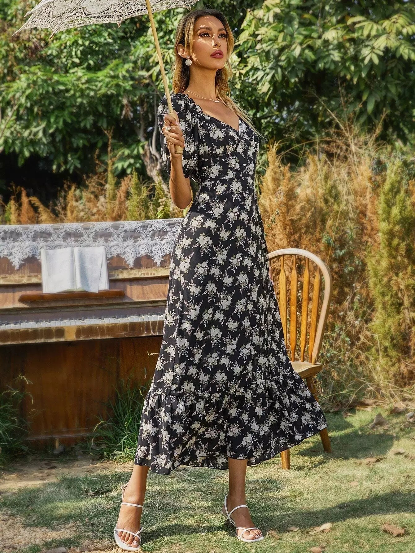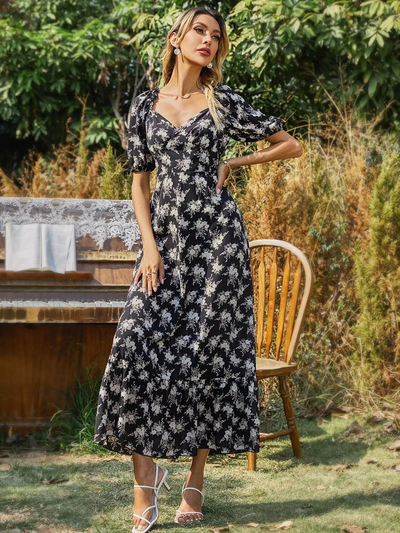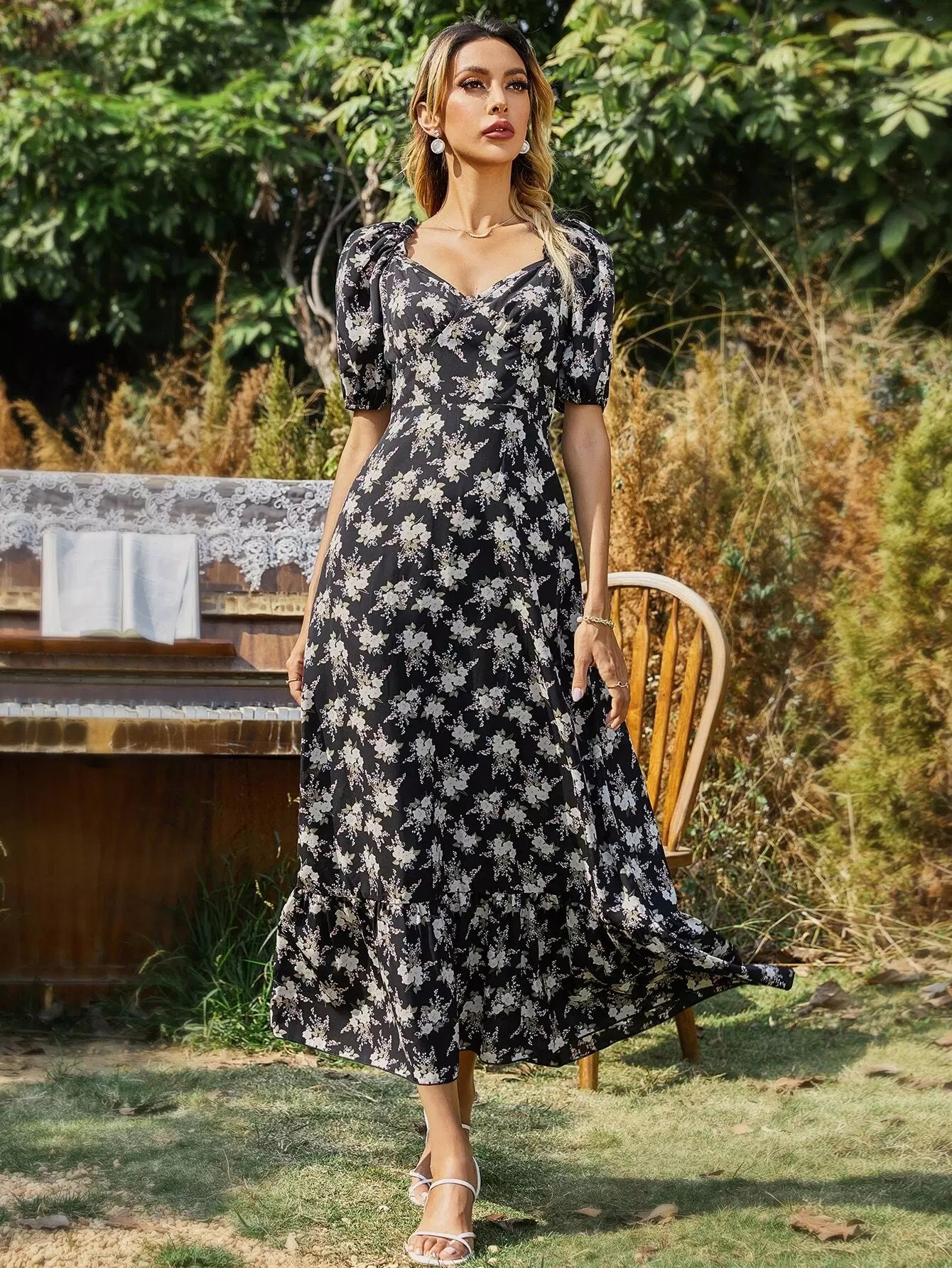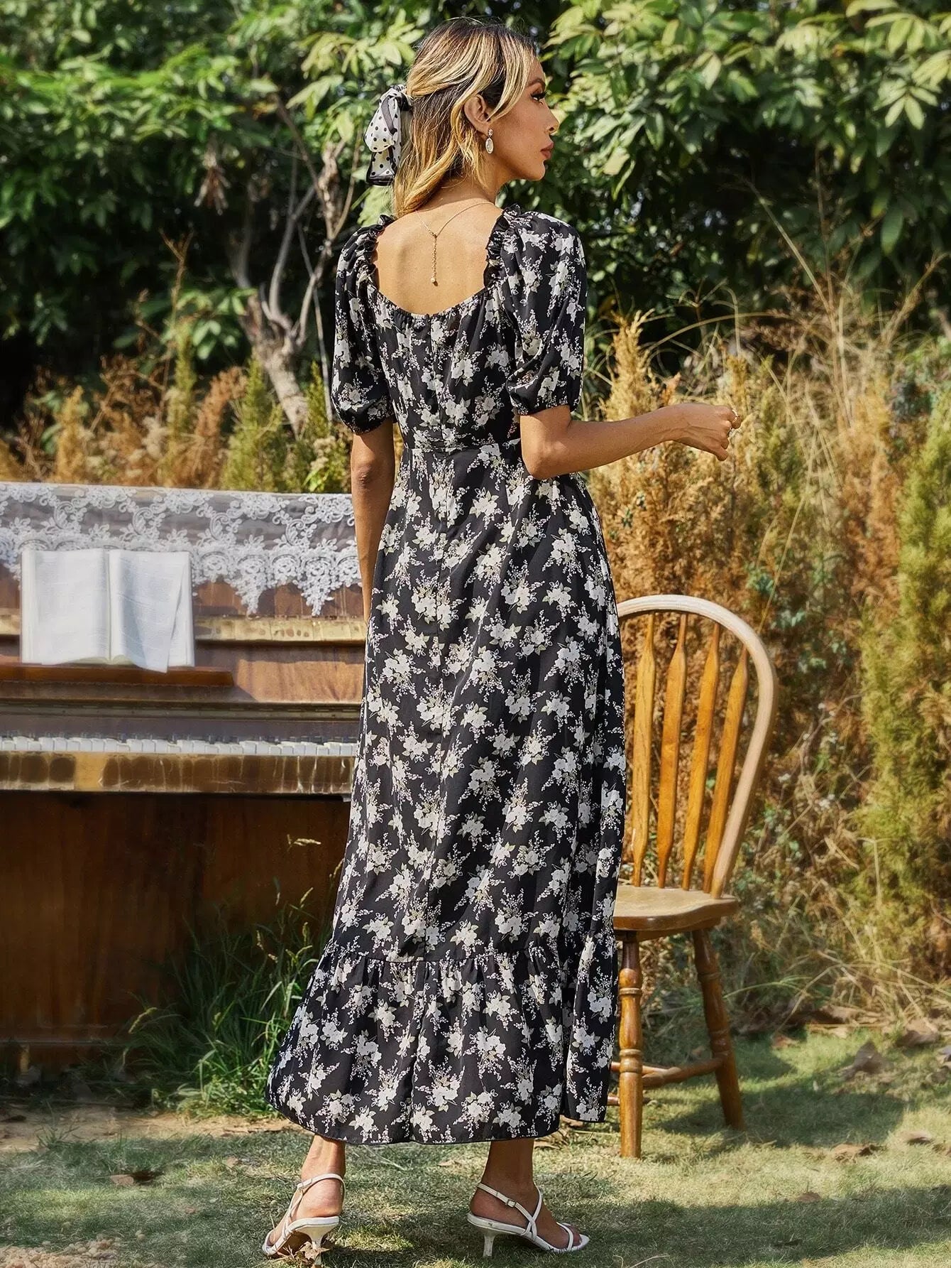 فستان بأكمام منفوشة بطبعات زهور بأكمام كشكش منفوشة