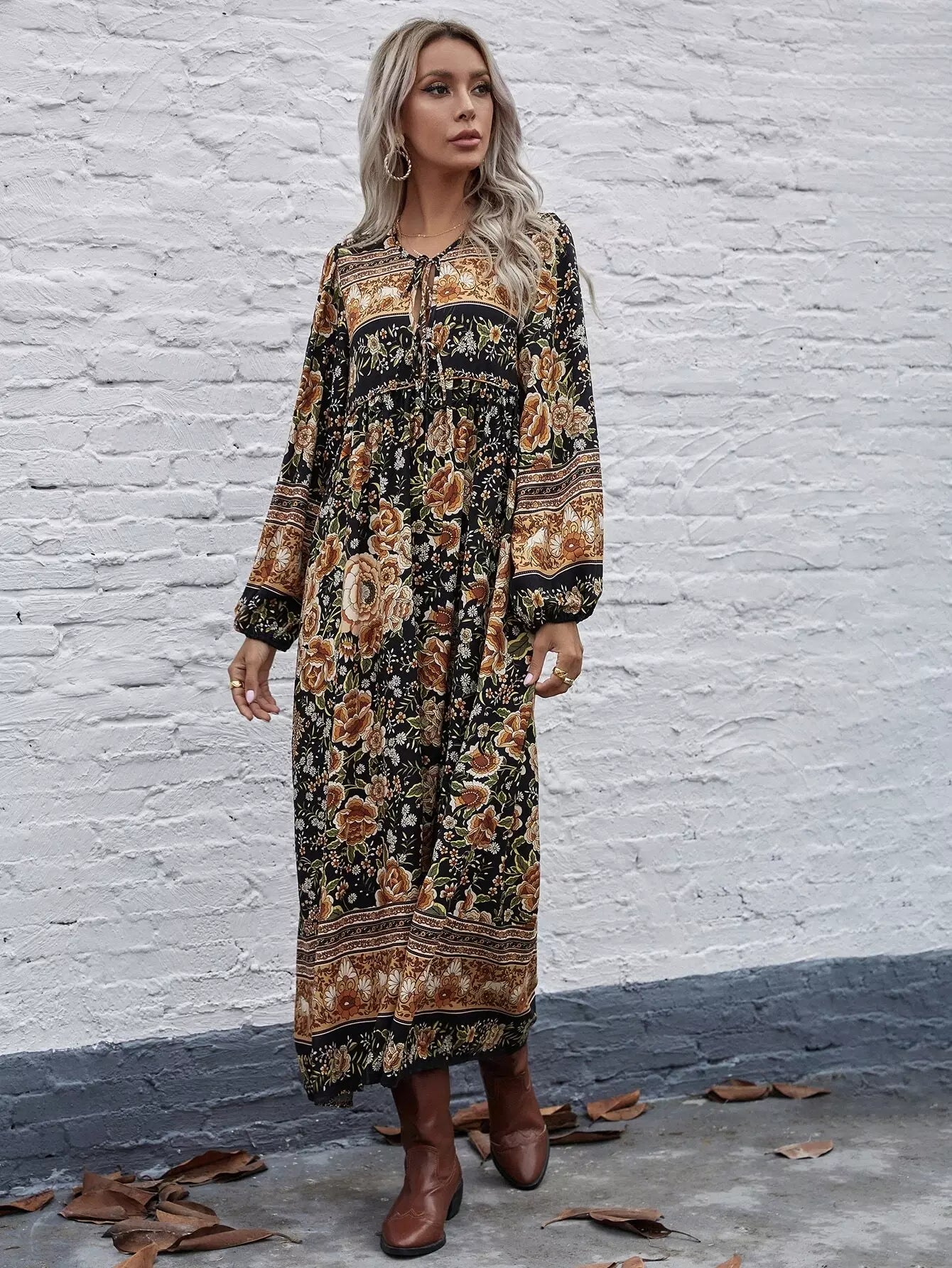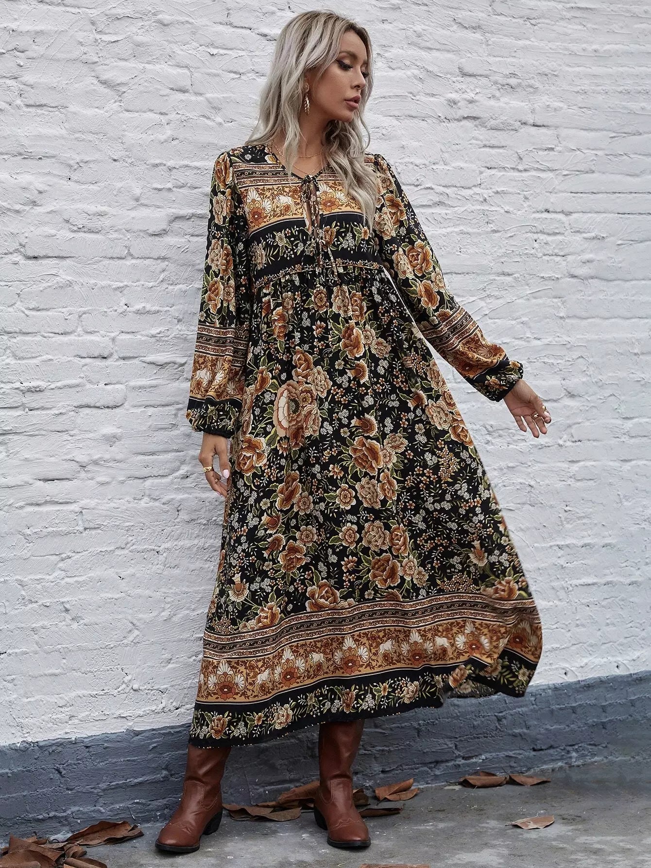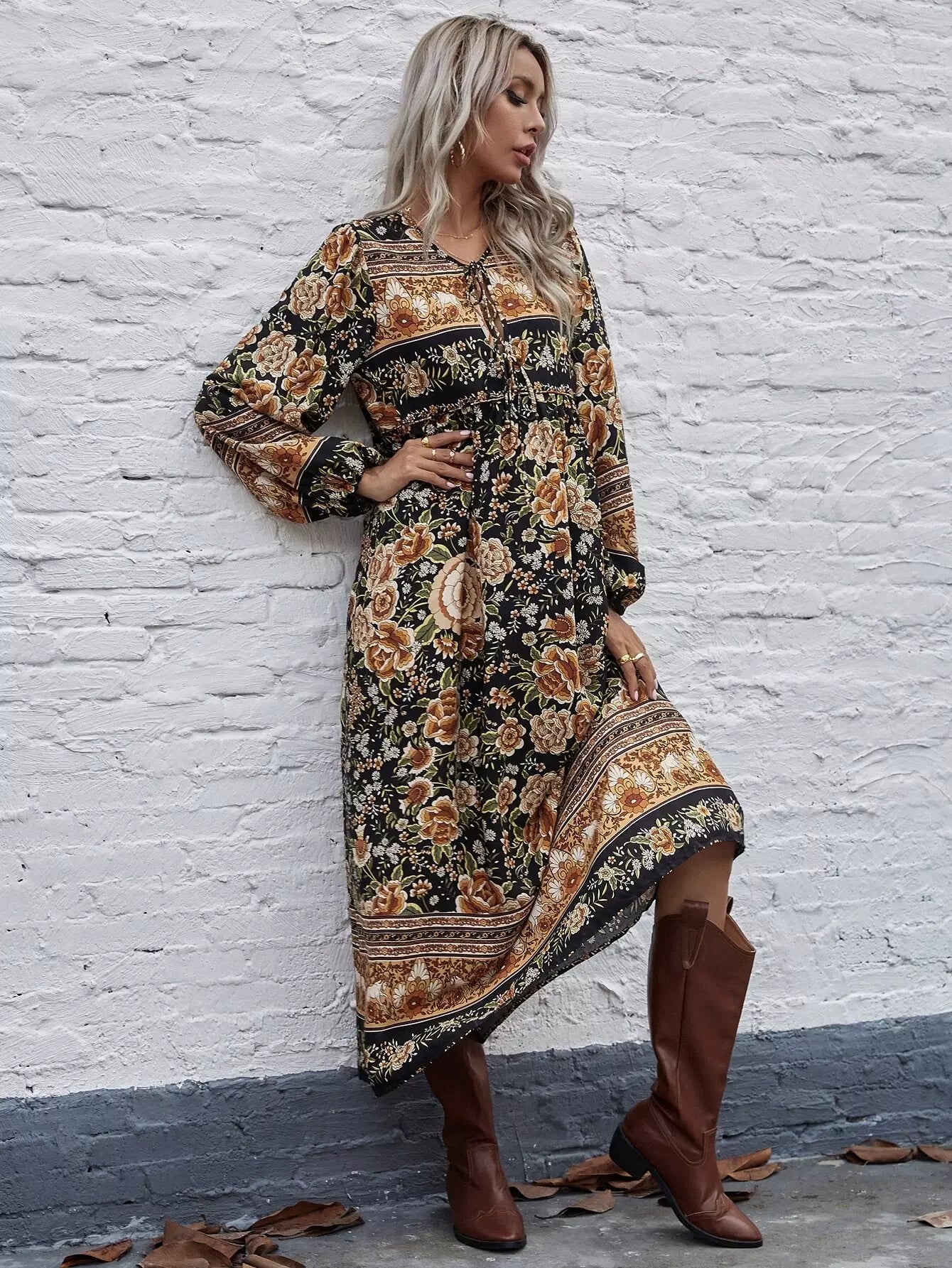 فستان برقبة ربطة عنق مزين بالأزهار بالكامل