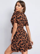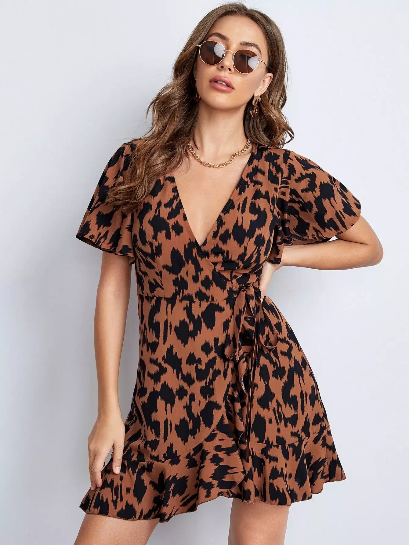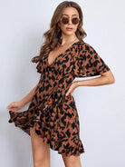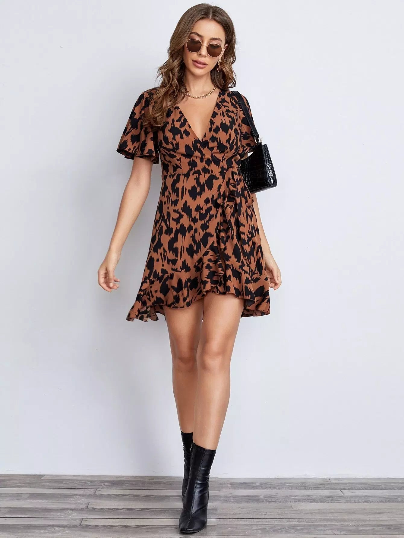 فستان ملفوف بأكمام فراشة وطبعة كاملة بدون حزام