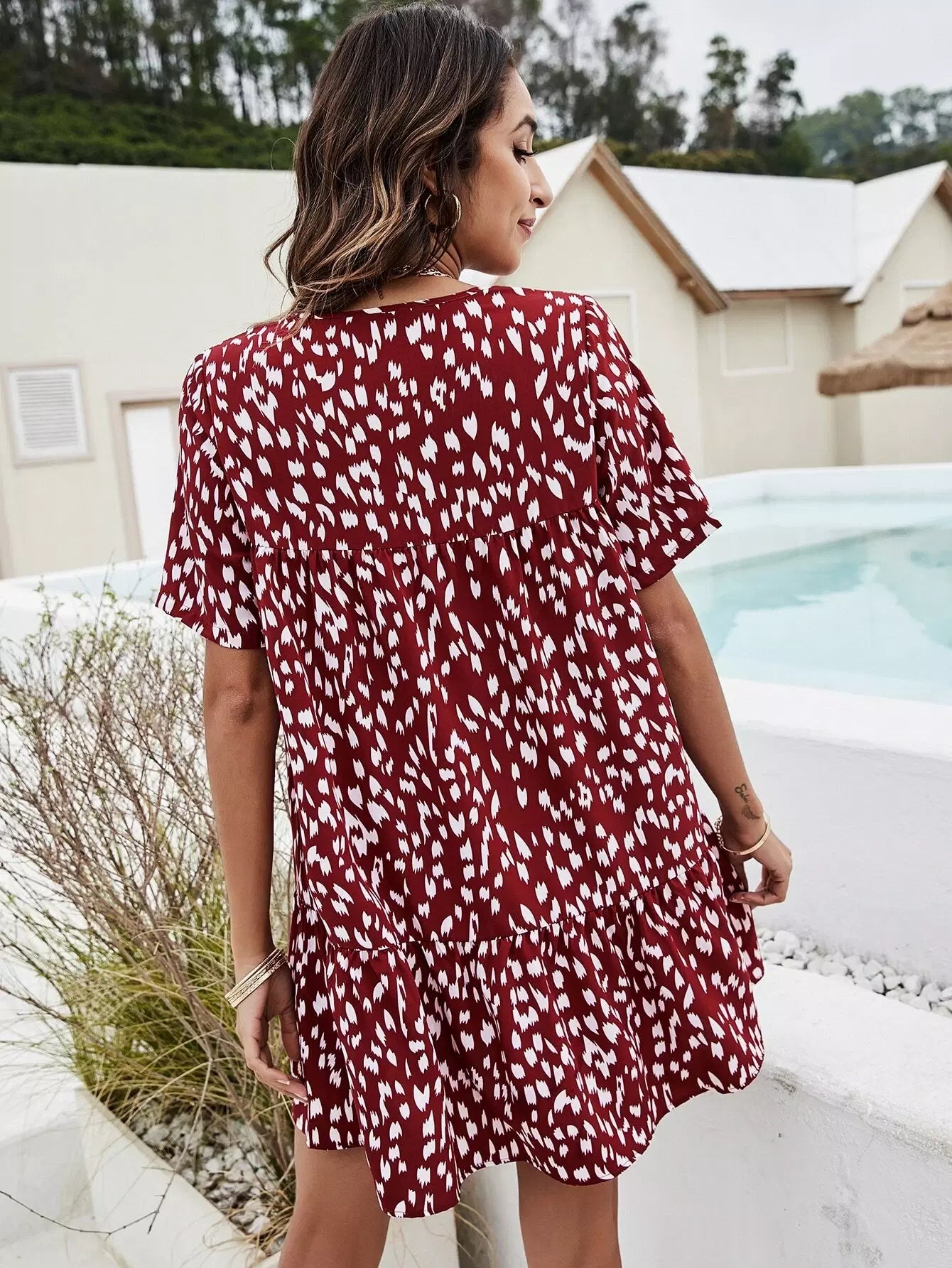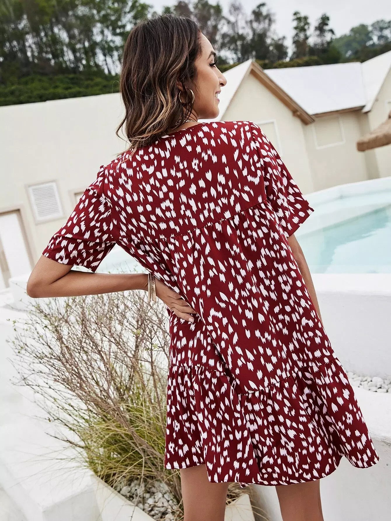 فستان قصير برقبة على شكل حرف V مطبوع بالكامل