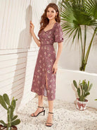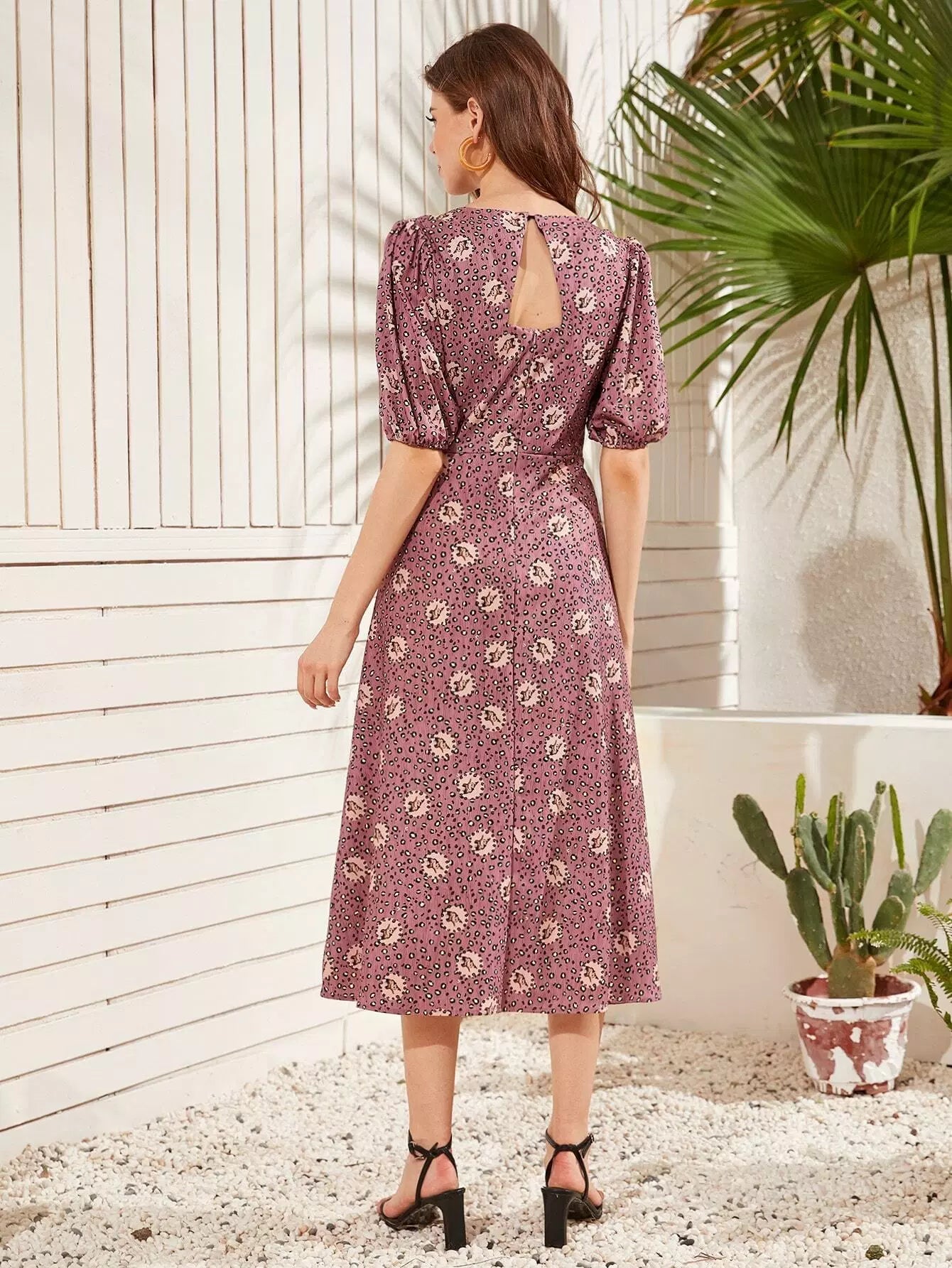 فستان بطبعات حيوانية وأكمام منفوخة وحاشية مقسمة