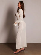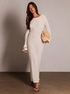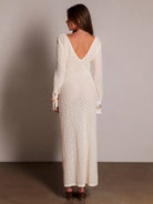 Athal Women's Sheer Crochet Pearl Beaded Longlseeve Maxi Dress, Spring Summer Vacation Occasion