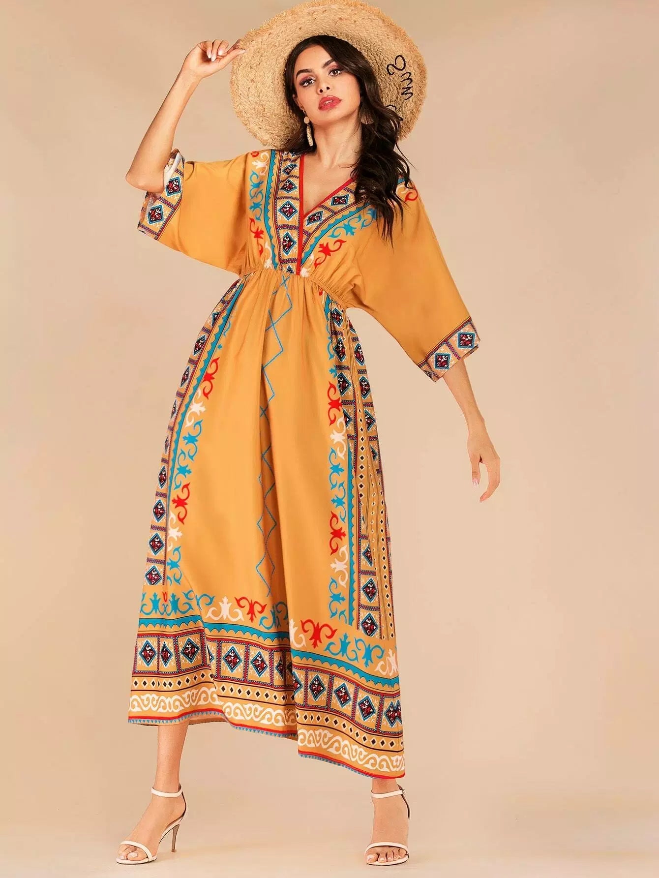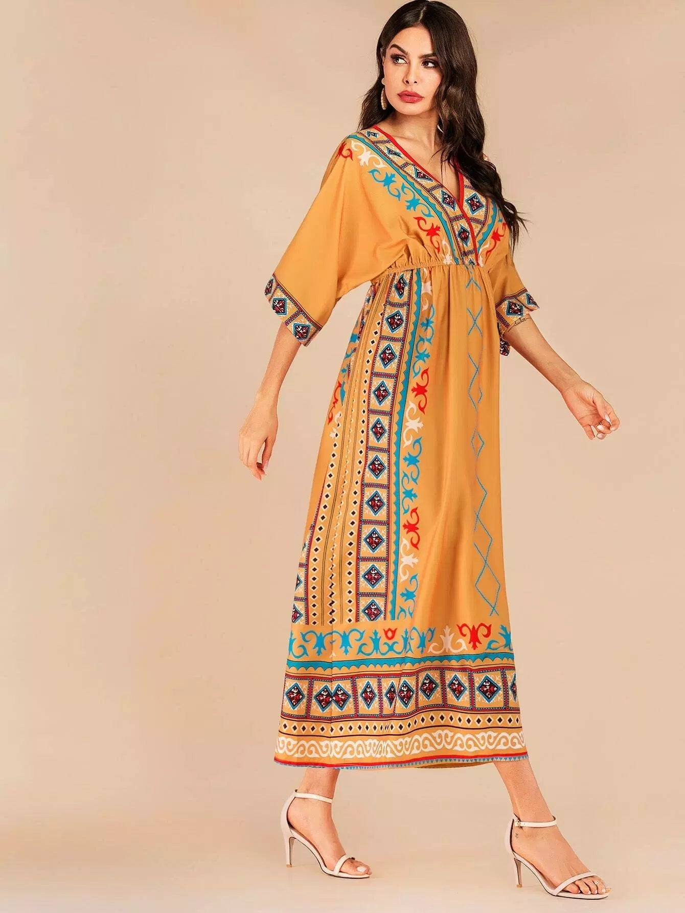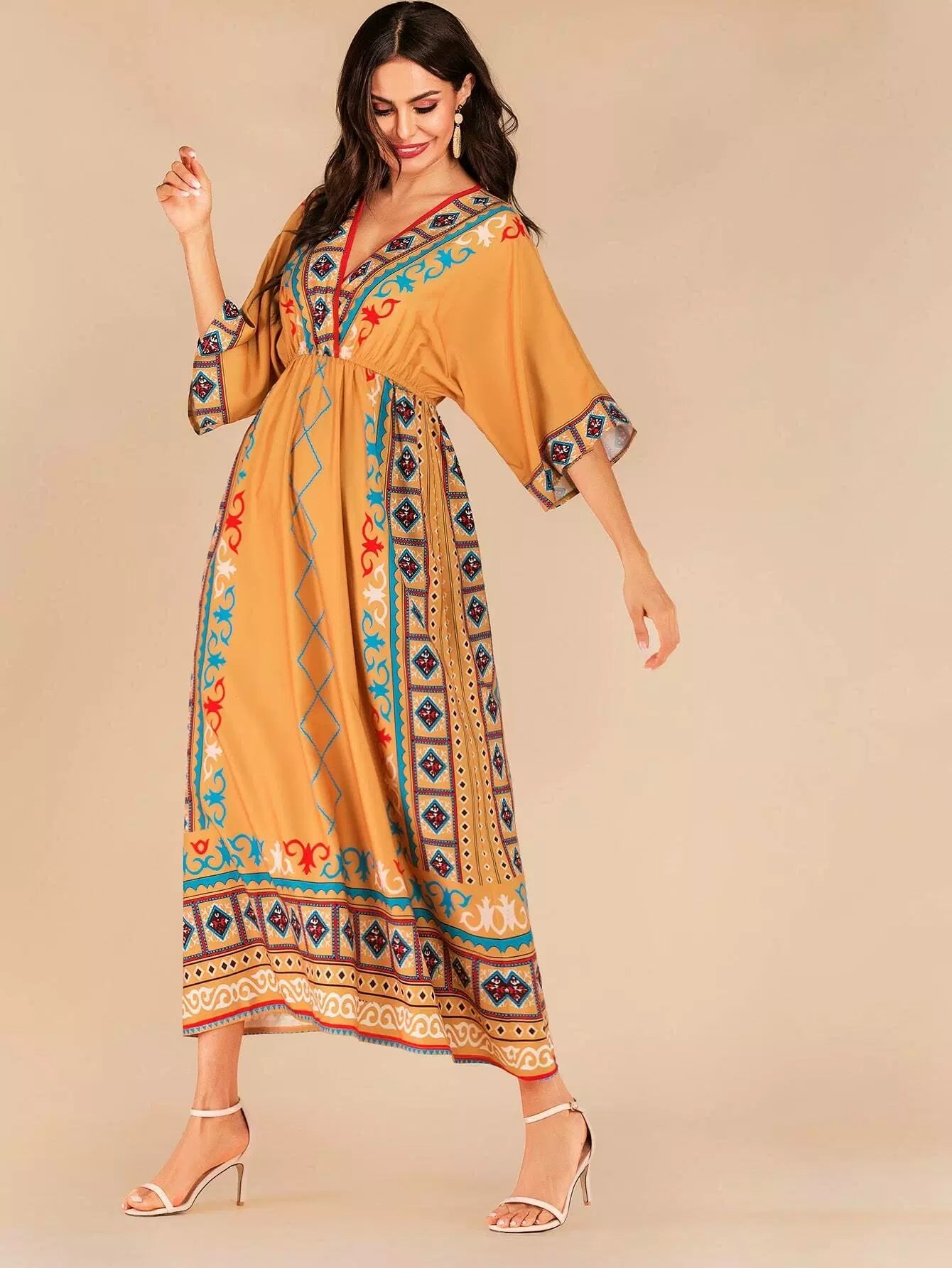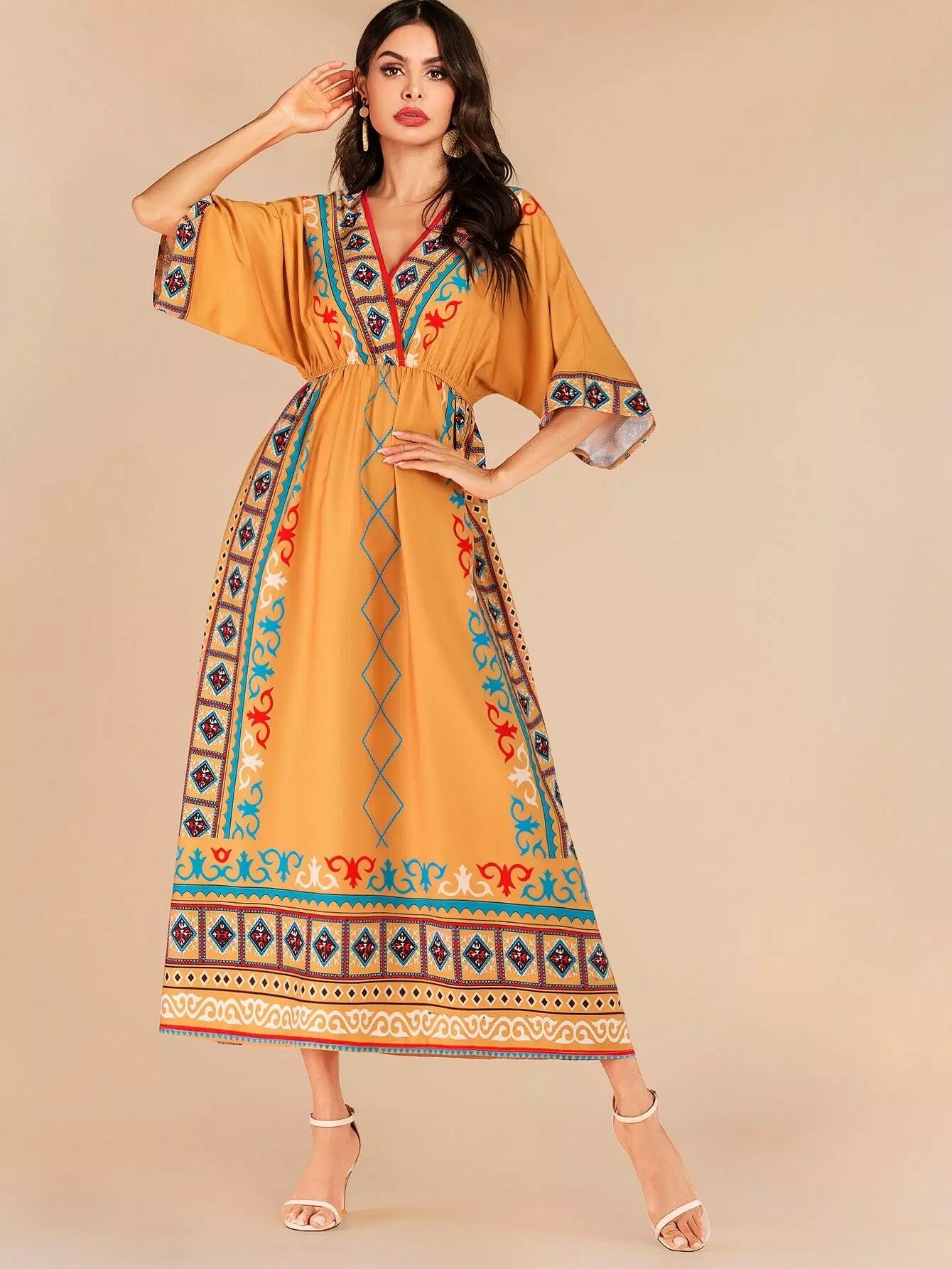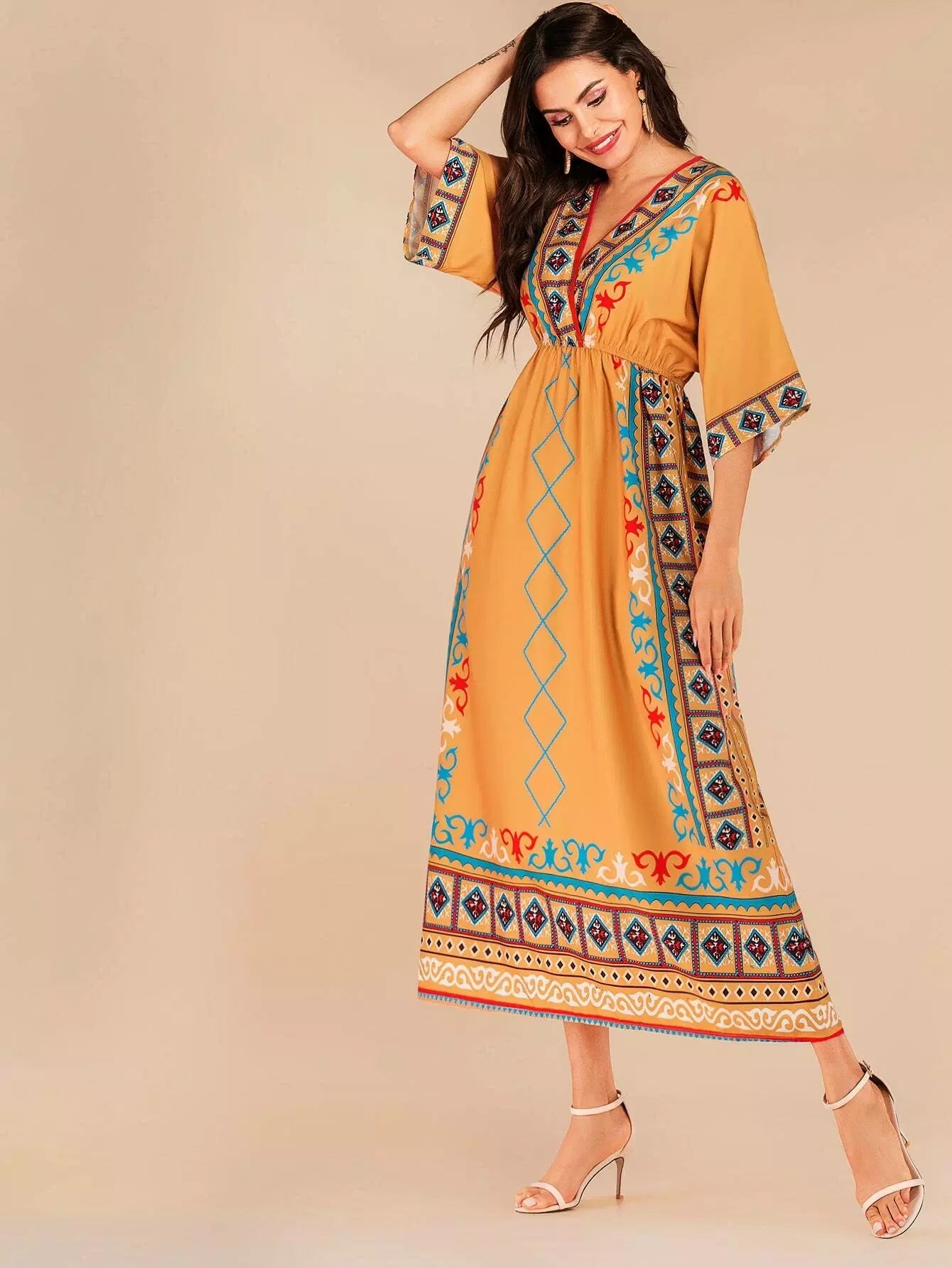 للنساء - فستان طويل بأكمام كيمونو وخصر مطاطي بطباعة أزتيك