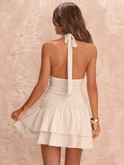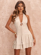 BAE Apricot Sexy Deep V-Neck Halter Bodycon Ruch Asymmetric Ruffle Hem Mini Dress, Knit Dress, Holiday
