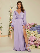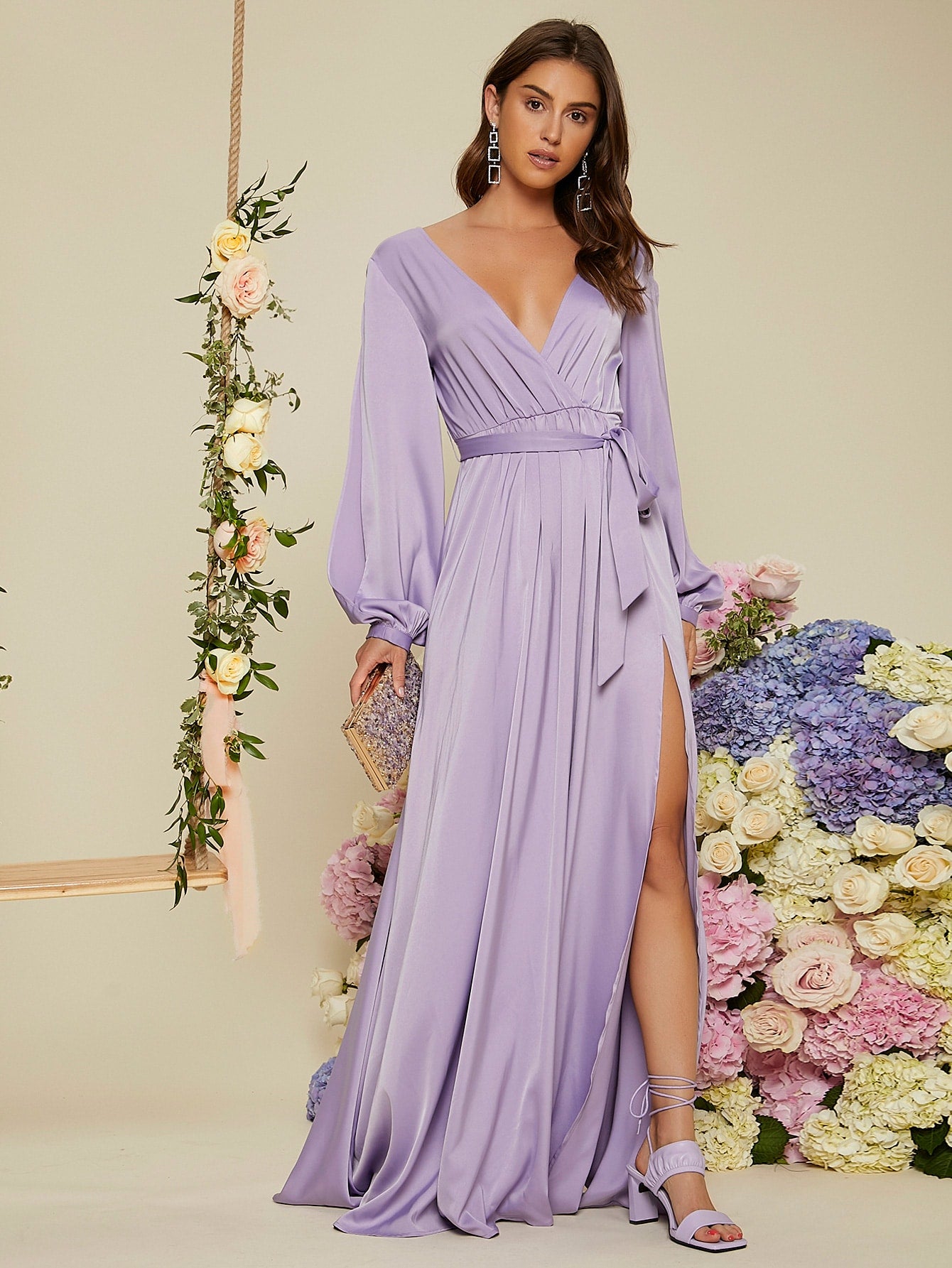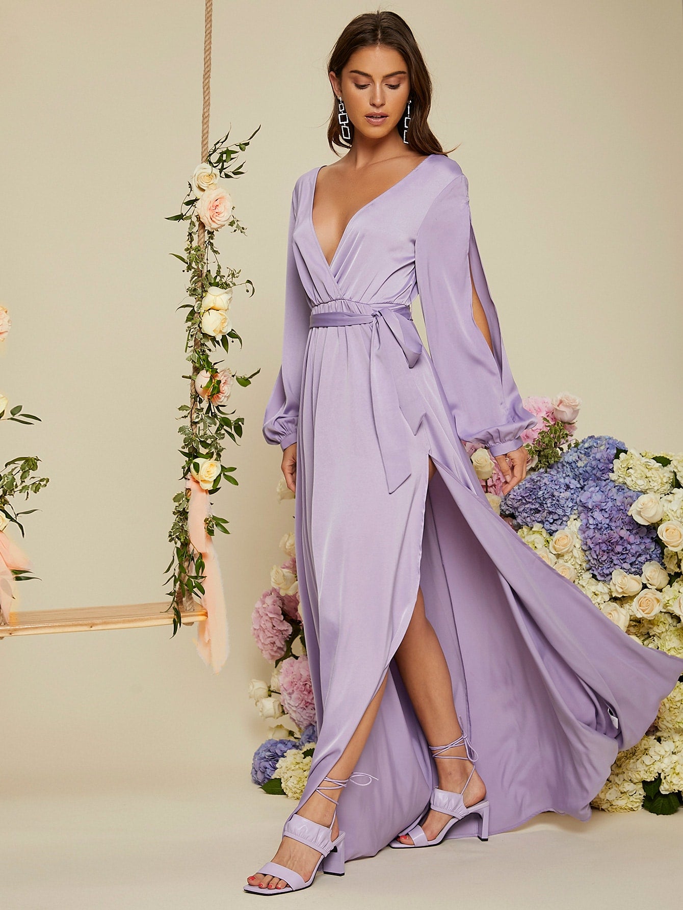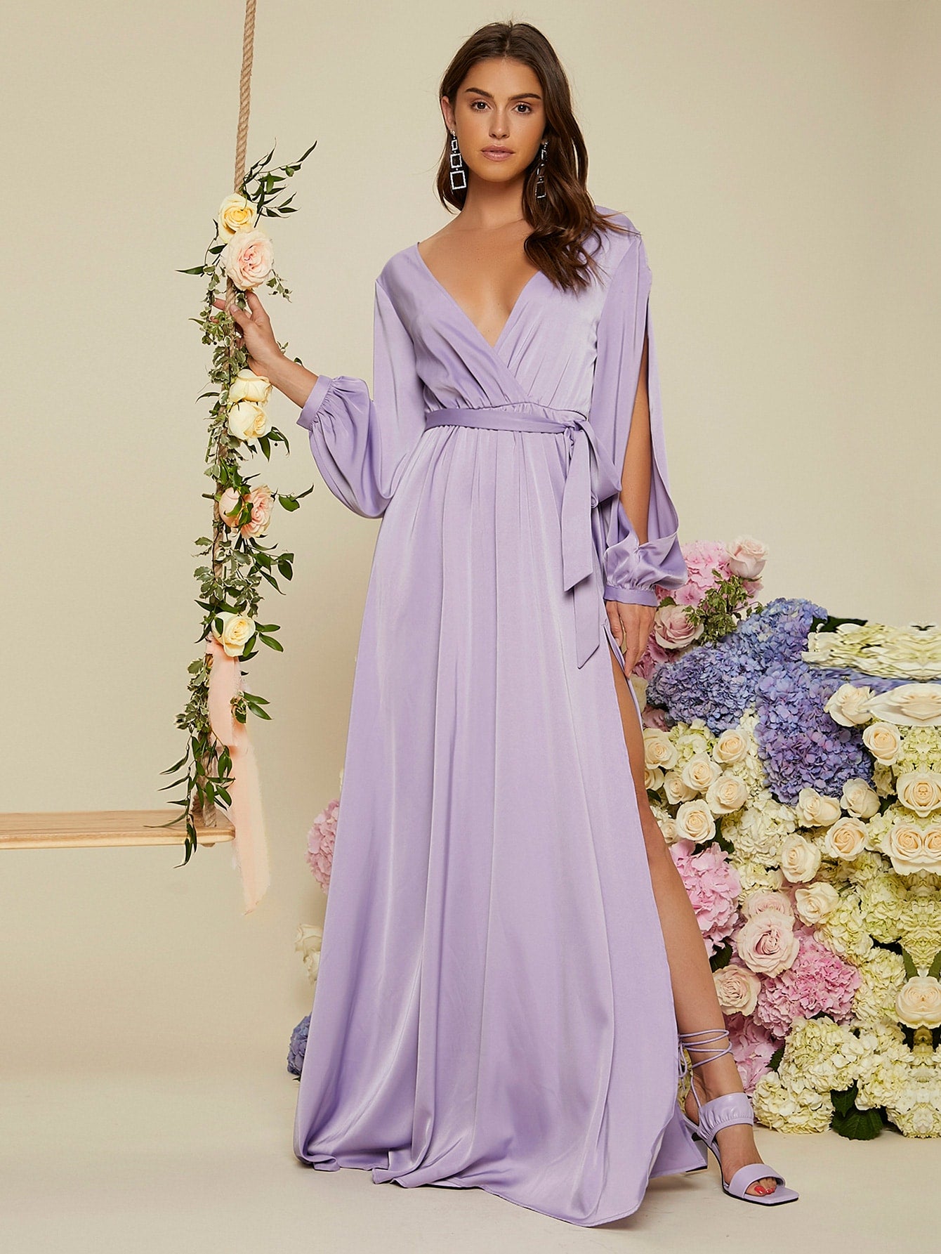 فستان وصيفة العروس ماكسي من Belle بأكمام فانوس وفتحة رقبة على شكل حرف V وفخذ مفتوح بدون حزام