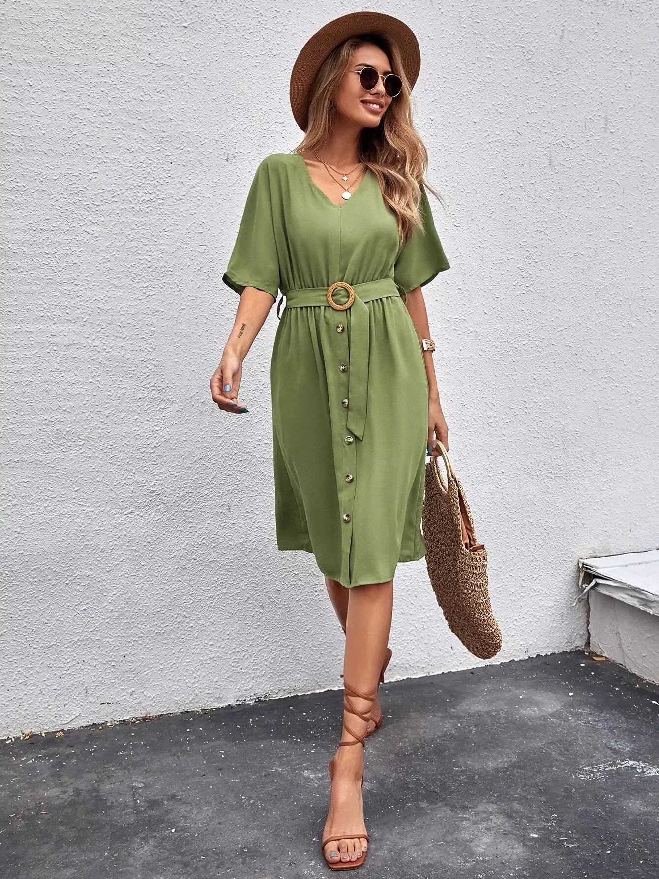 فستان بأكمام جناح الخفاش وأزرار أمامية بدون حزام