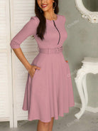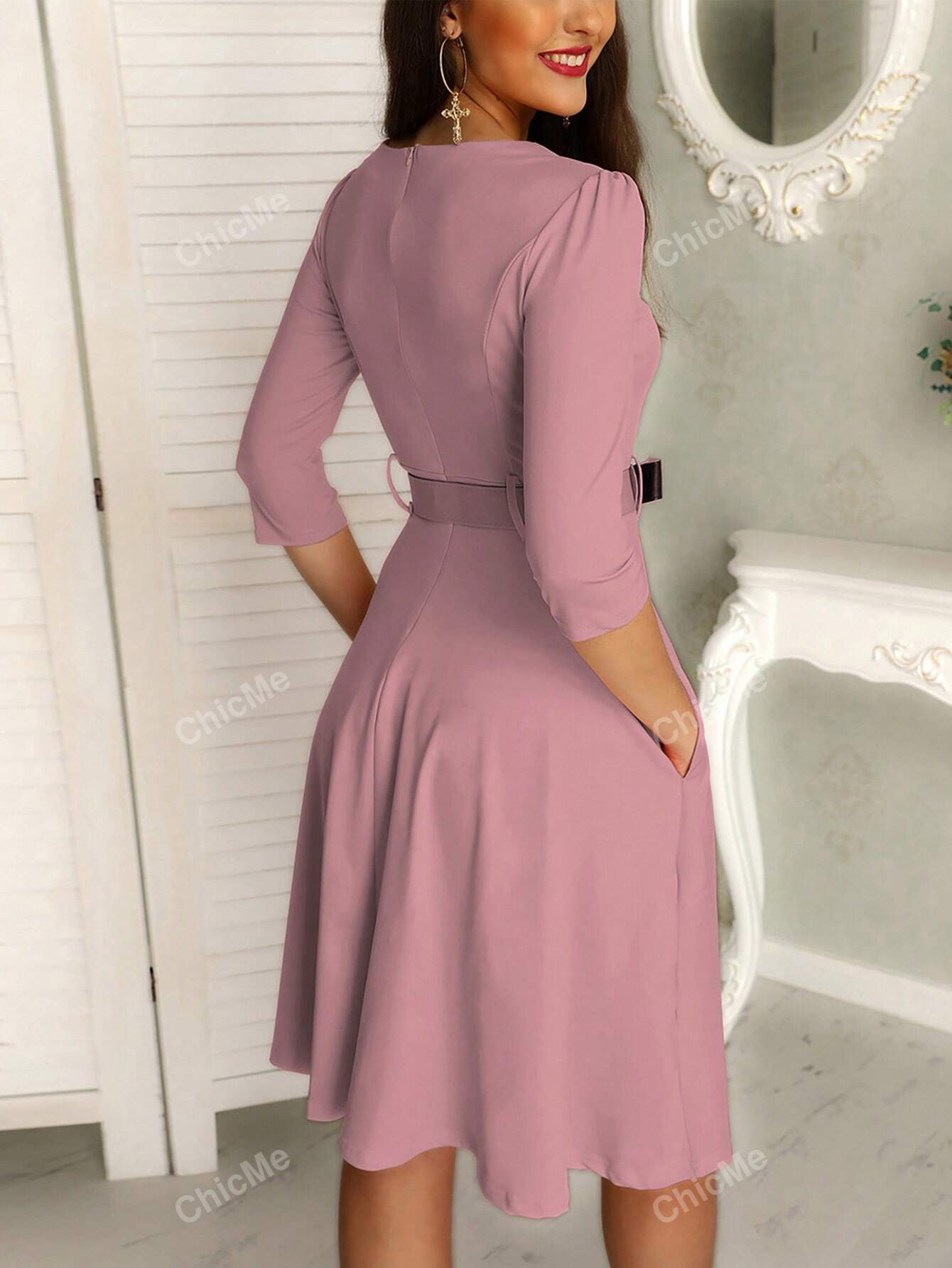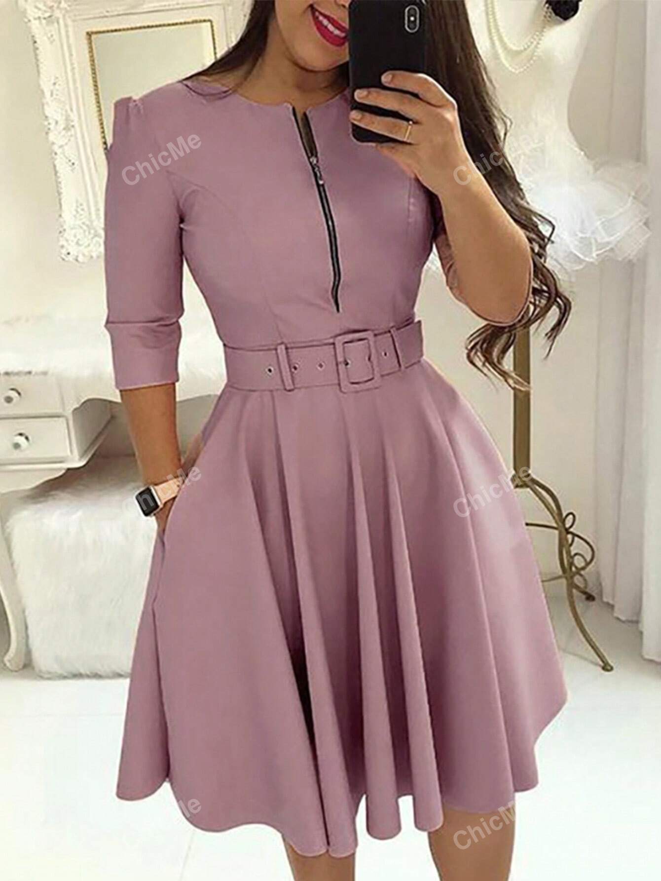 فستان ChicMe متوسط الطول بنصف كم وسحاب أمامي ورقبة دائرية وقصة ضيقة وتصميم بسيط وأنيق بدون حزام
