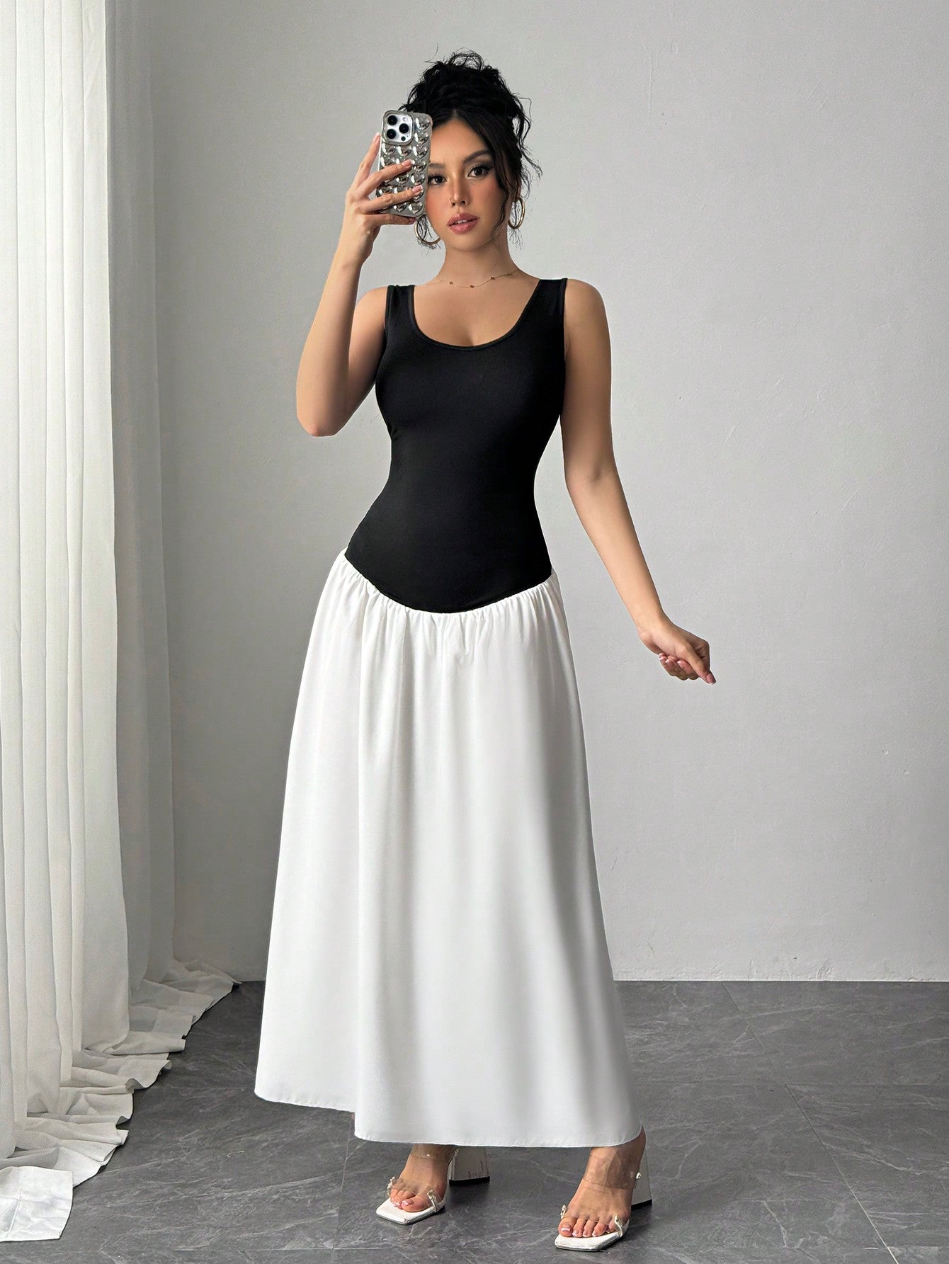 Chiquease Elegant Sleeveless Patchwork Black And White Dress For Women