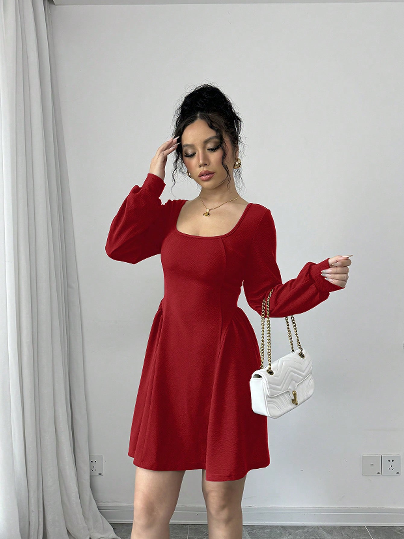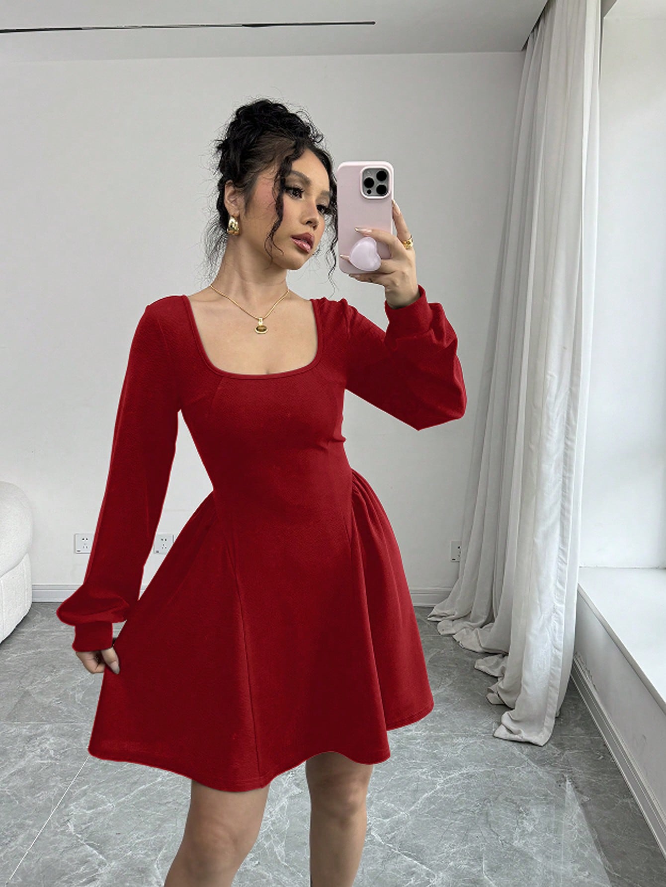 Chiquease Square Neck Cinched Waist Two Side Ruched A-Line Long Sleeve Mini Dress