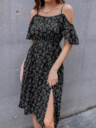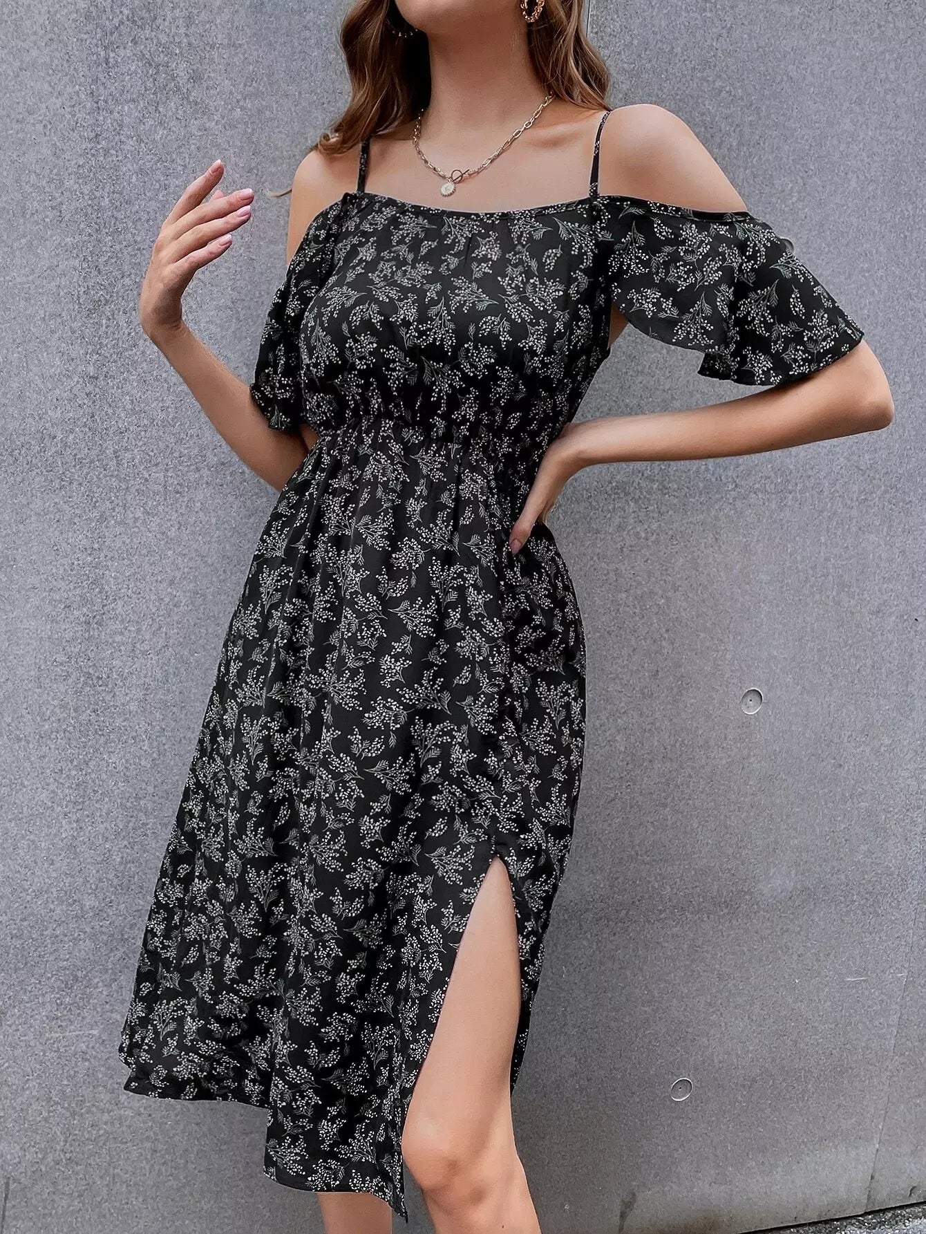 فستان بأكتاف باردة مزين بالورود بالكامل