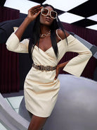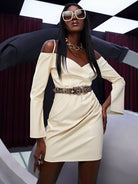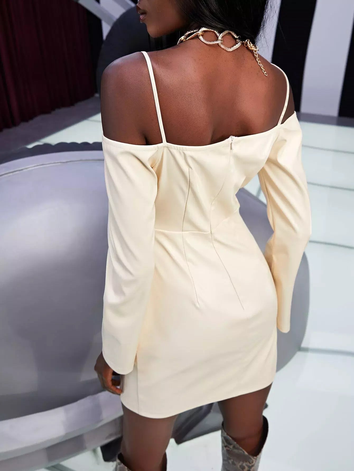 فستان من جلد البولي يوريثان مطوي على الأكتاف الباردة مطوي بطيات من الجلد