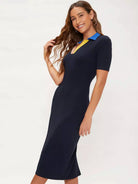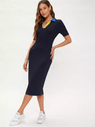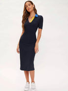 فستان محبوك بفتحة ظهر وياقة متباينة