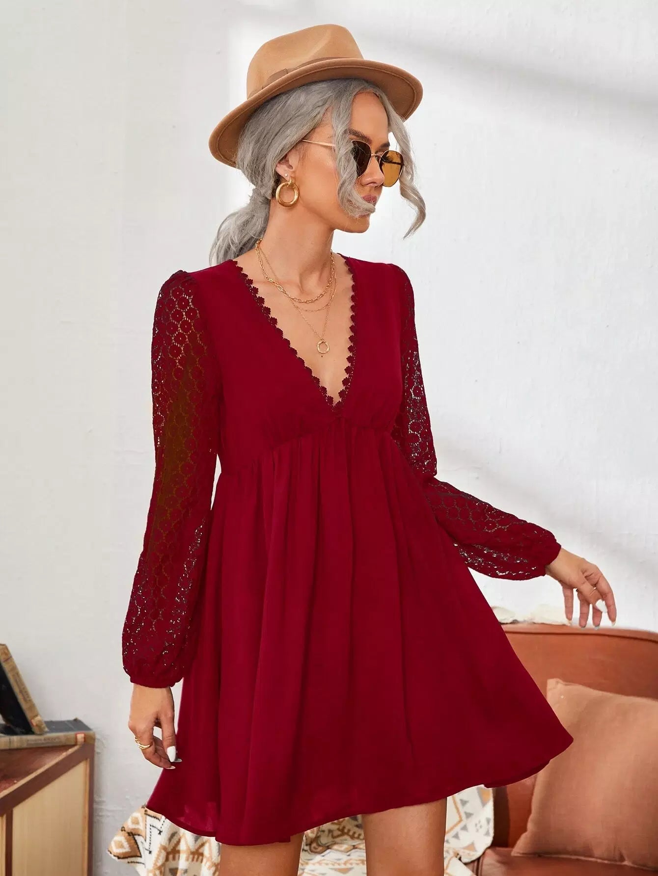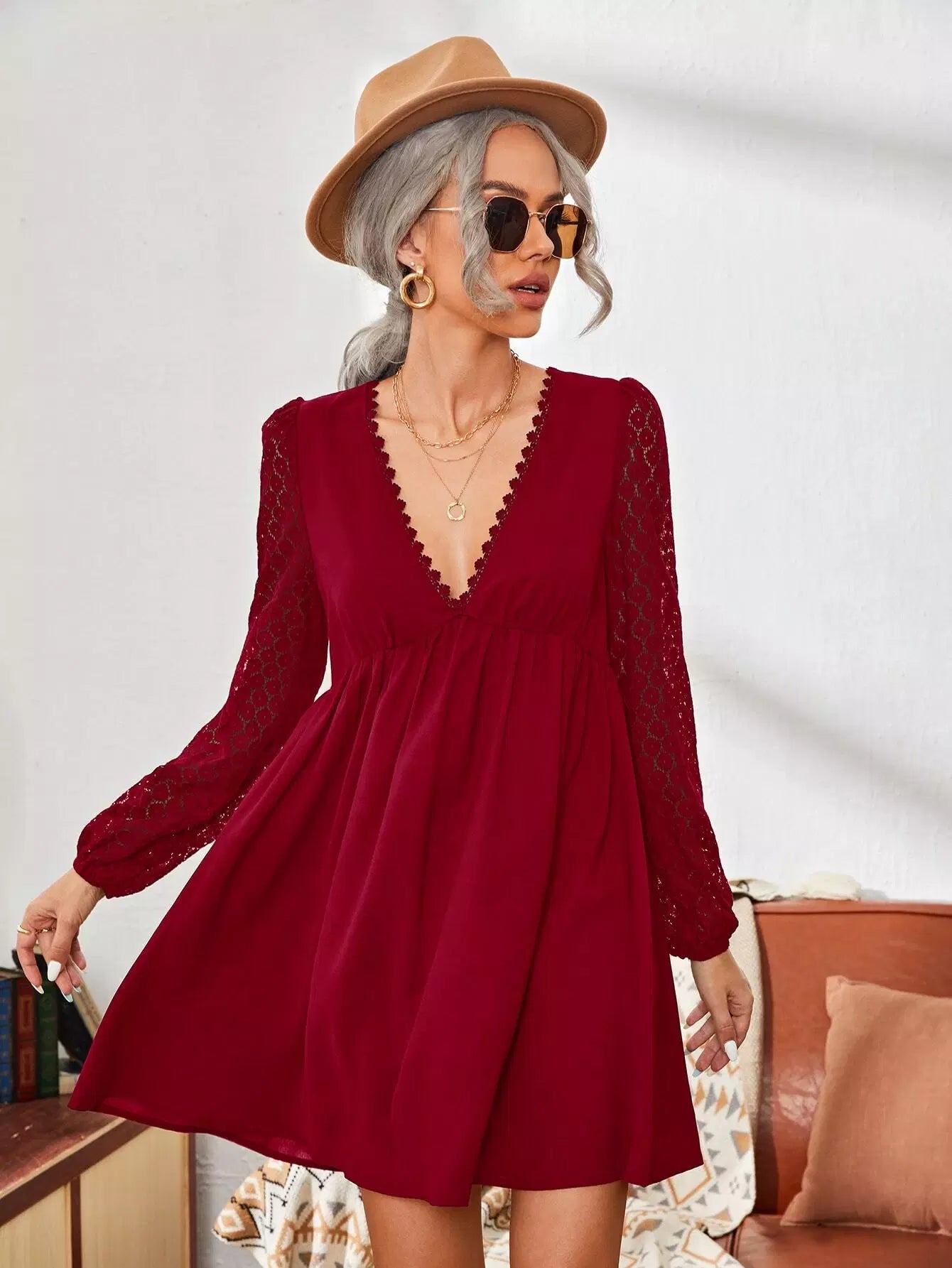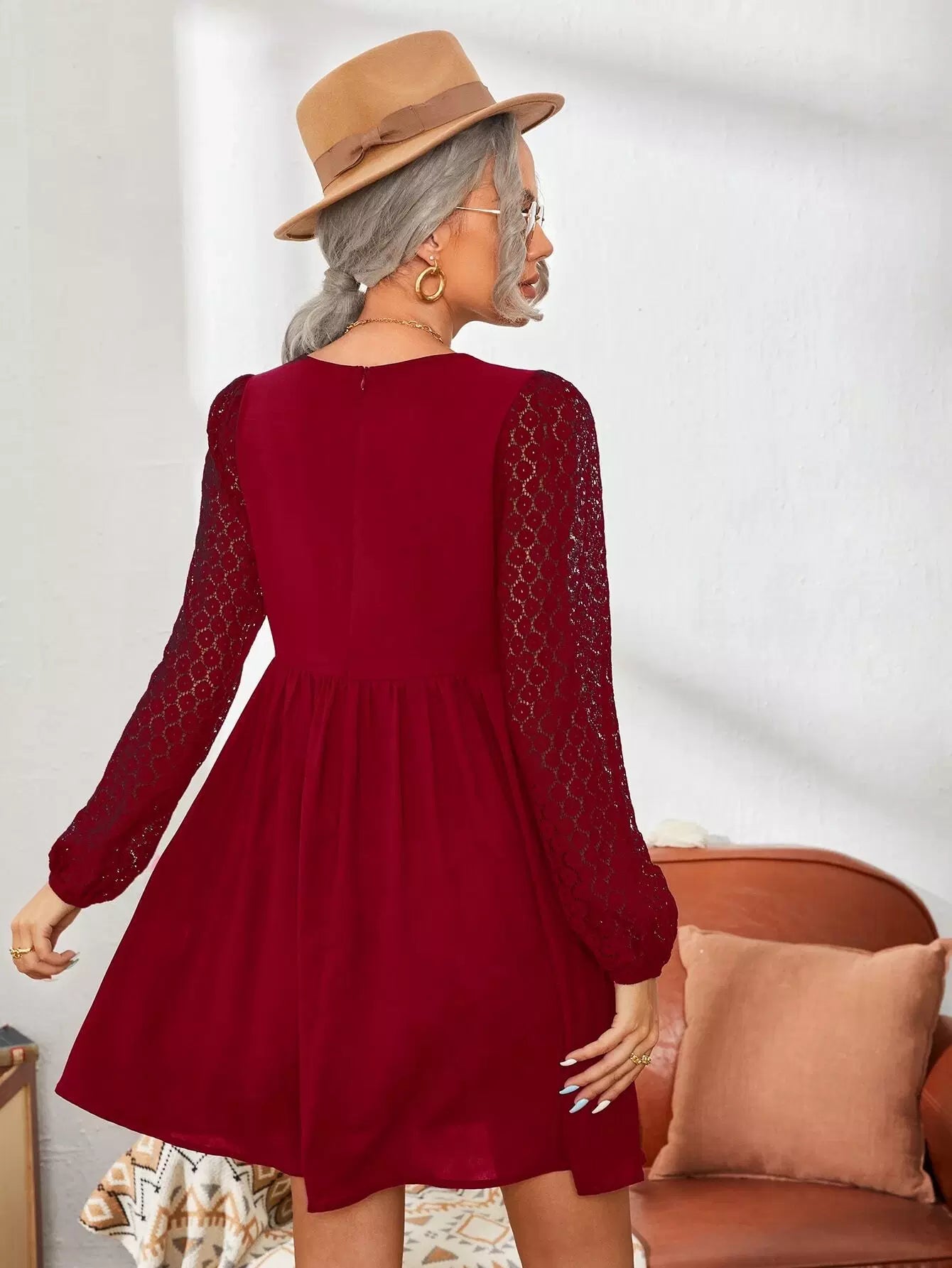 للنساء - فستان سموك بأكمام فانوس من الدانتيل المتباين