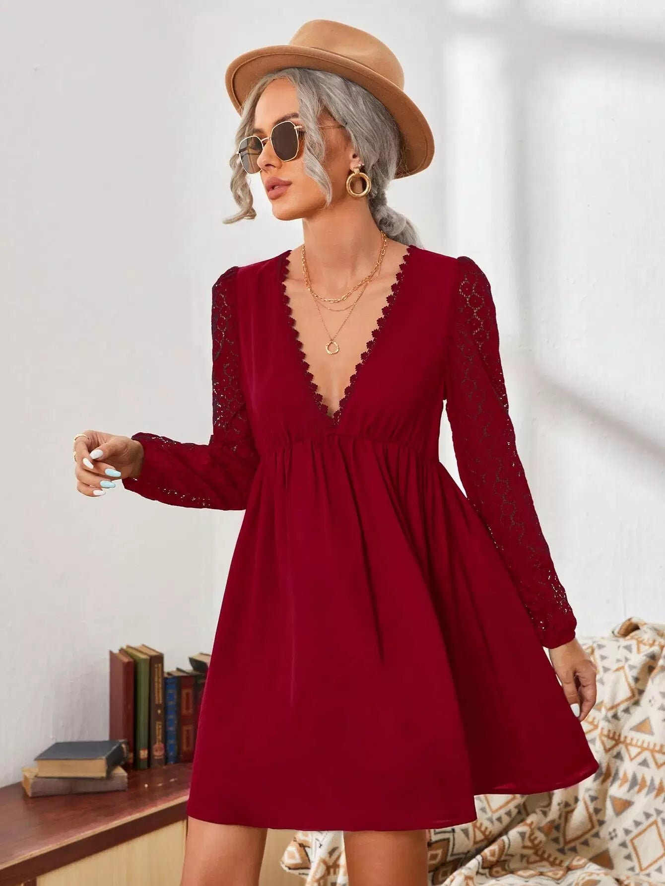 فستان بأكمام من الدانتيل بلون مغاير بأكمام من الدانتيل