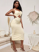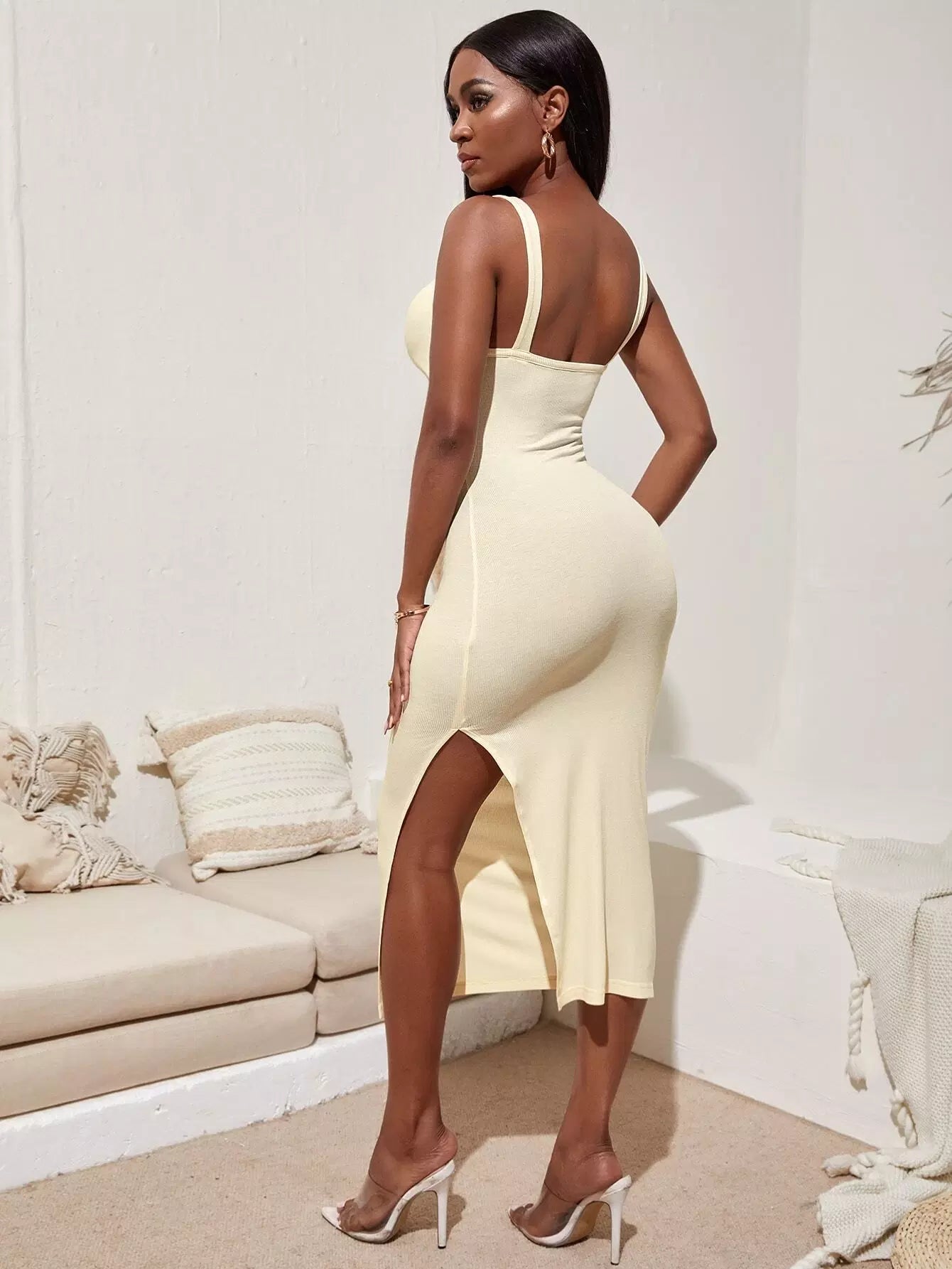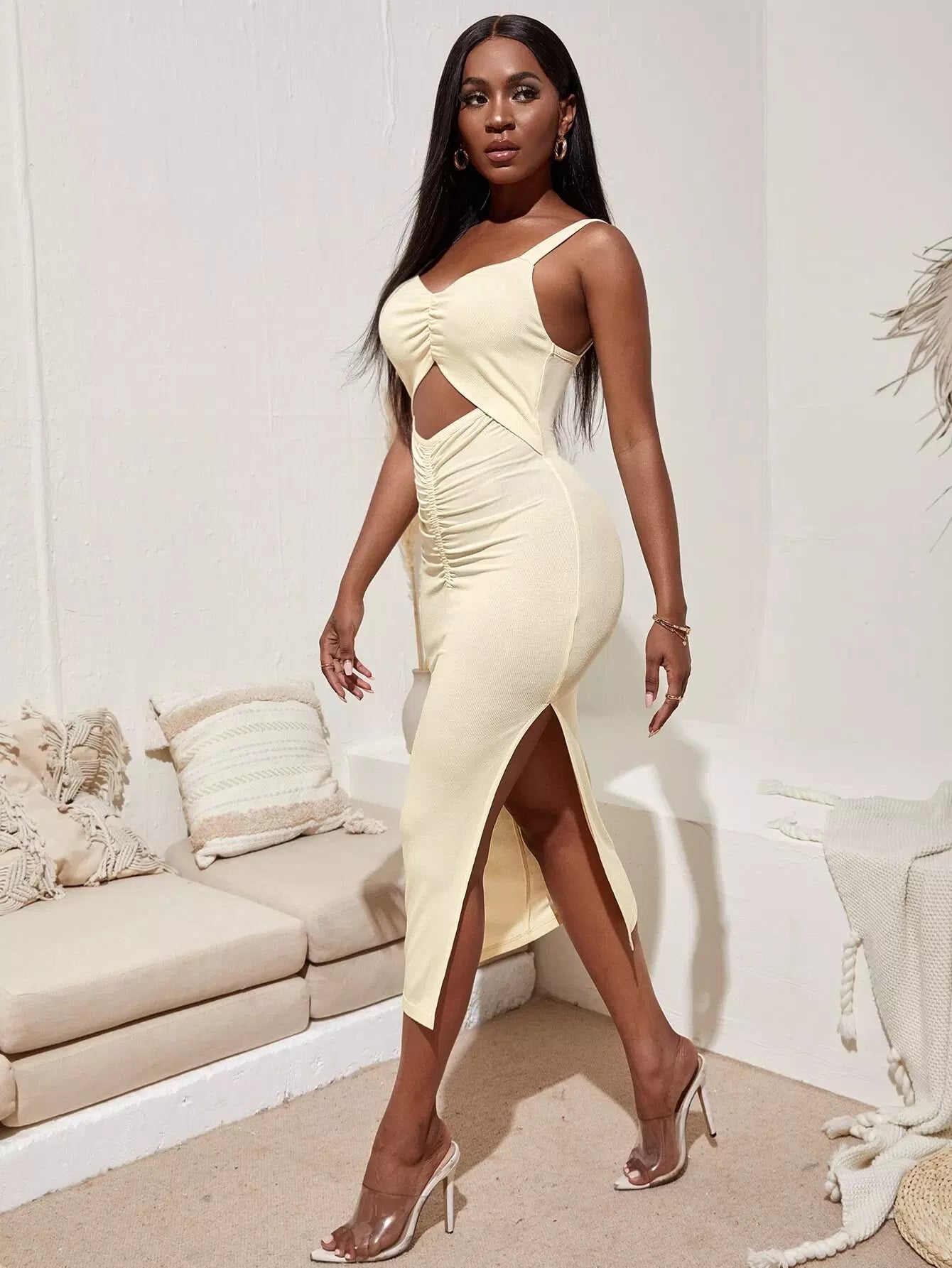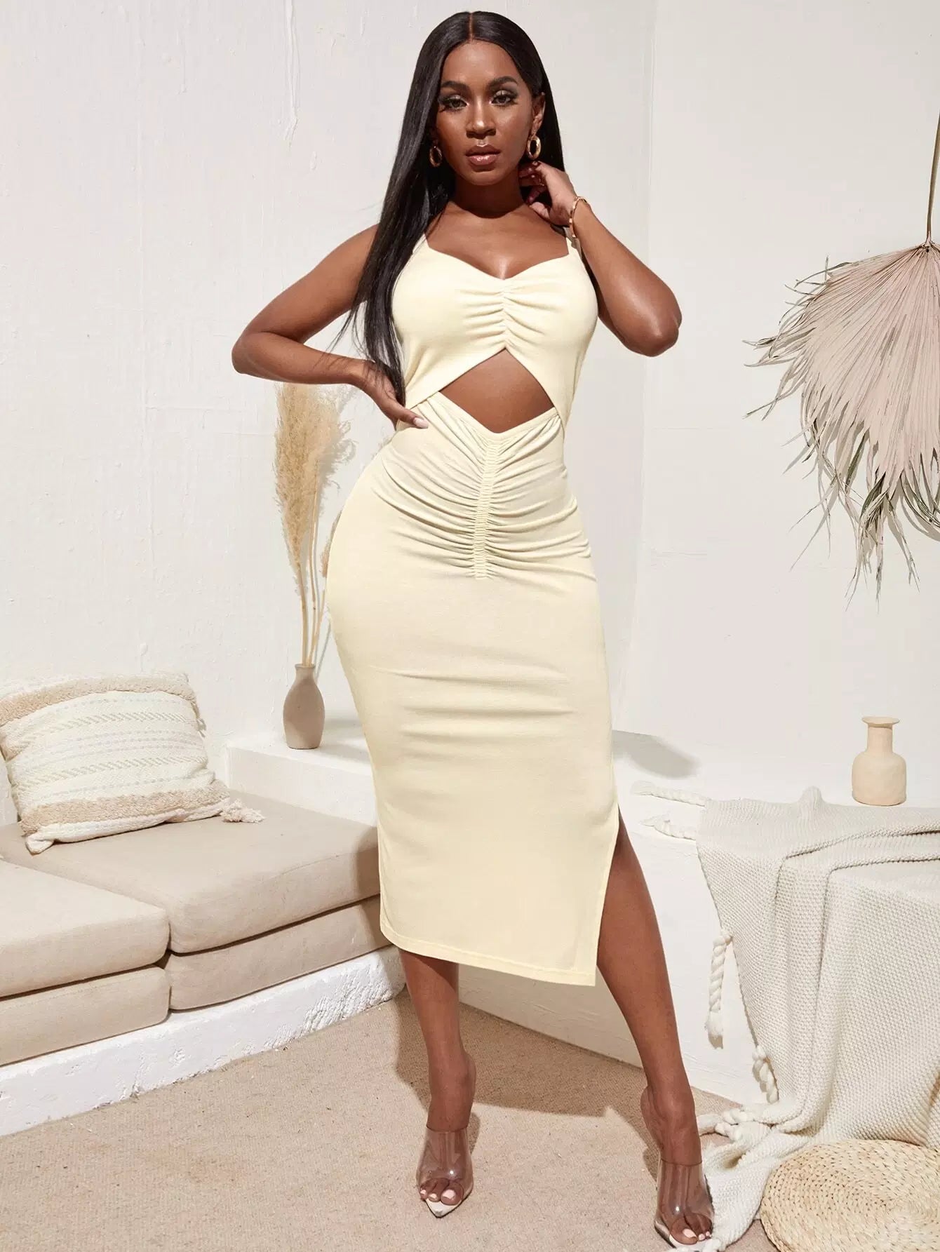 فستان كامي بفتحة أمامية مكشكشة وفتحة جانبية