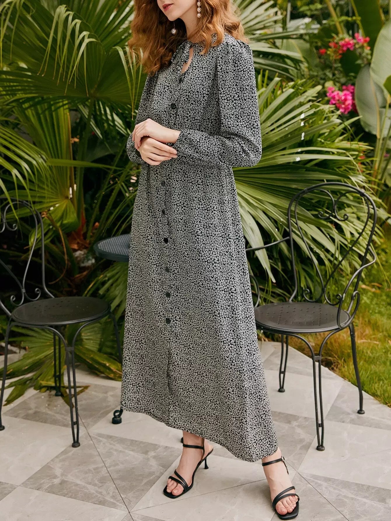 فستان ديتسي بطبعة زهور مطبوع بربطة عنق مزينة بأزرار
