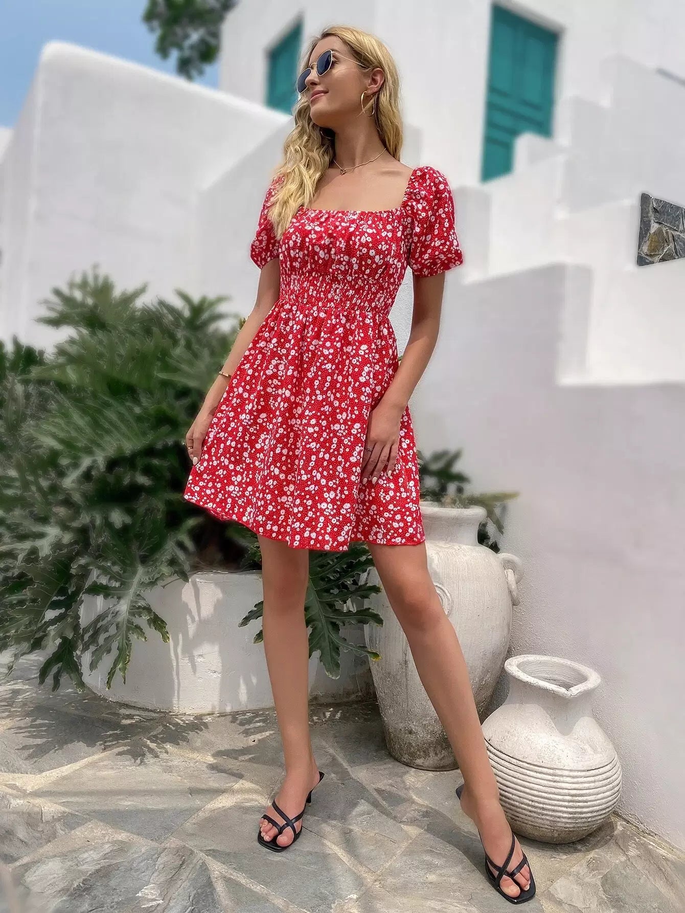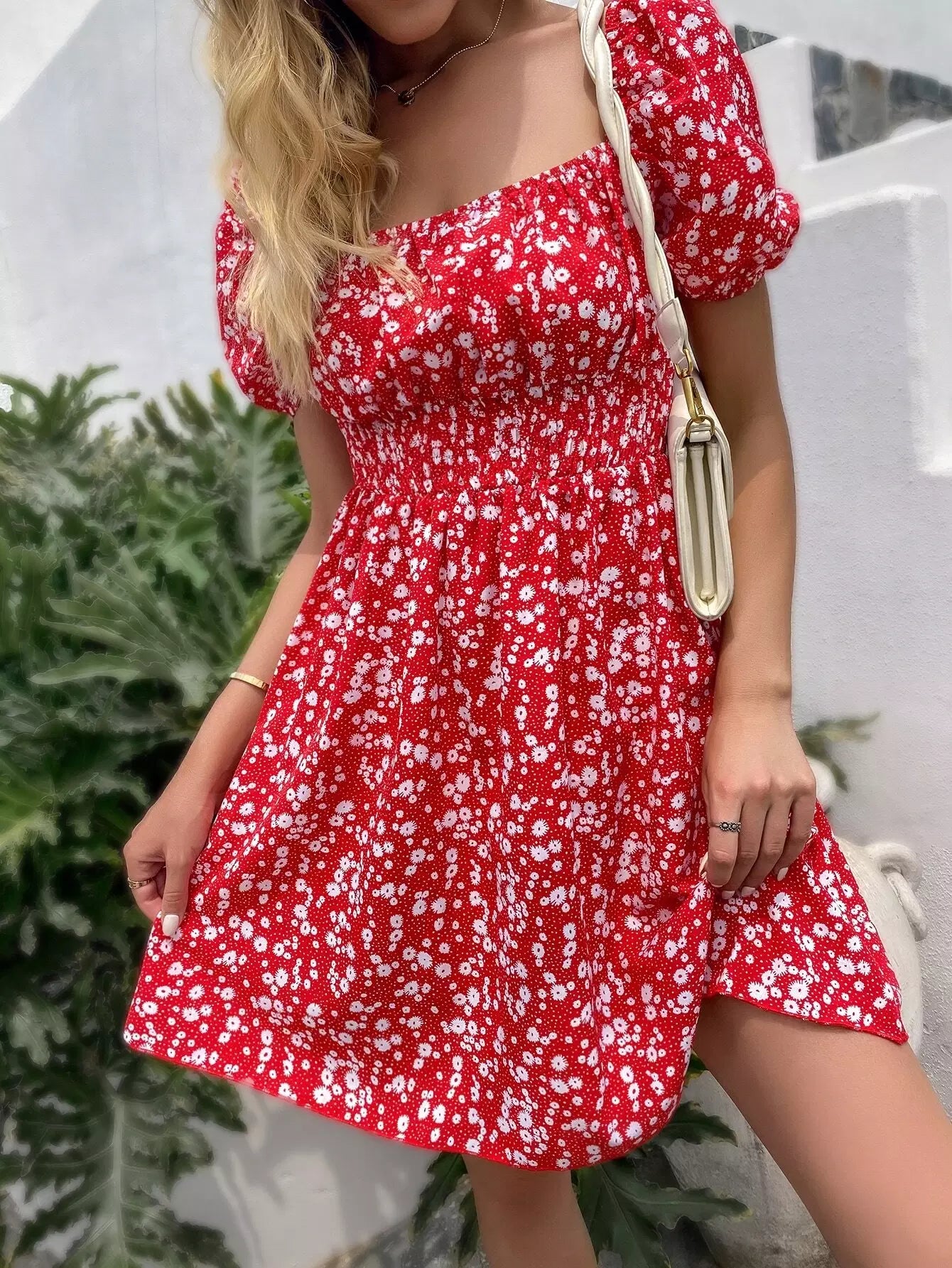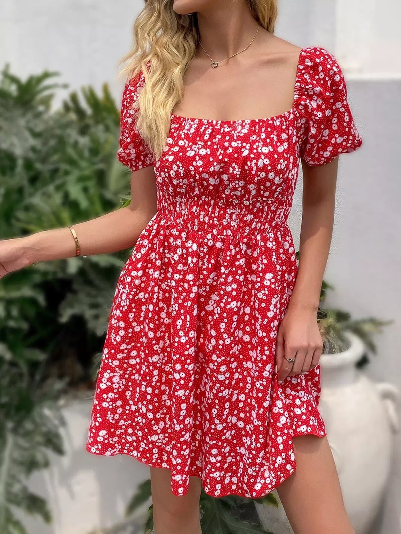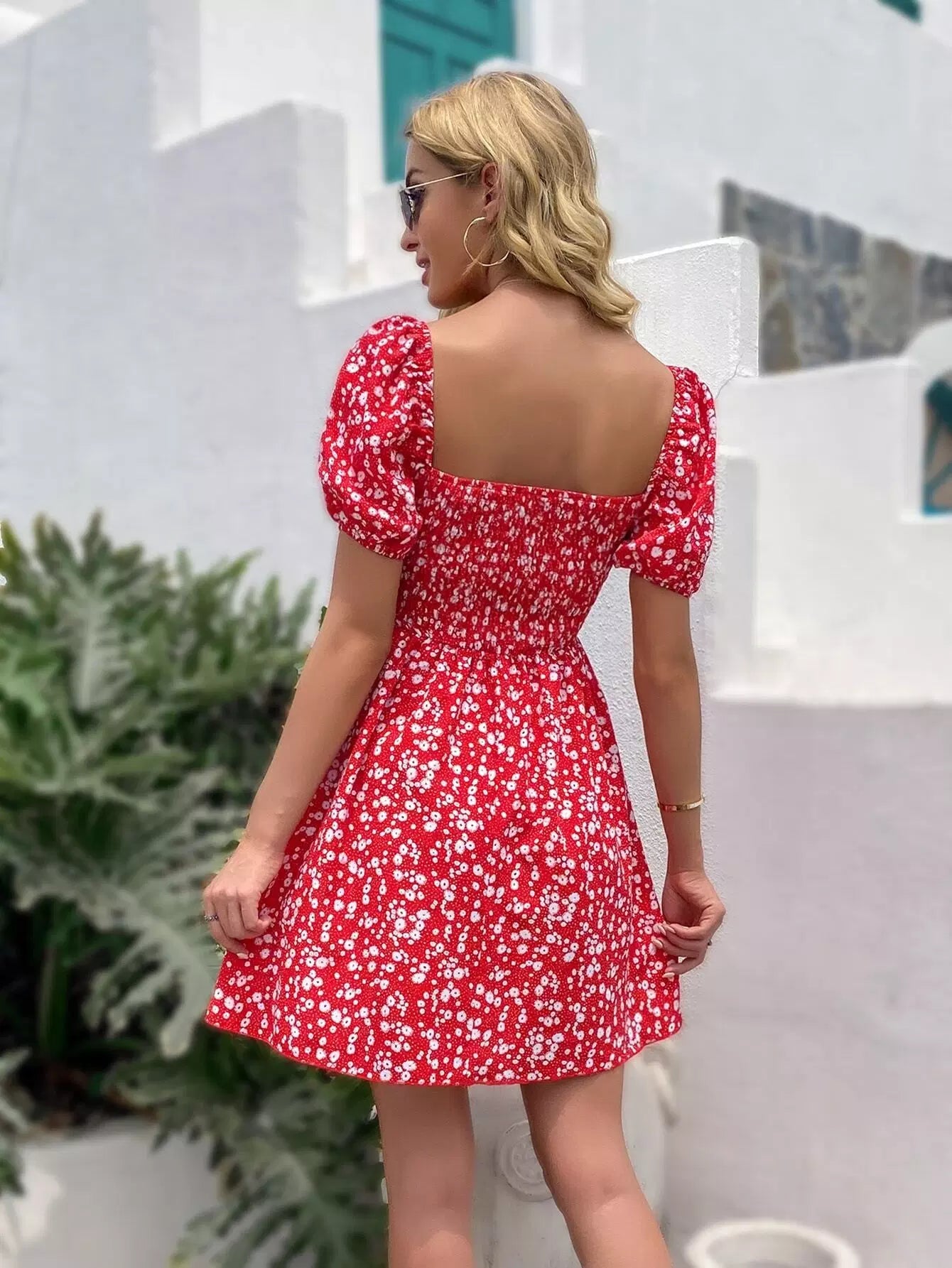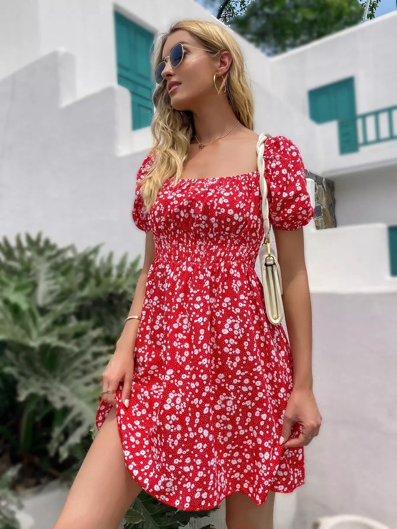 فستان بياقة مربعة برقبة مربعة مزين بالورود
