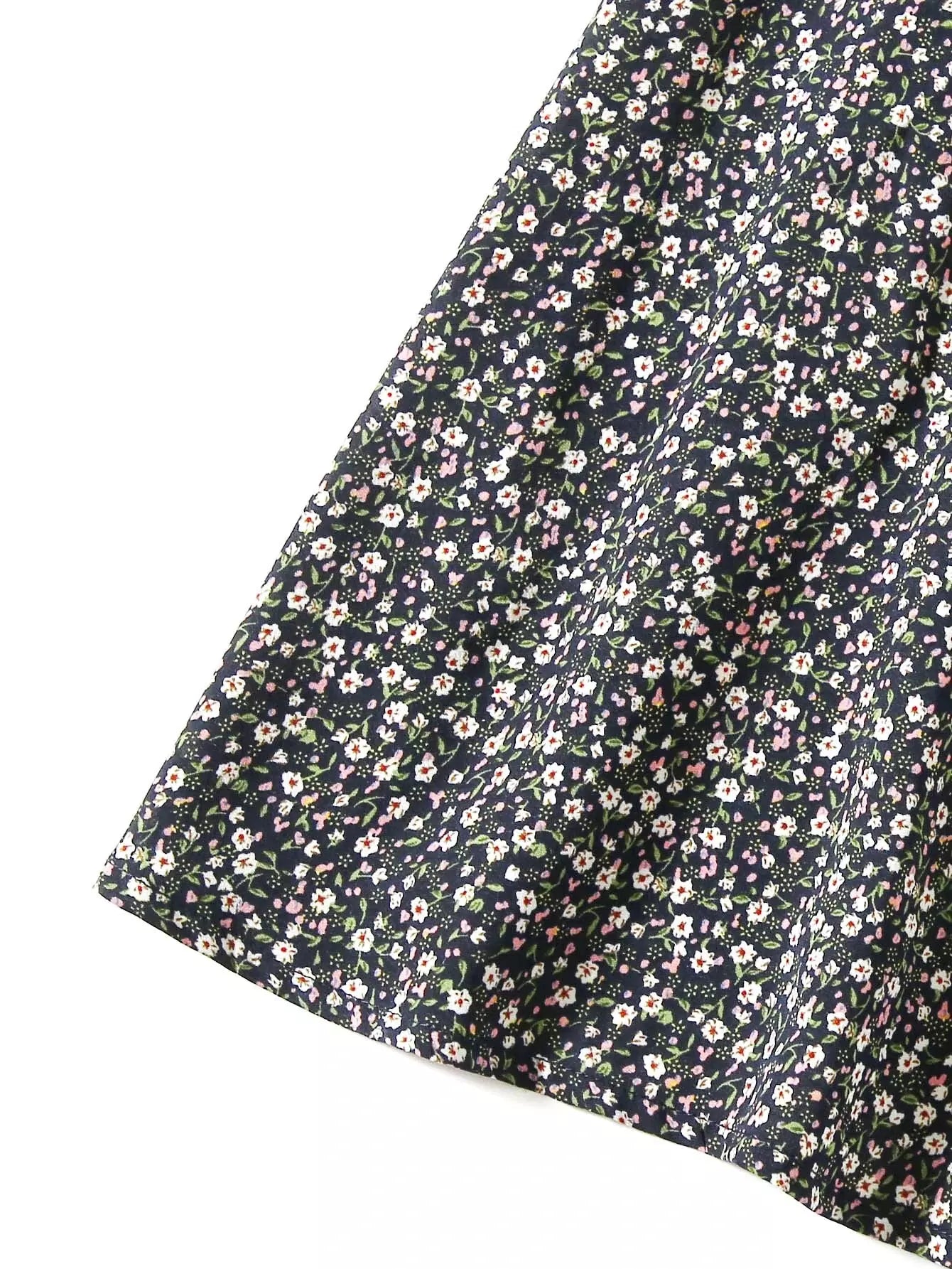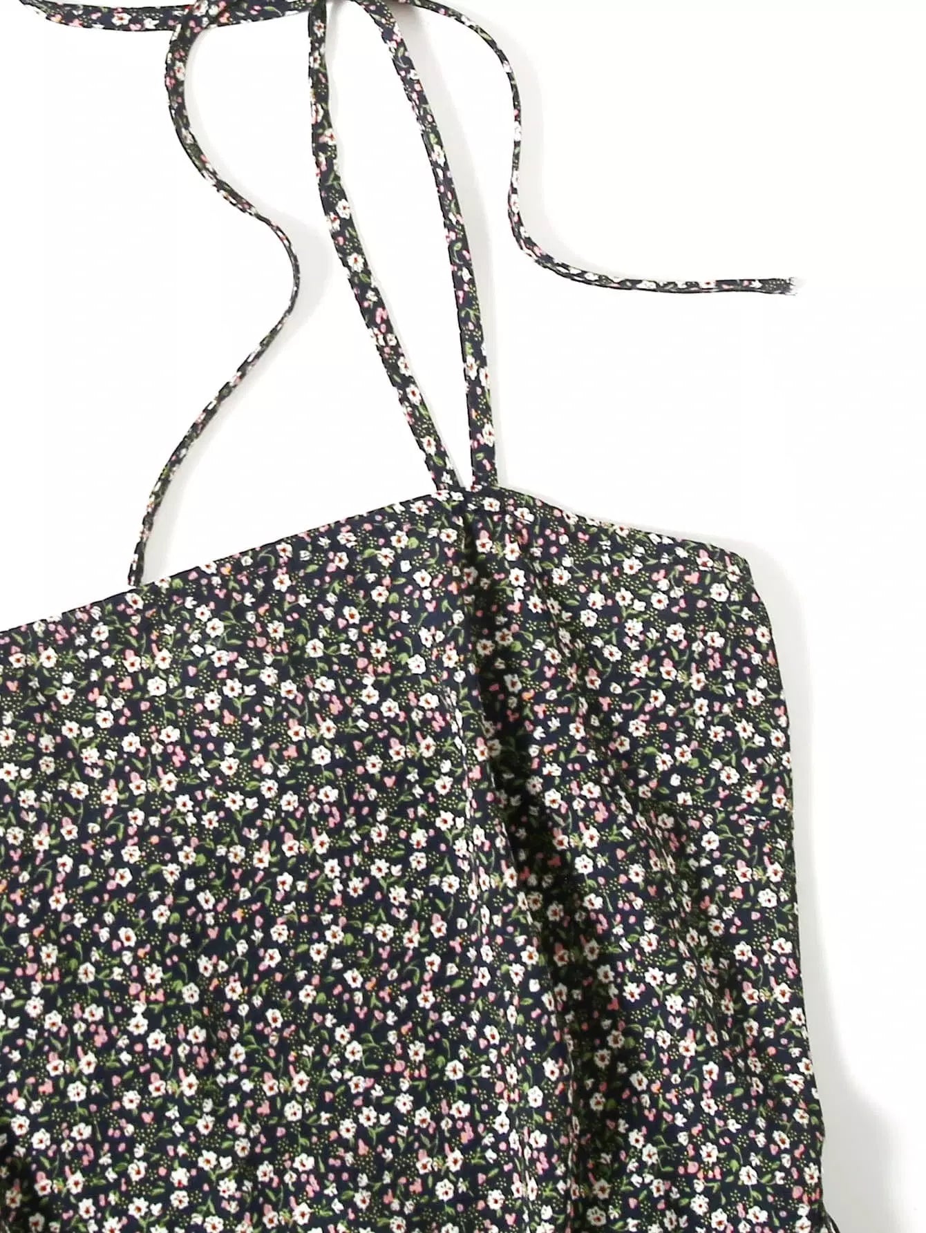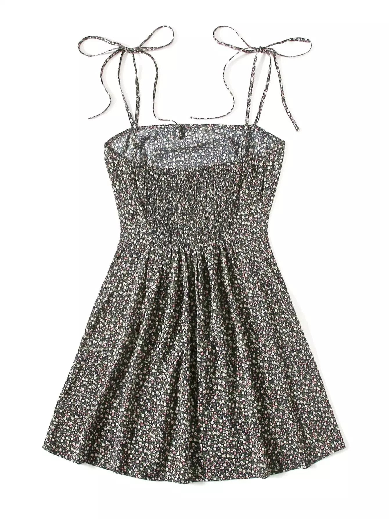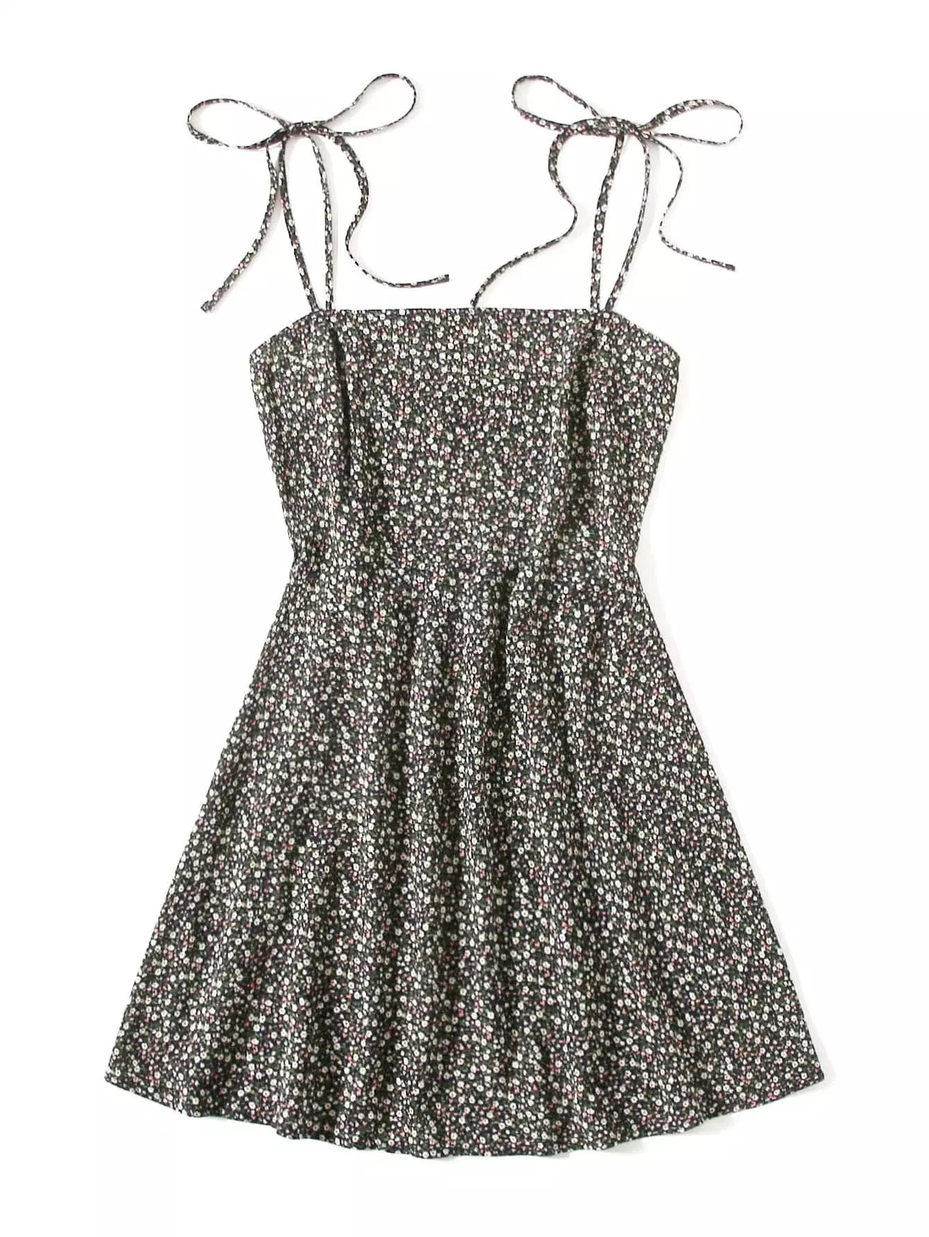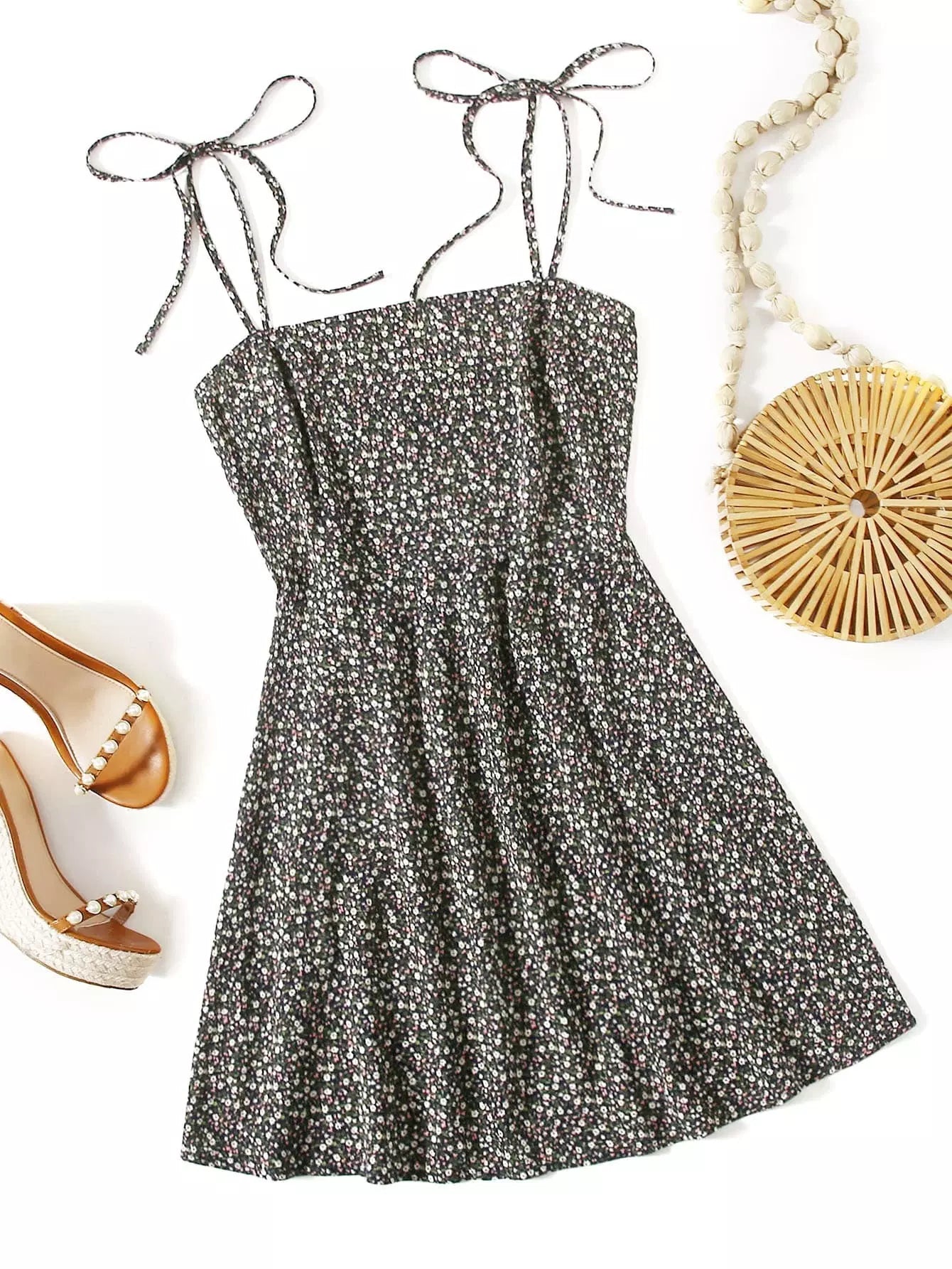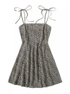 فستان كامي مزين بزهور صغيرة مع رباط على الكتف وتفاصيل مجعدة