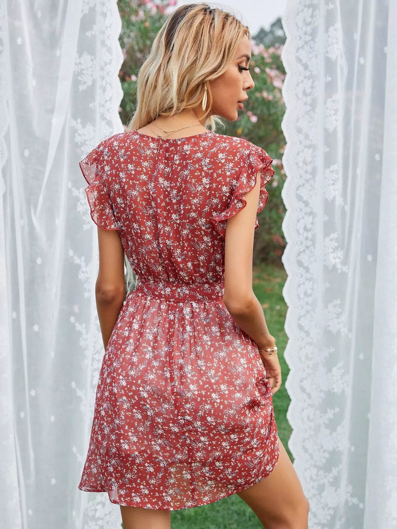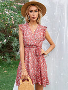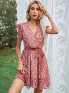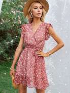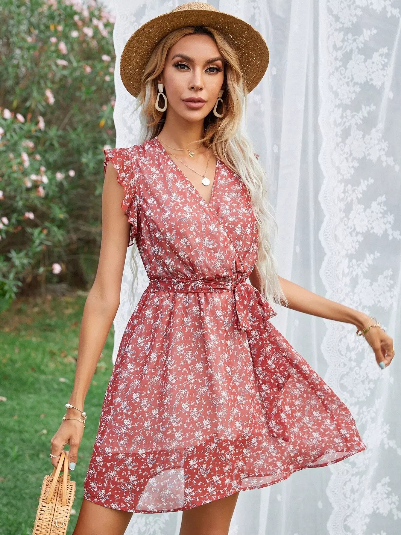 للنساء - فستان بحزام على شكل حرف V مزين بالزهور