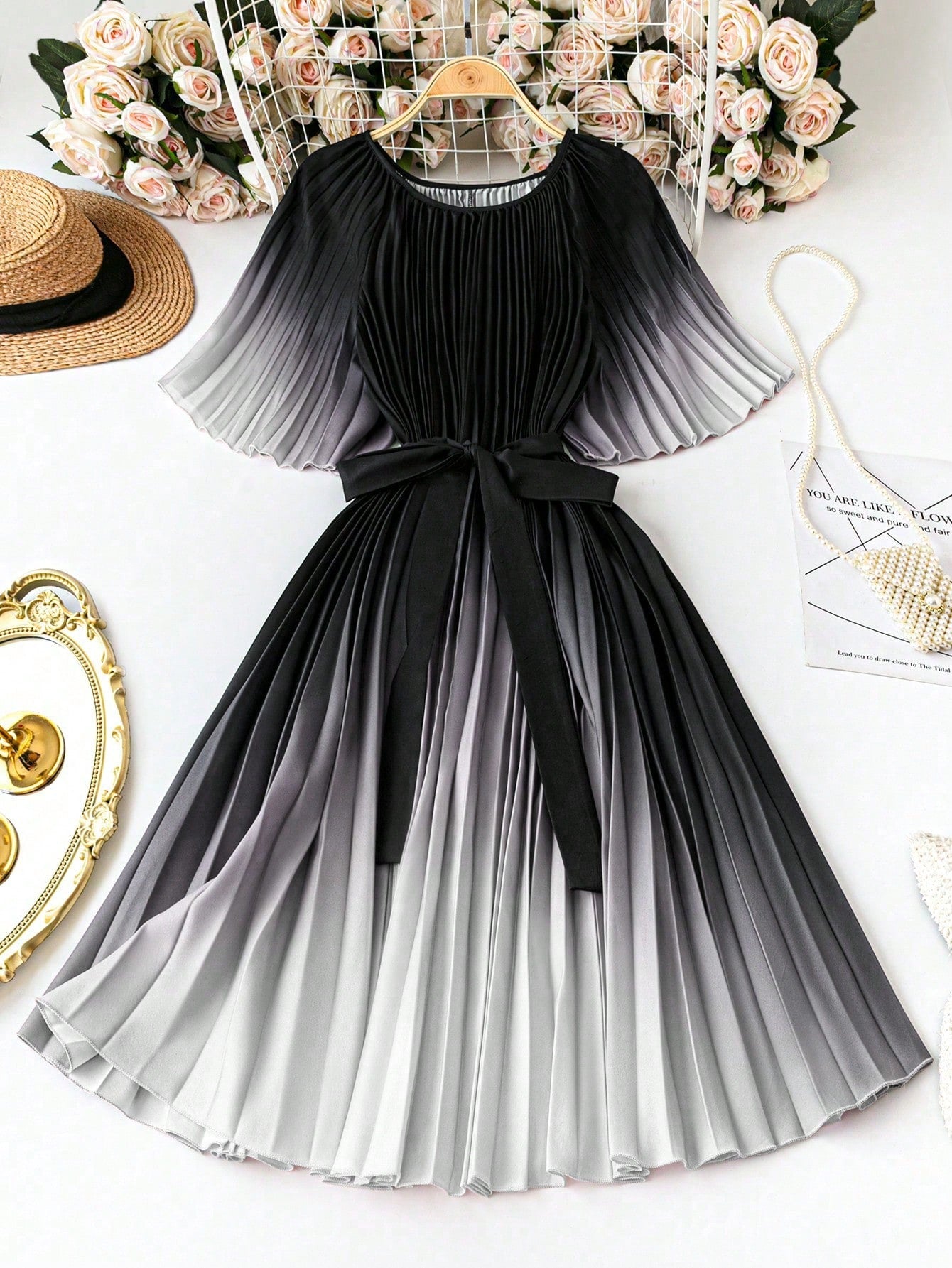فستان دريم سكايين كورت ريترو للنساء بمقاسات كبيرة، برقبة دائرية وأكمام قصيرة، مطوي، متدرج الألوان، أنيق وواسع، متوسط الطول