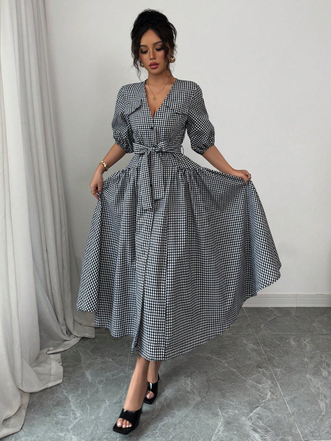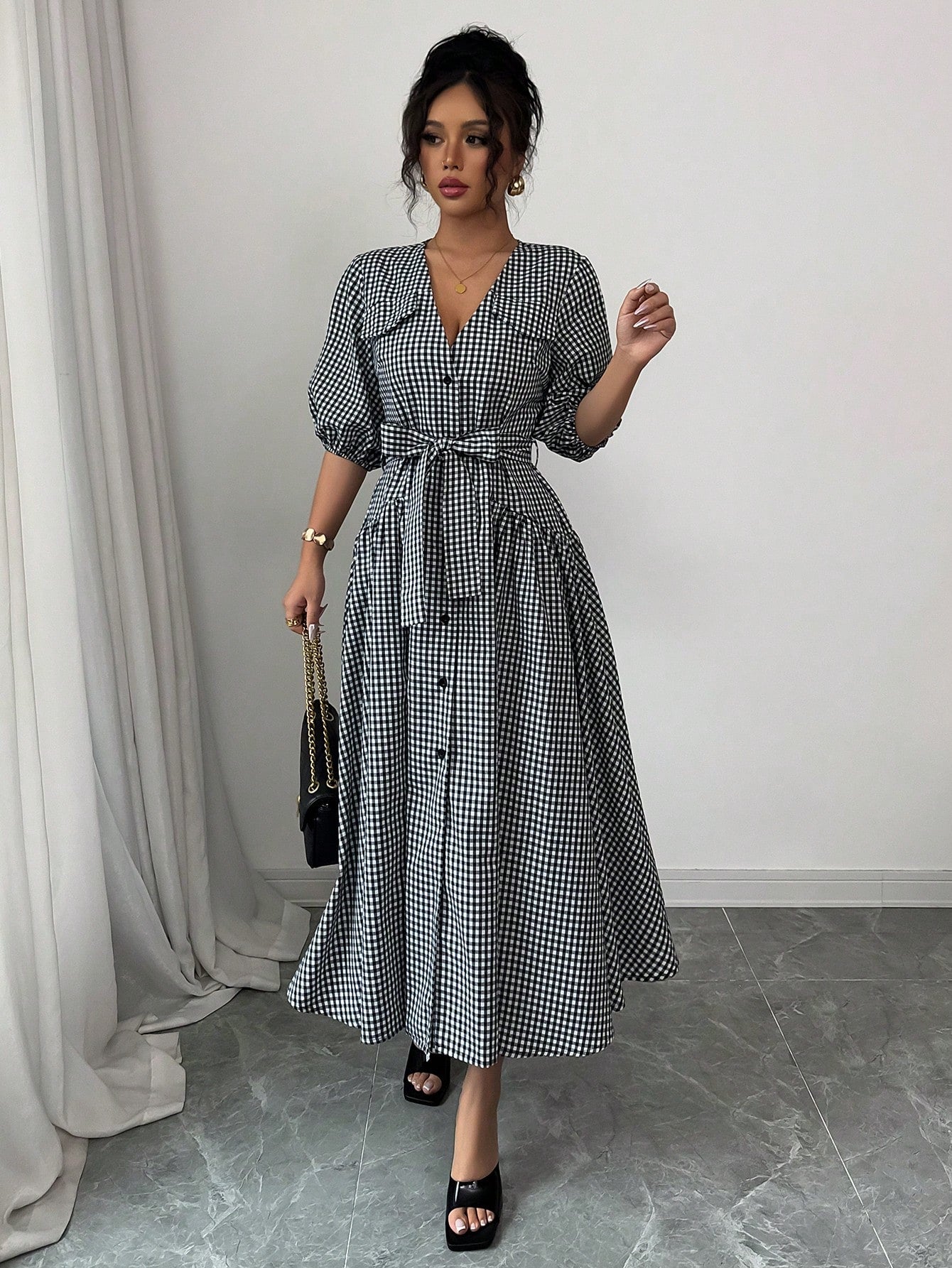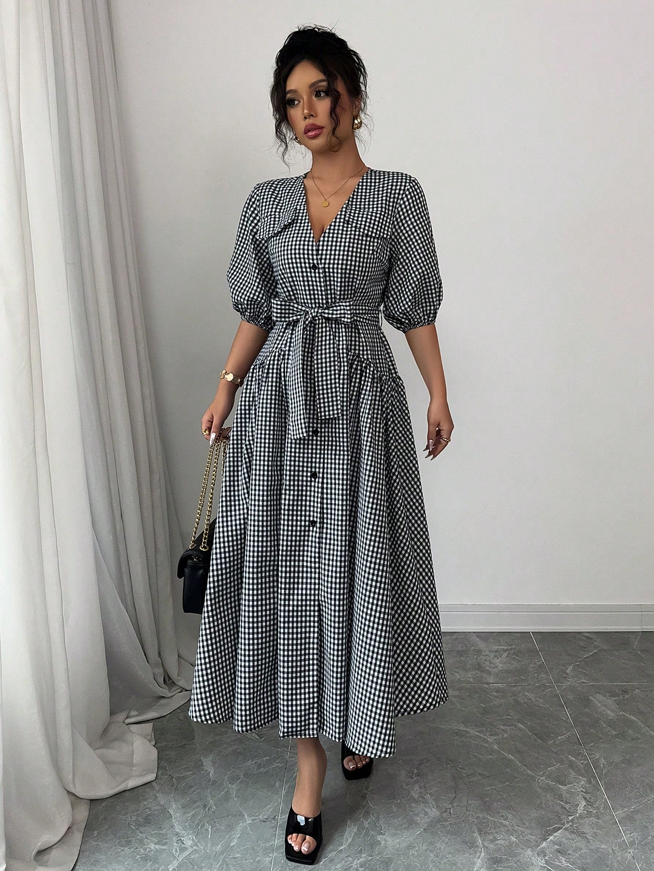 women Elenzga Women's Short Puff Sleeve V-Neck Single-Breasted Black & White Plaid Dress