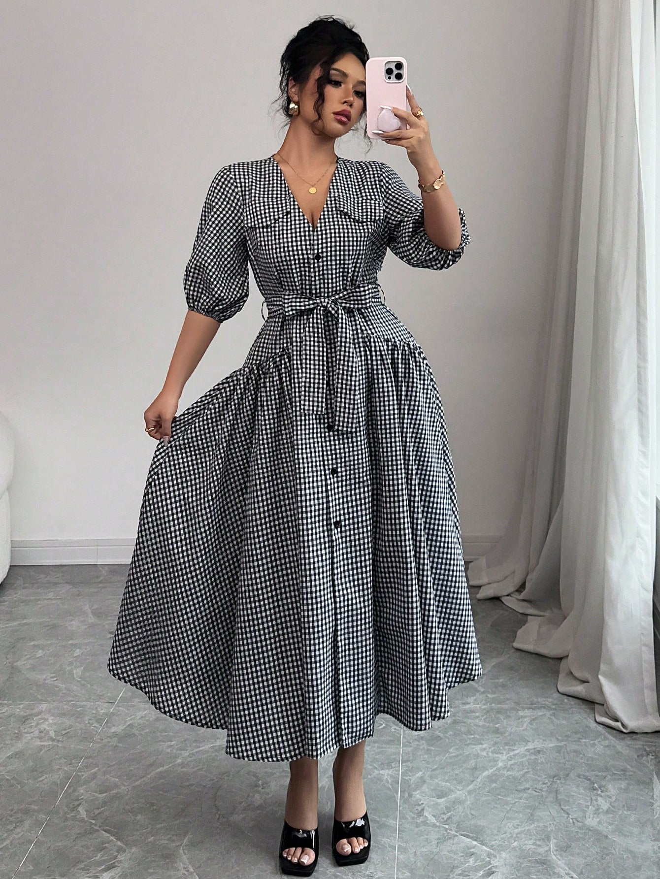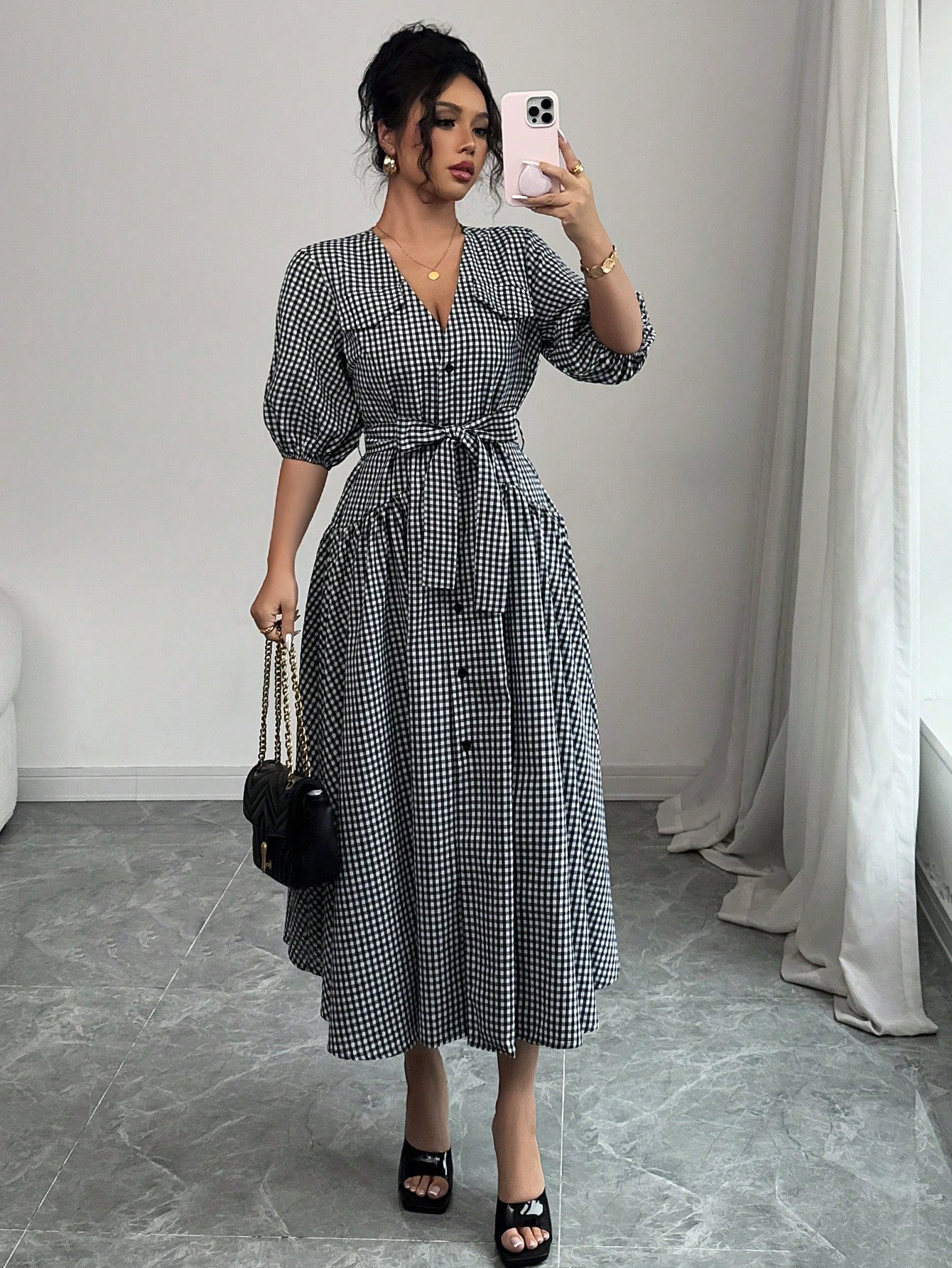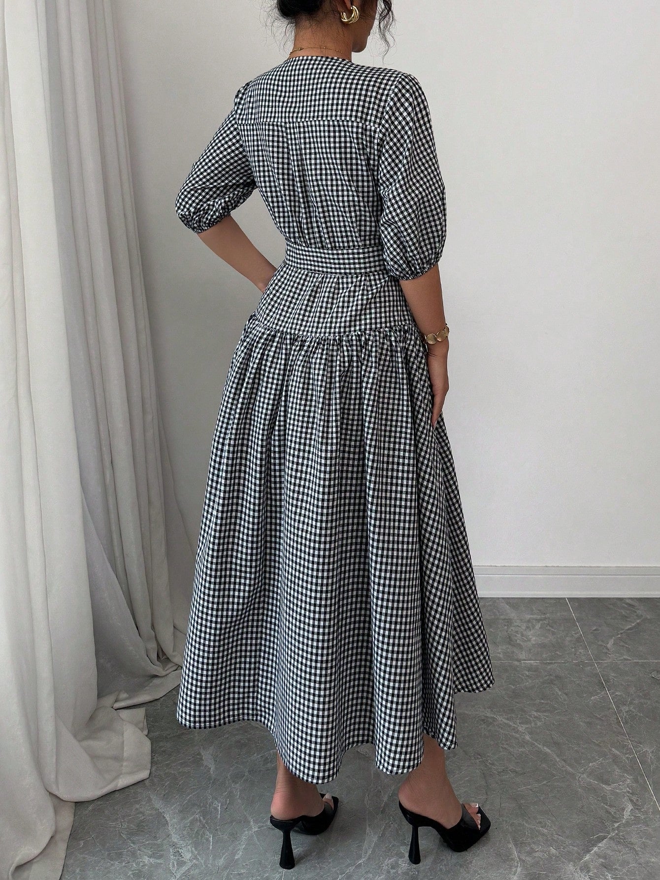 women Elenzga Women's Short Puff Sleeve V-Neck Single-Breasted Black & White Plaid Dress