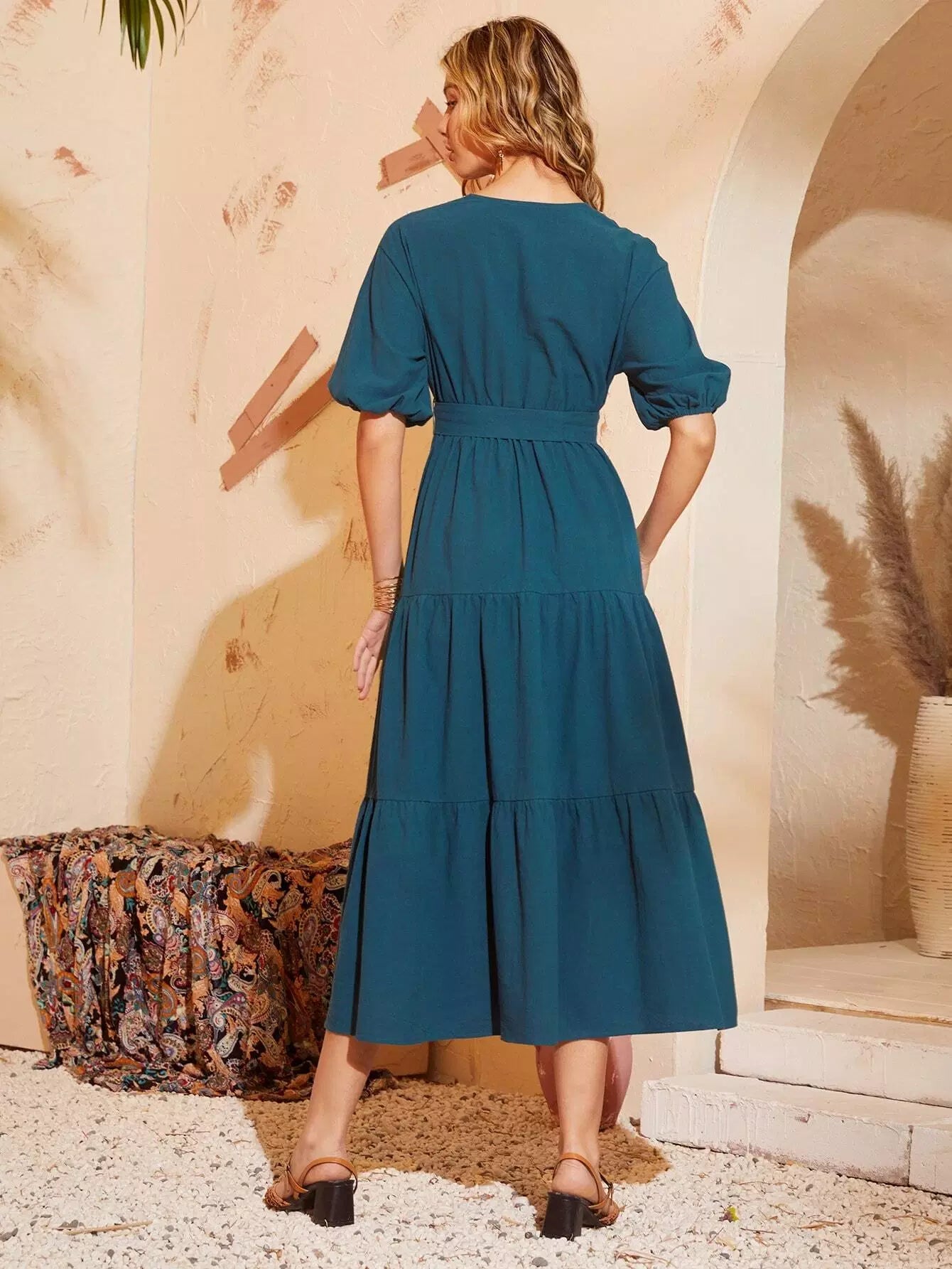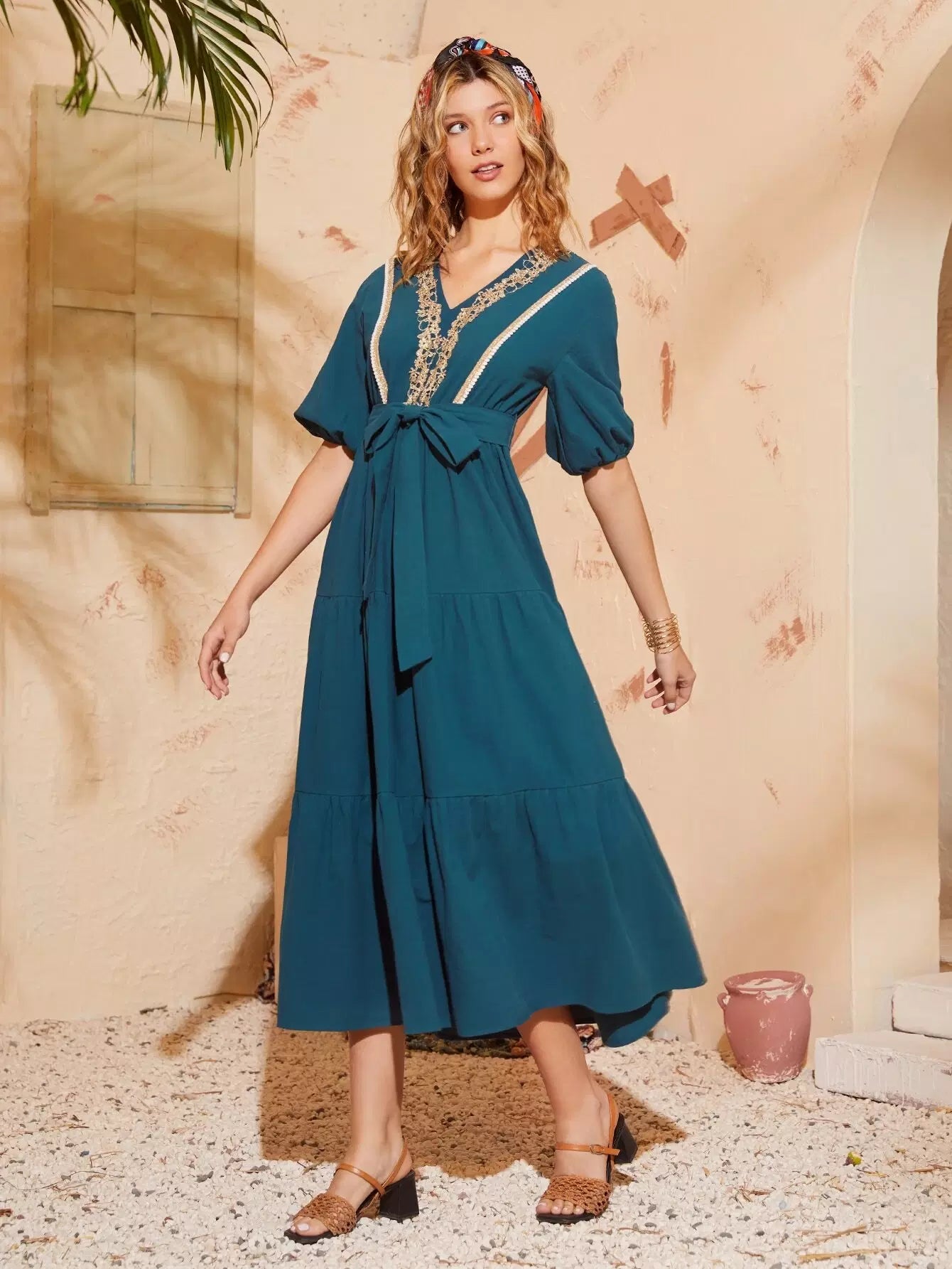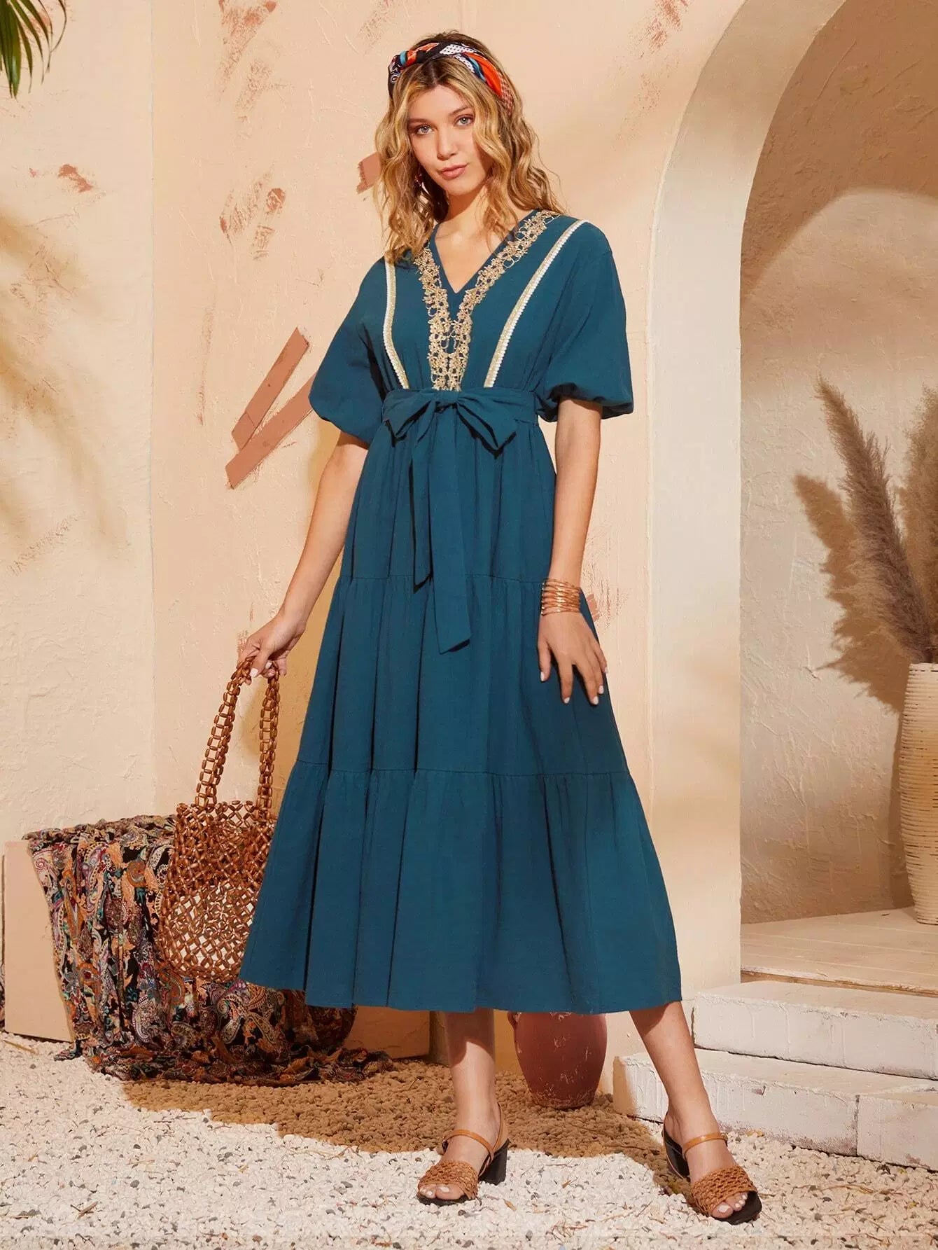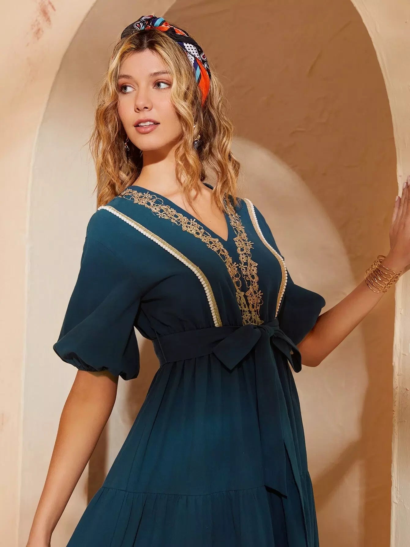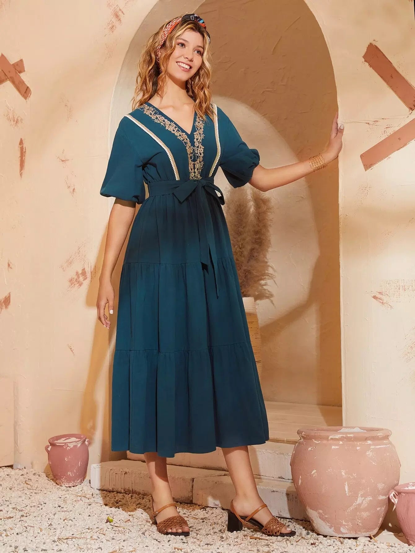 فستان ذاتي بأكمام فانوس مطرزة بدون حزام