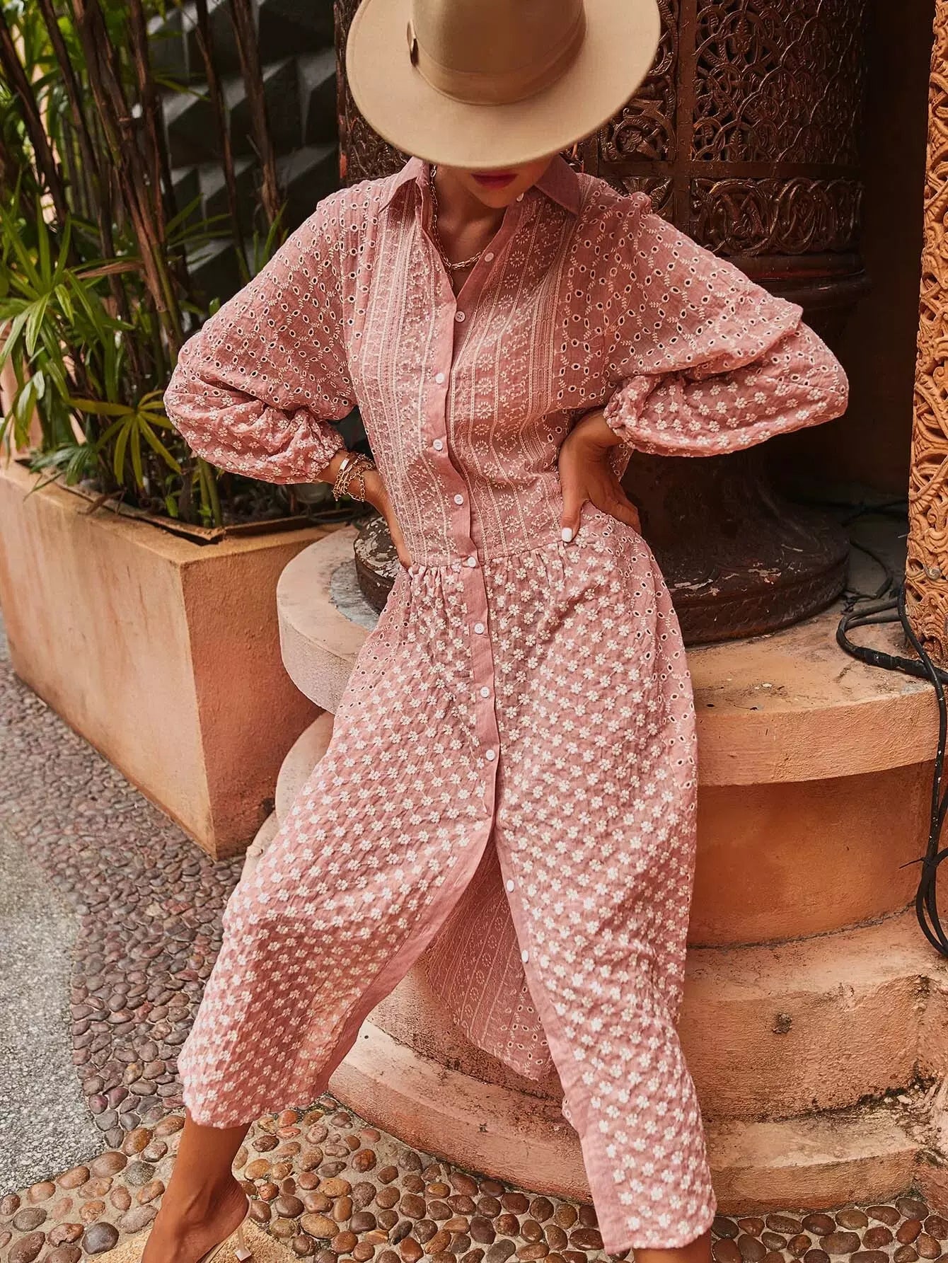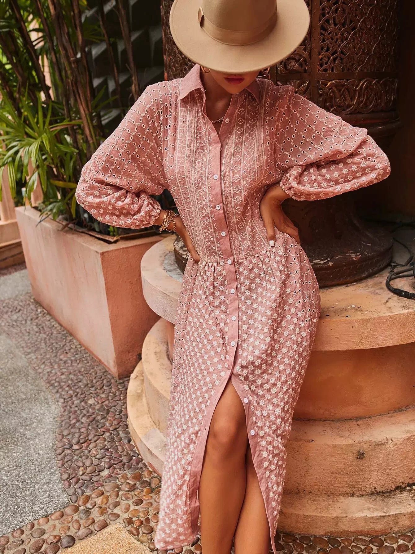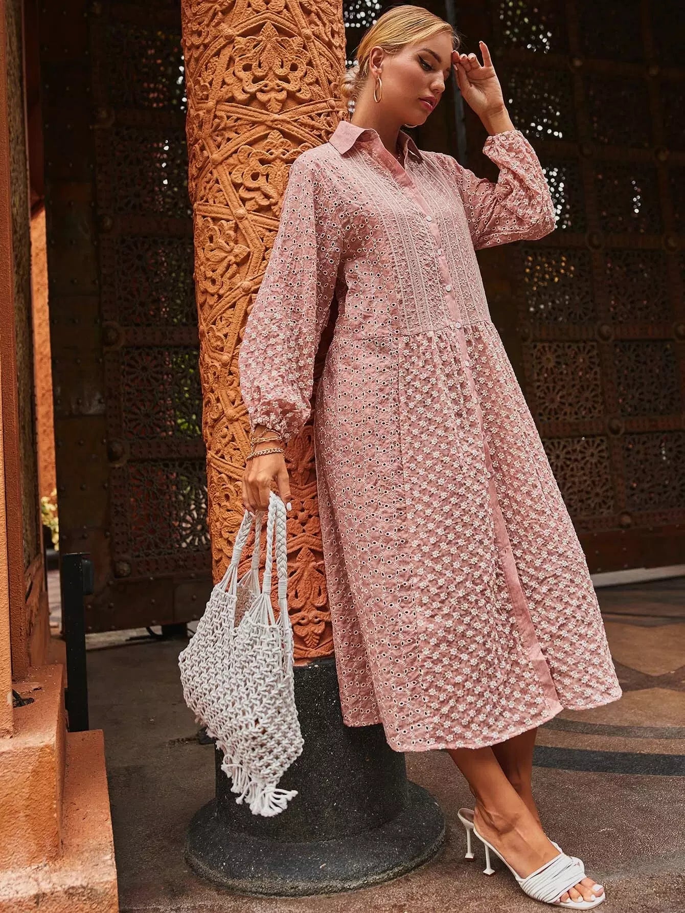 فستان قميص بأكمام مطرزة بتطريزات العيينة