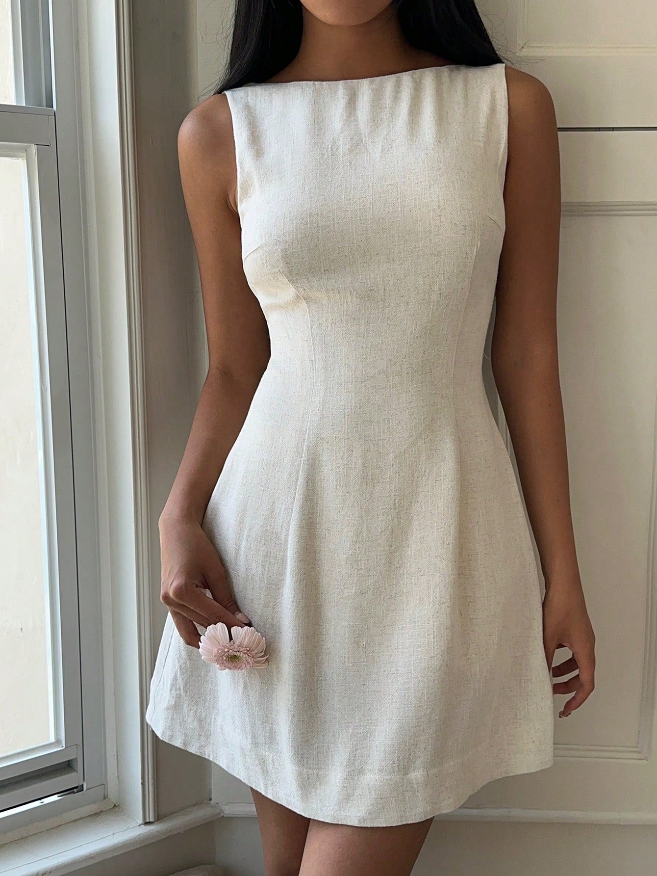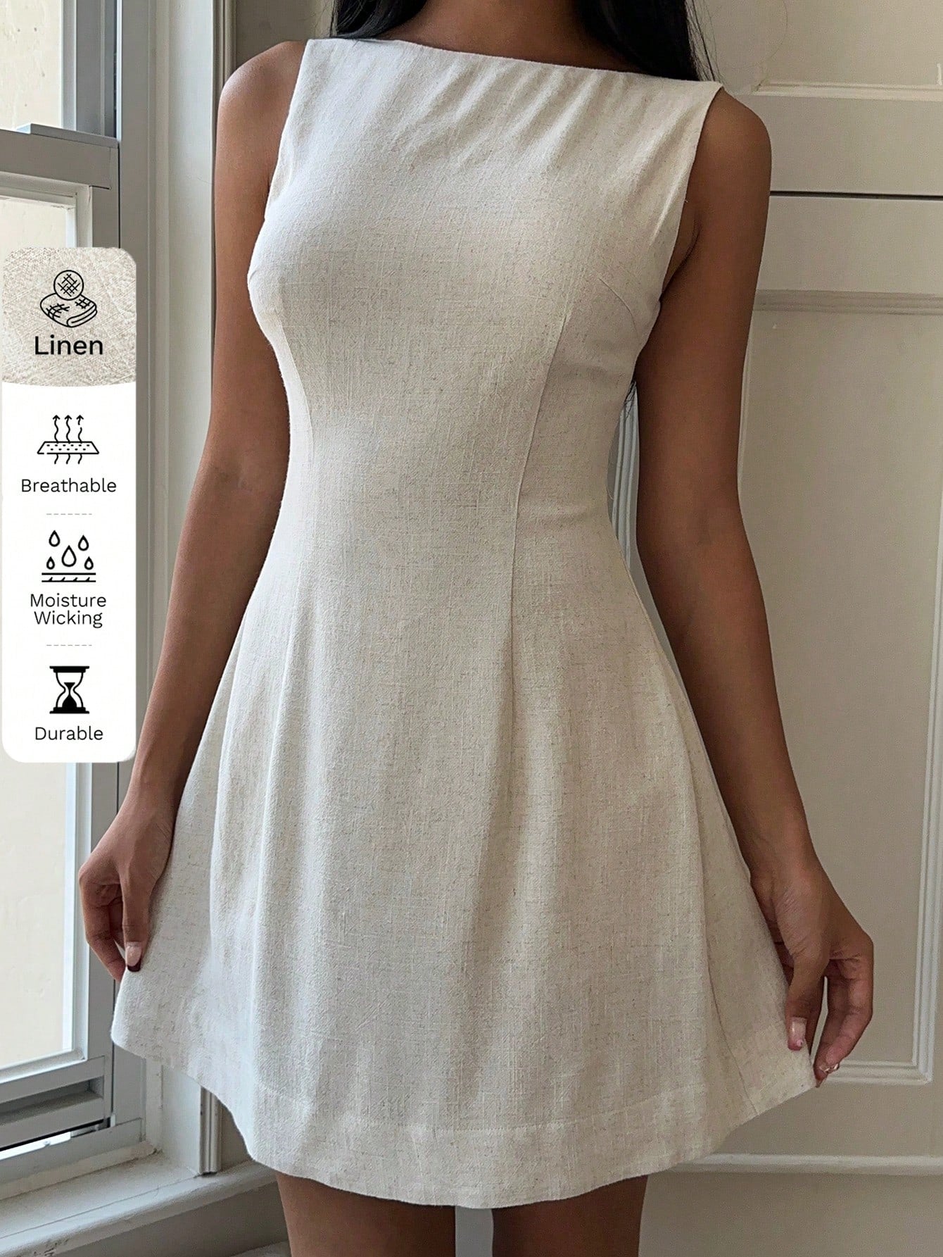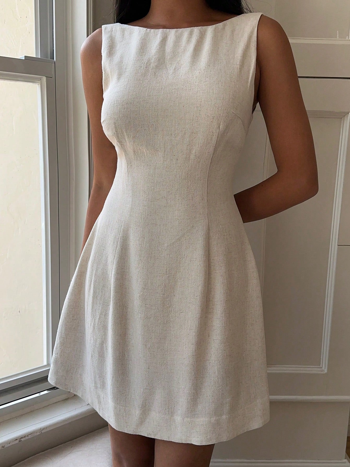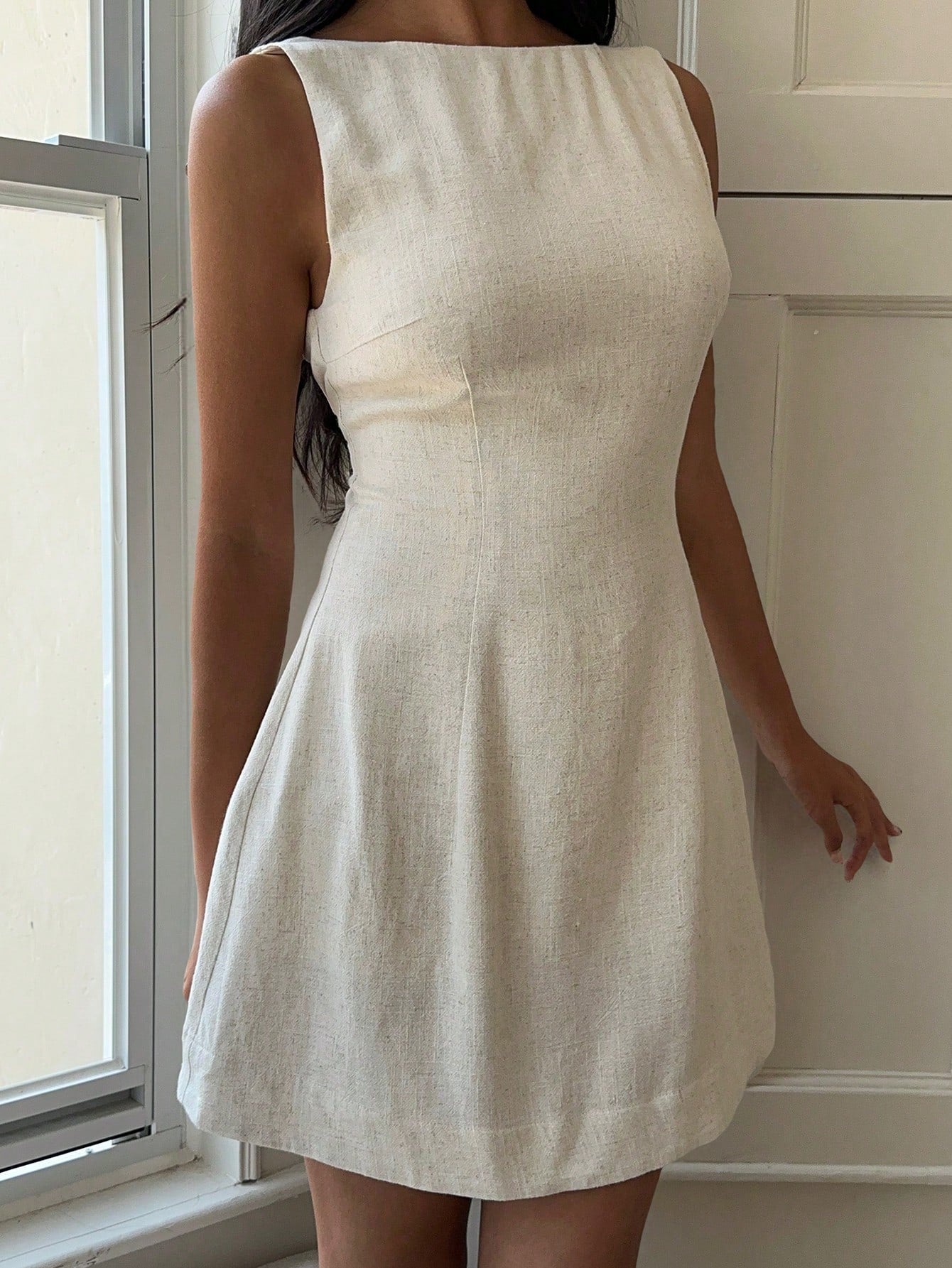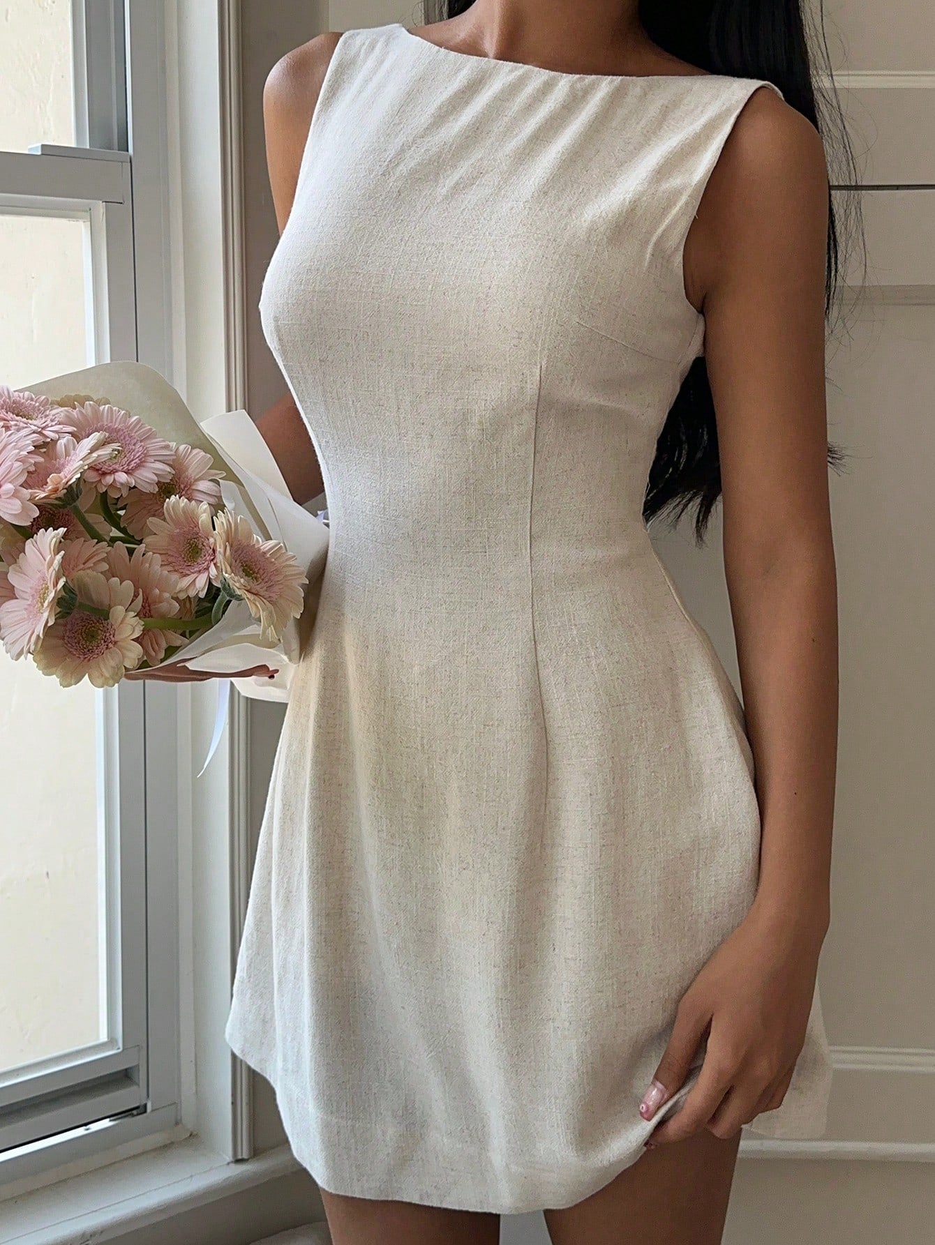 EZwear Women's Casual Apricot Mini Dress: Sleeveless Round Neck Woven Fabric Semi-Sheer Flared Hem Zipper