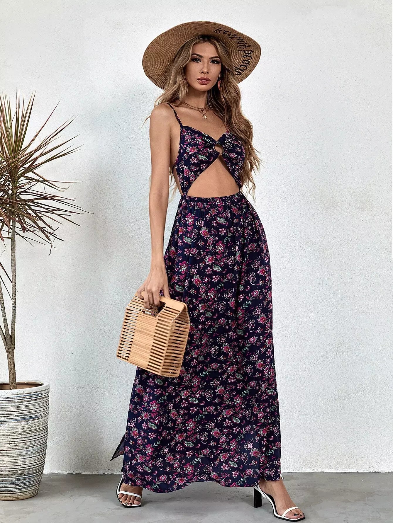 فستان زهري مكشوف الظهر ومفتوح من الفخذين بفتحة منسدلة على الفخذين