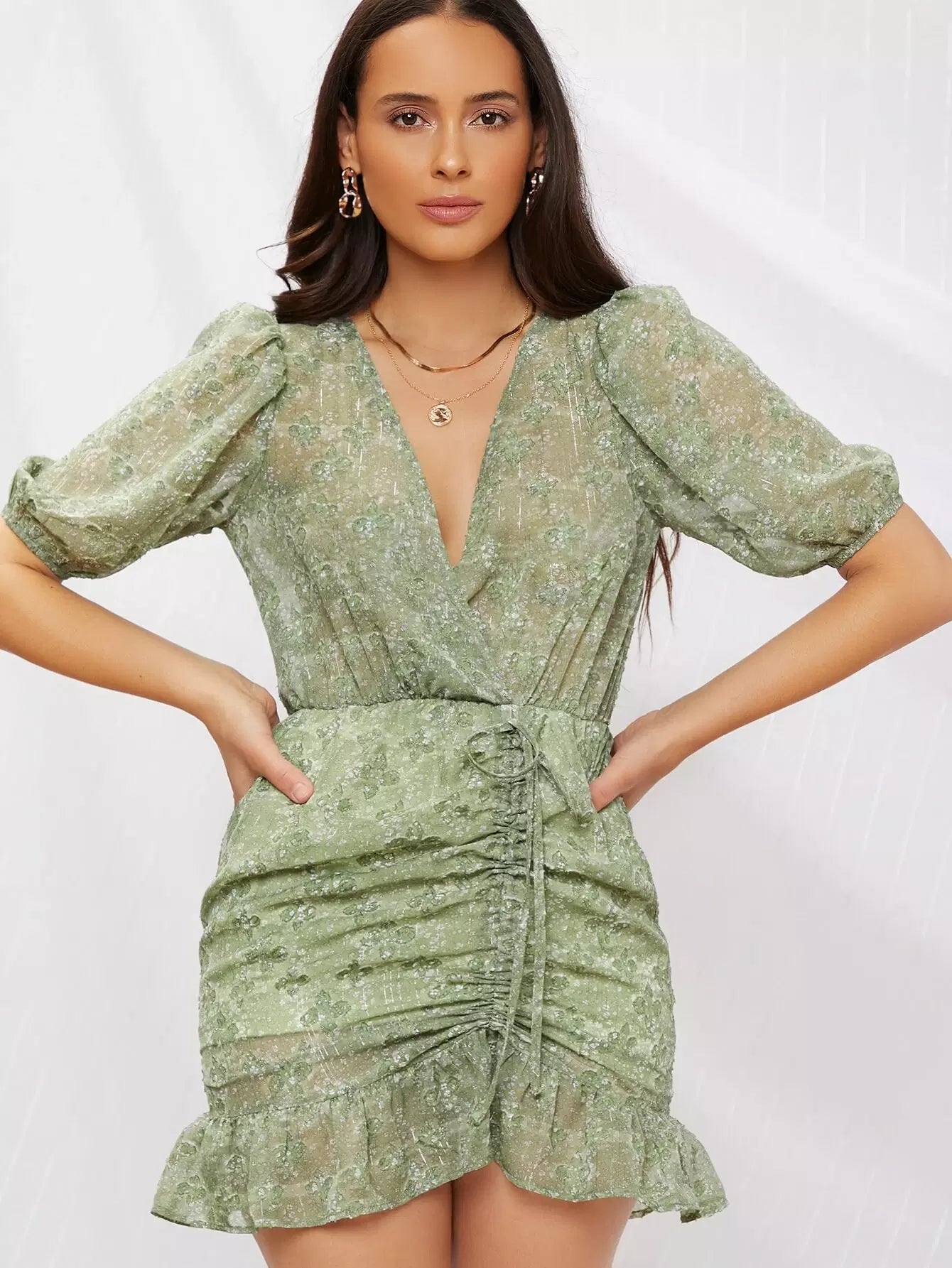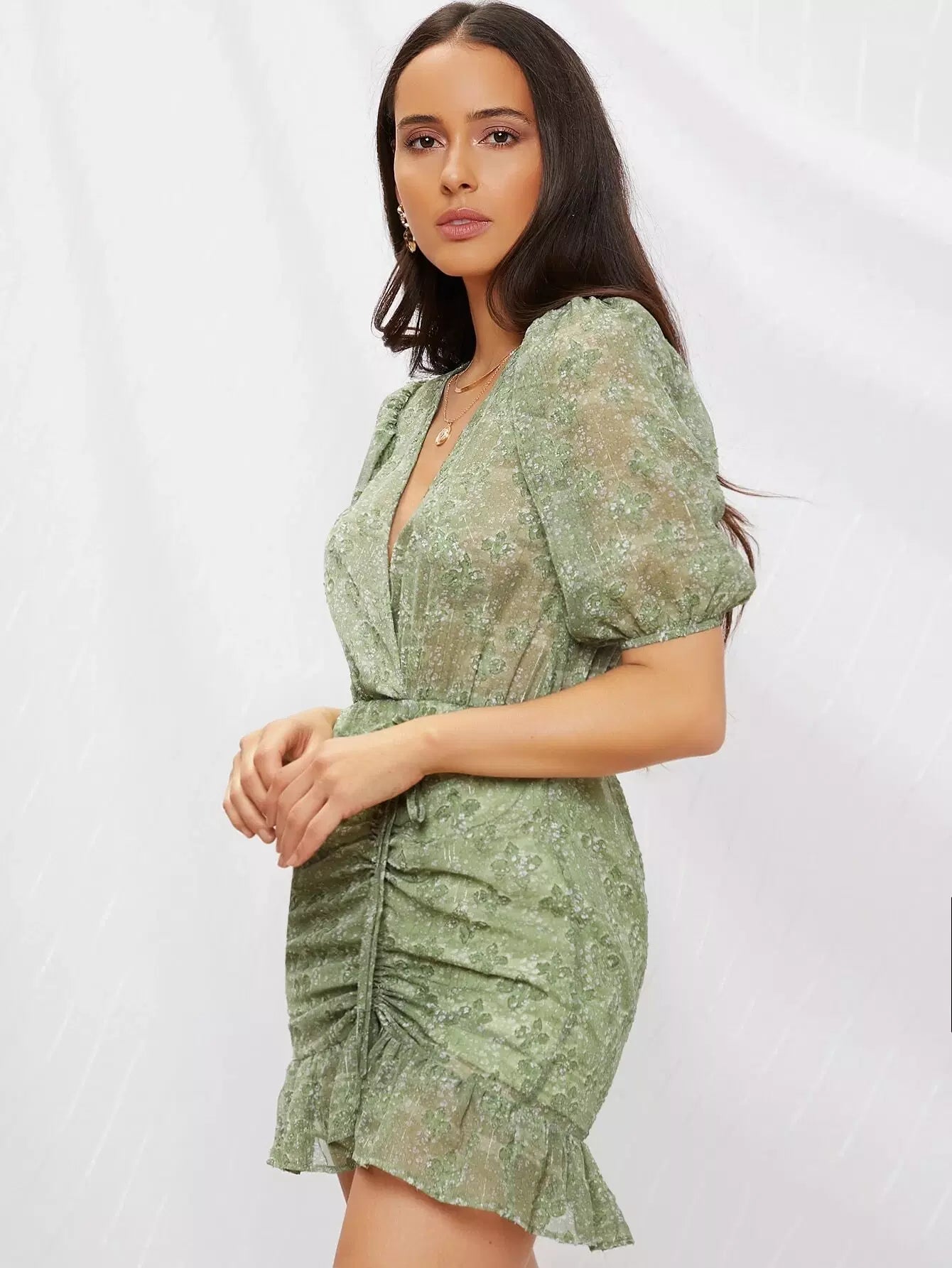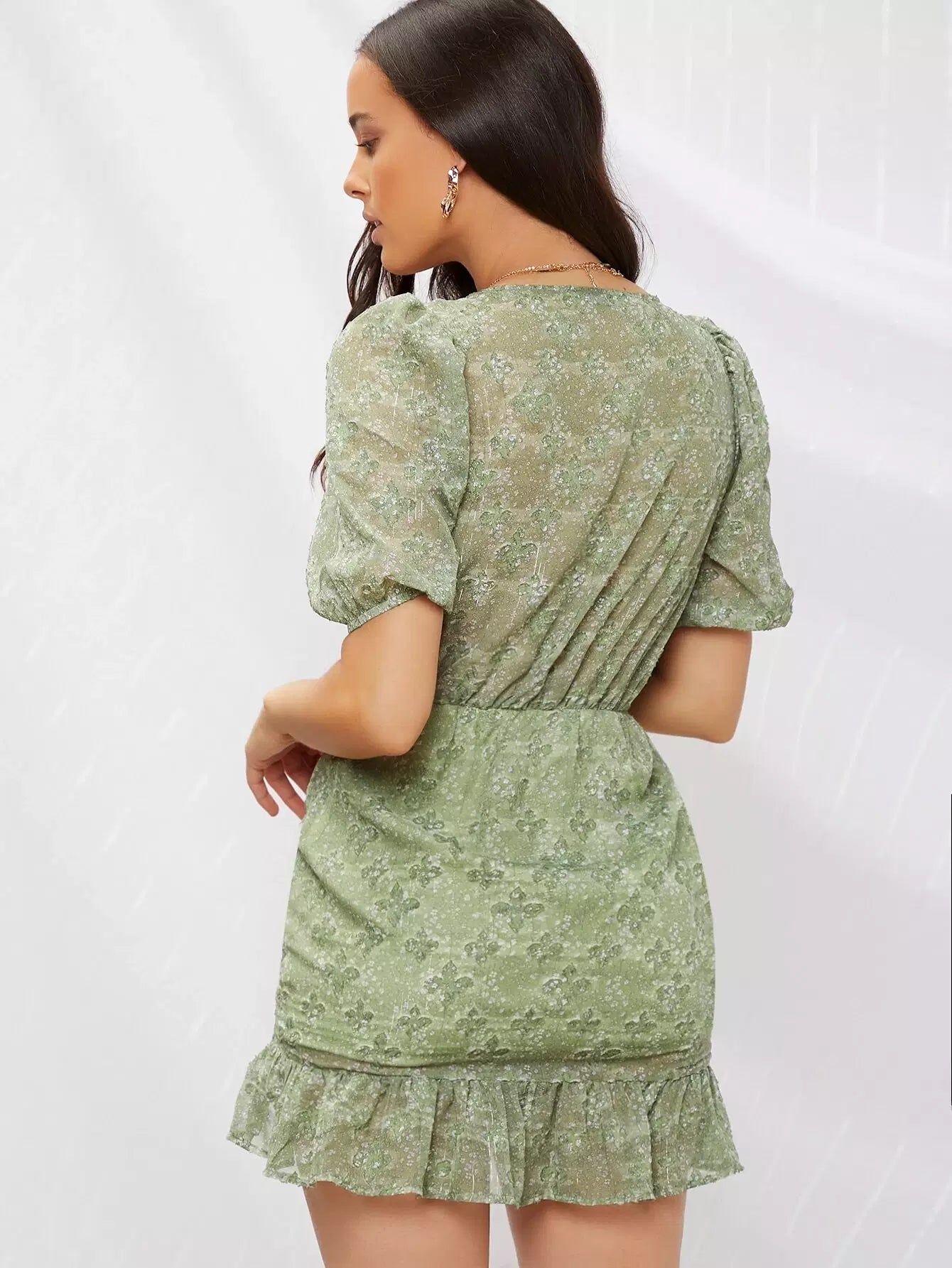 فستان بأكمام مكشكشة بأربطة زهرية بأكمام منفوشة
