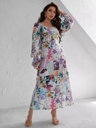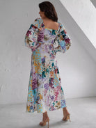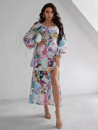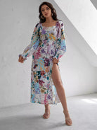 فستان مرقع بطبعة زهور مرقع ومفتوح من الفخذين