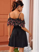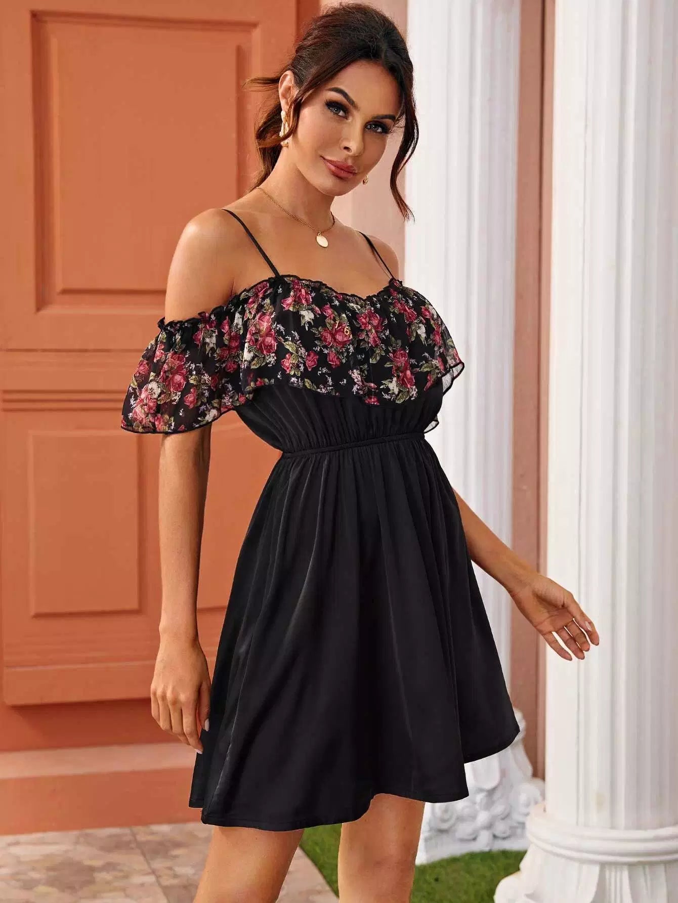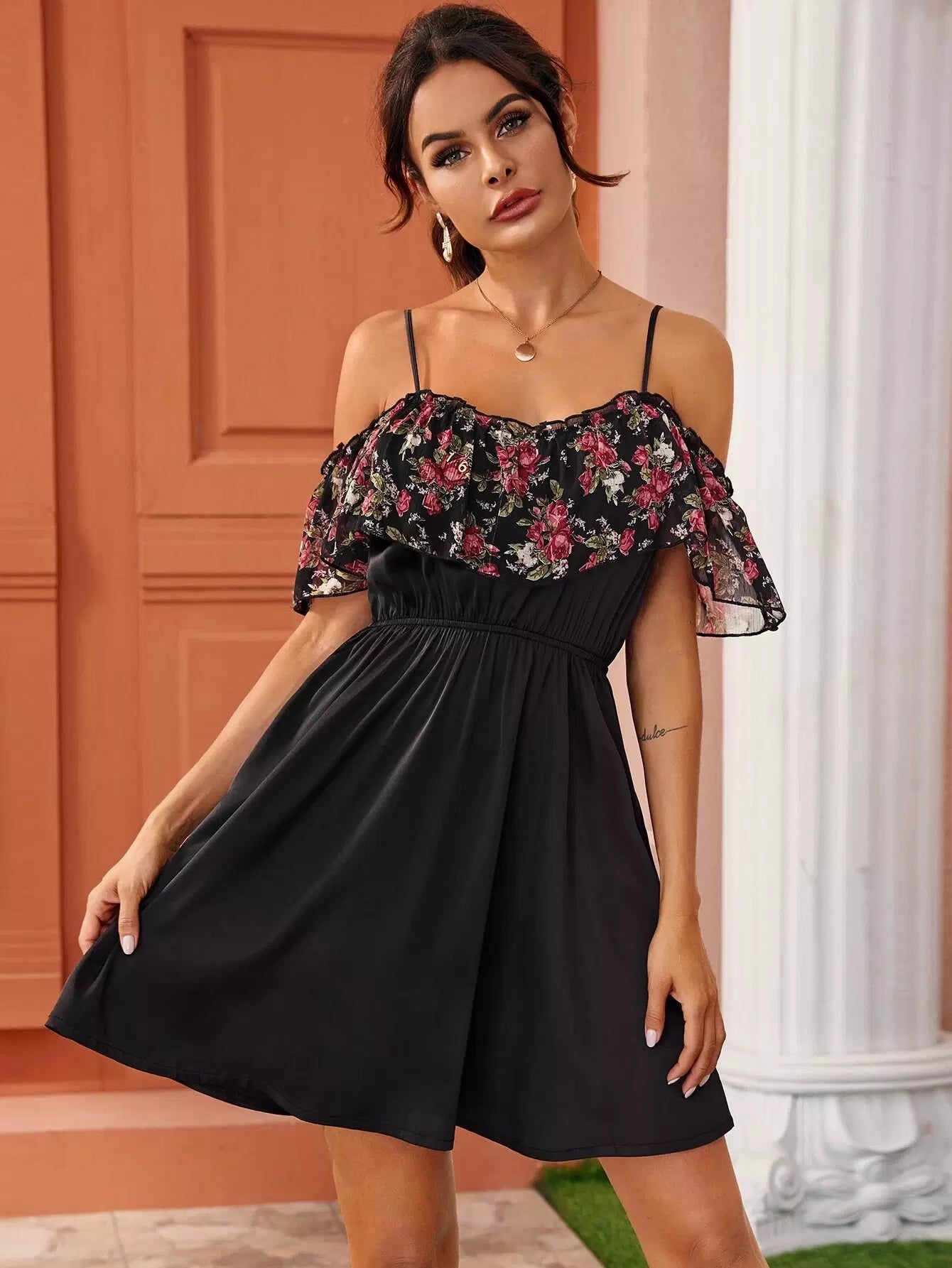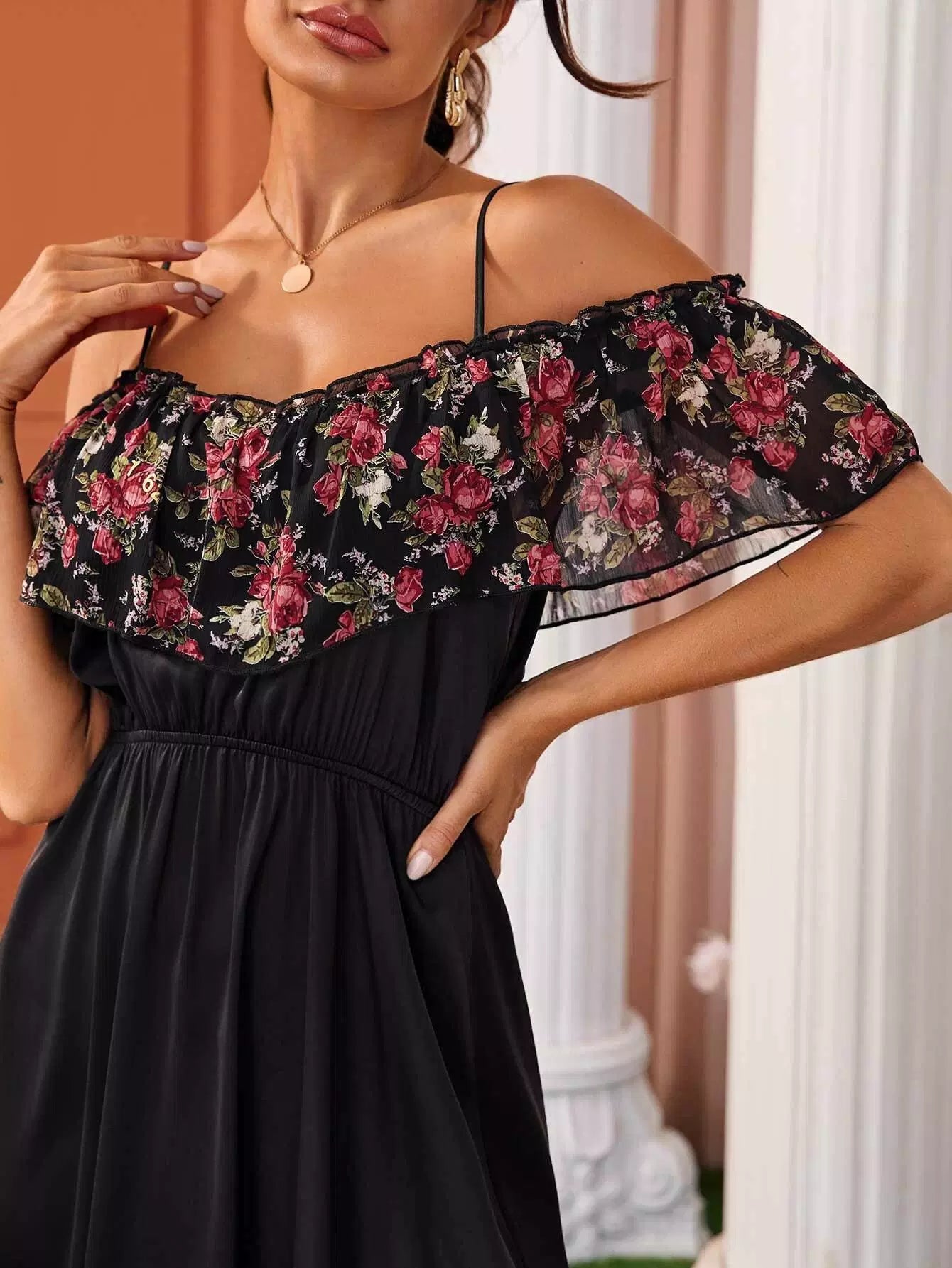 فستان بطبعة زهور مطبوع على الأكتاف بارد على شكل حرف A