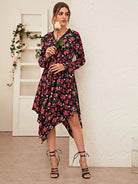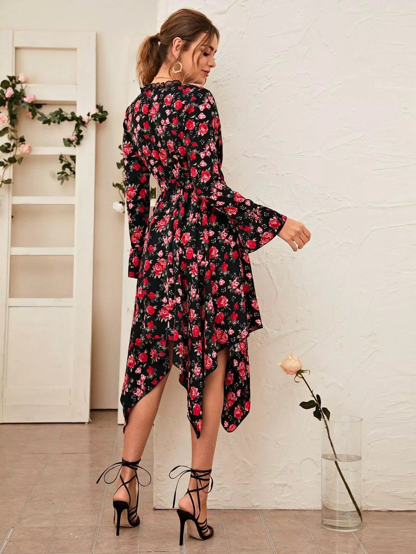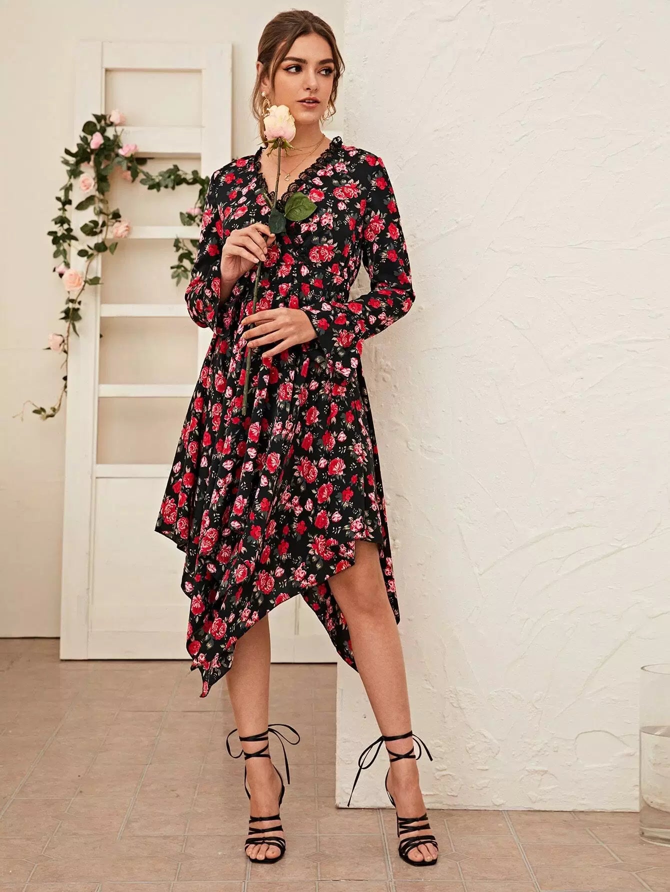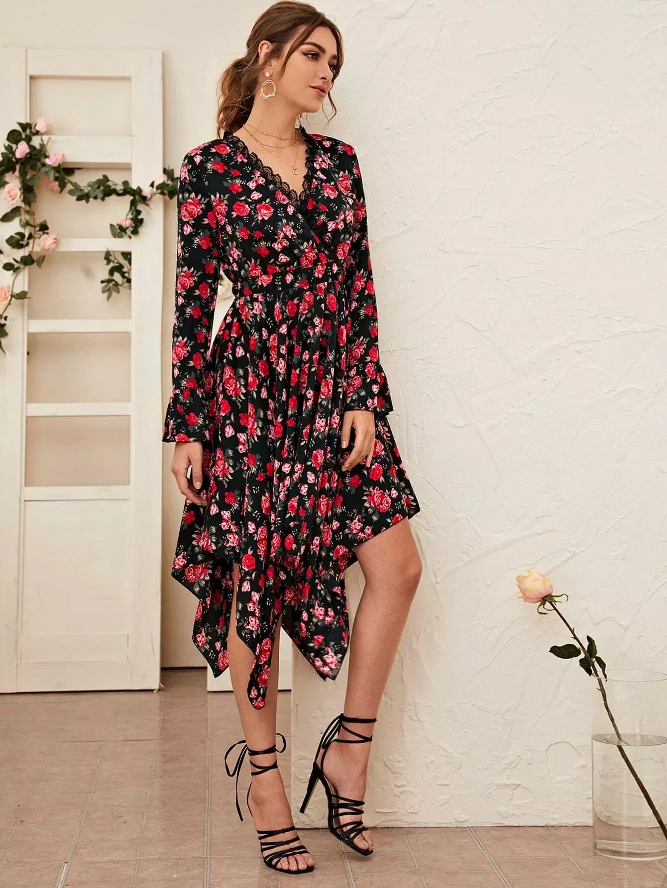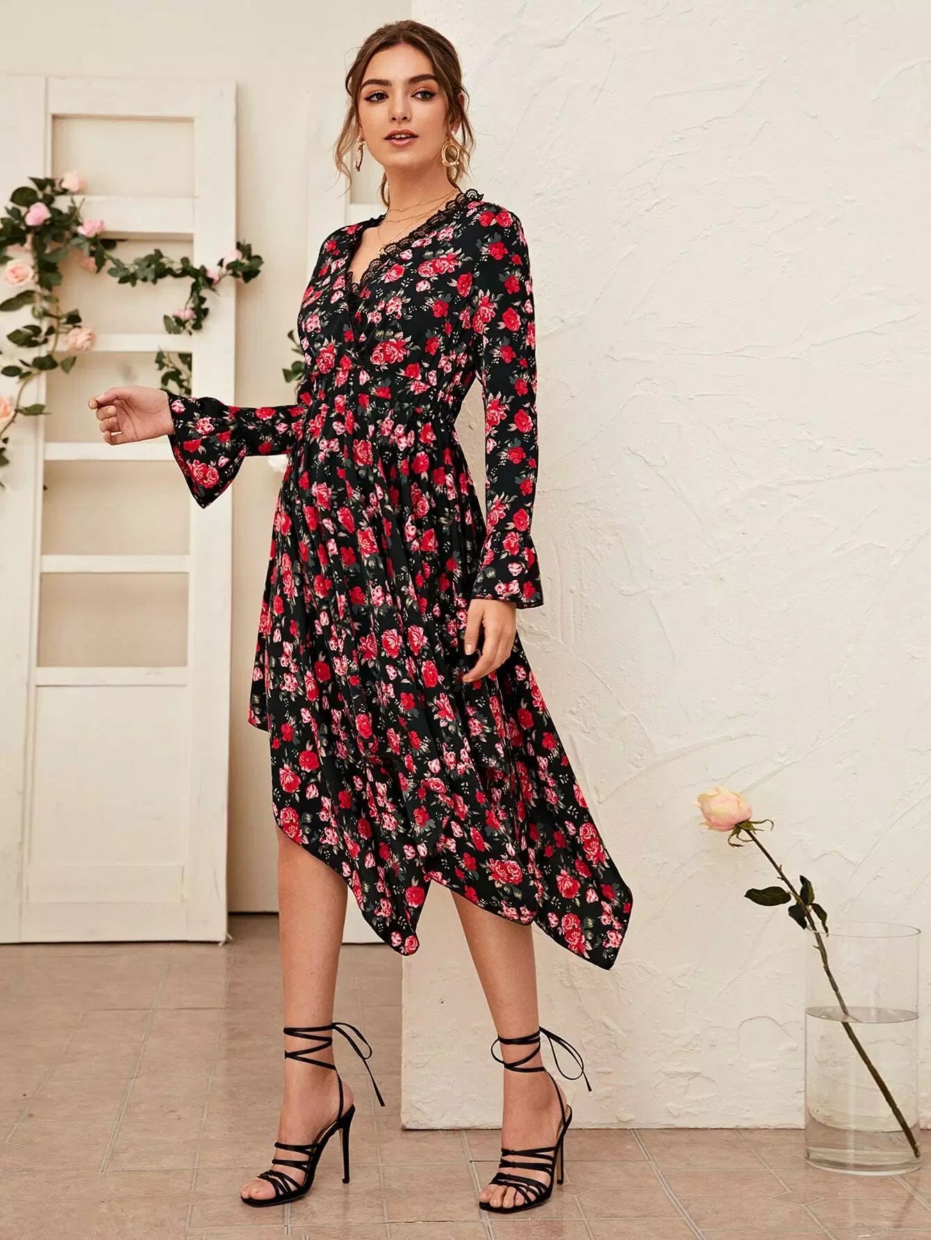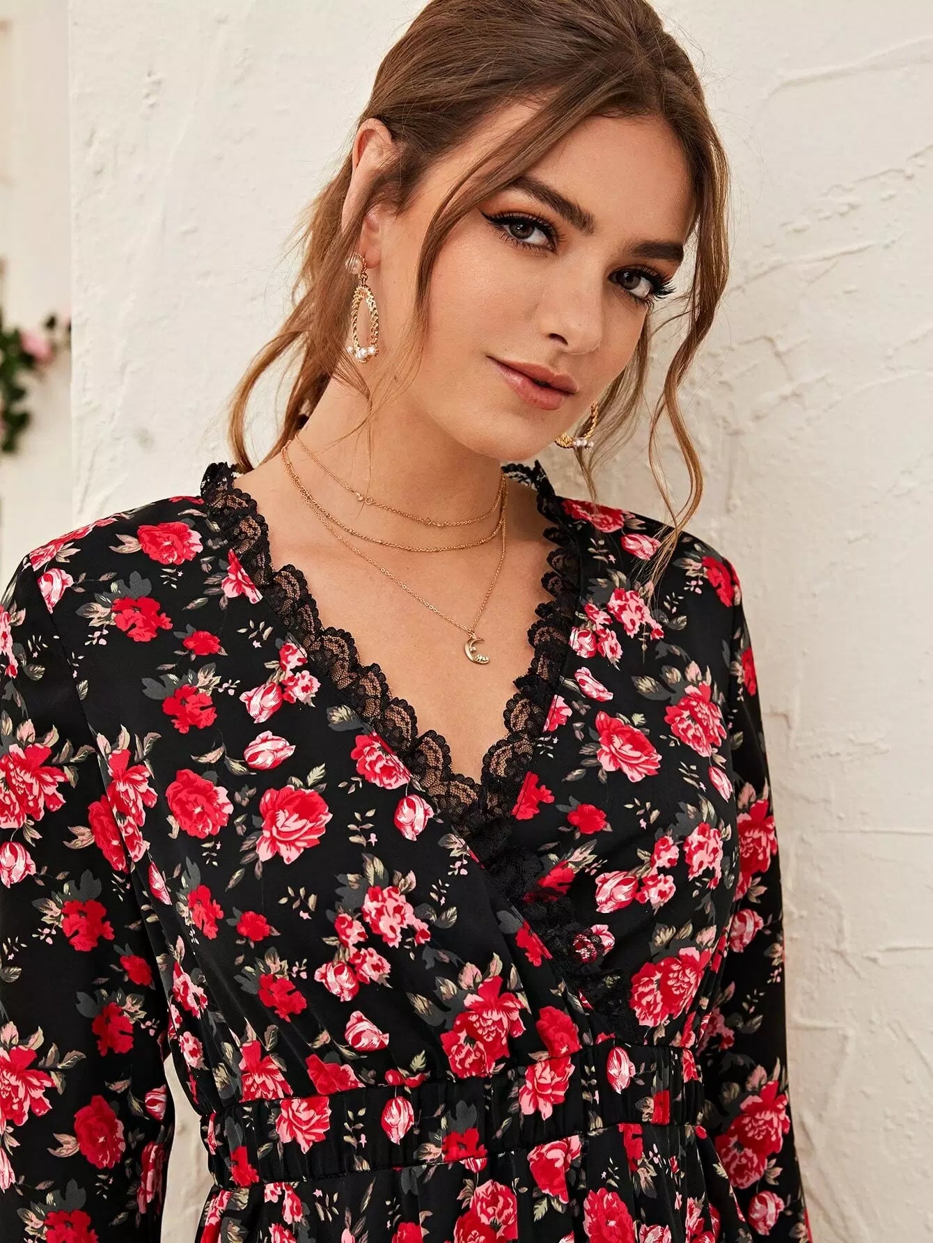 فستان بحاشية من الدانتيل بطبعة زهور بلون مغاير
