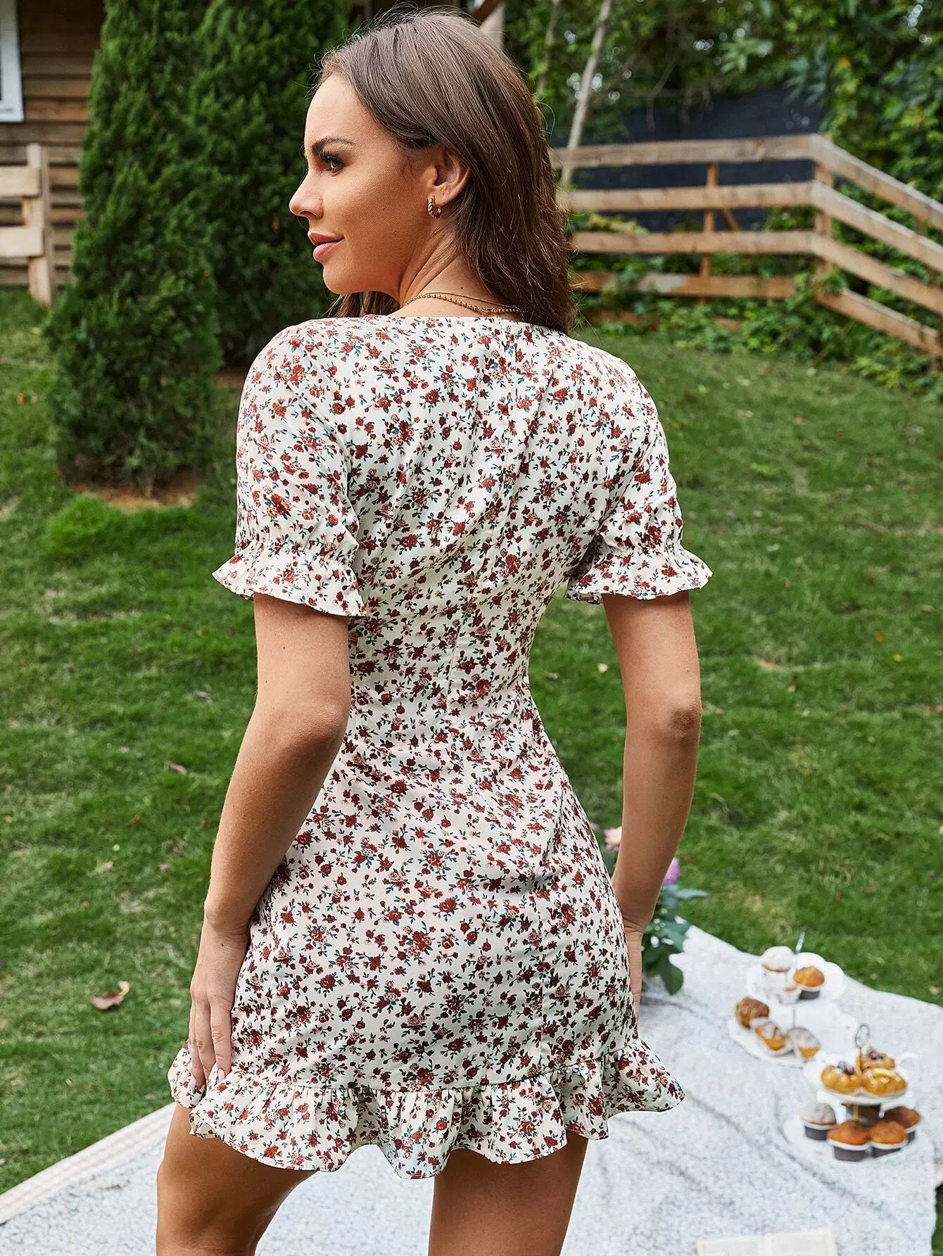 فستان بأكمام منفوشة بطبعة زهور بأكمام منفوشة ودانتيل بعقد منفوشة