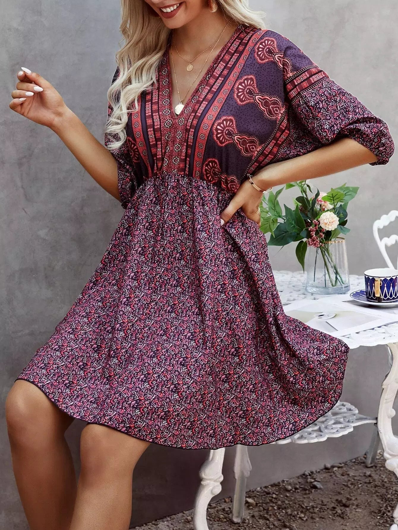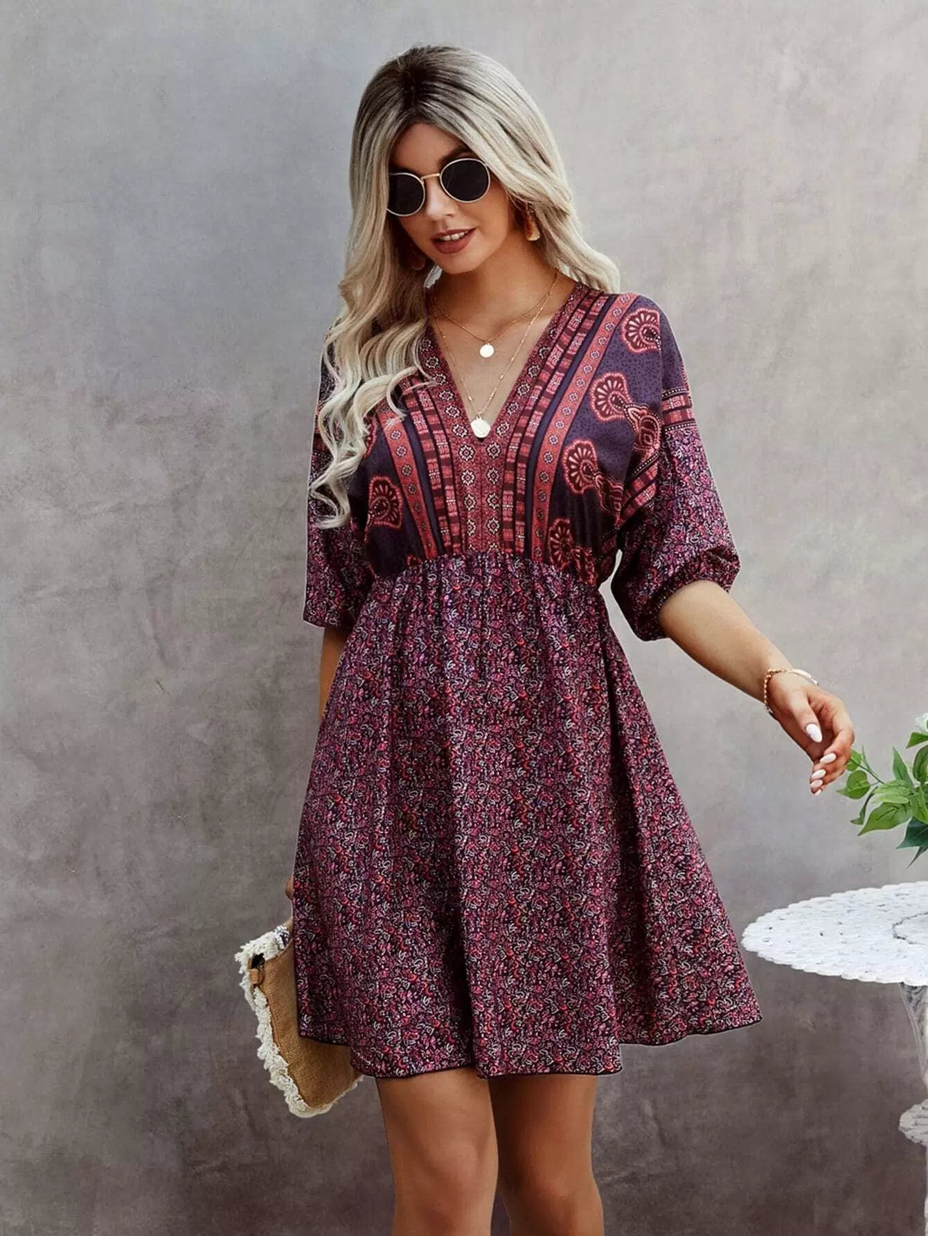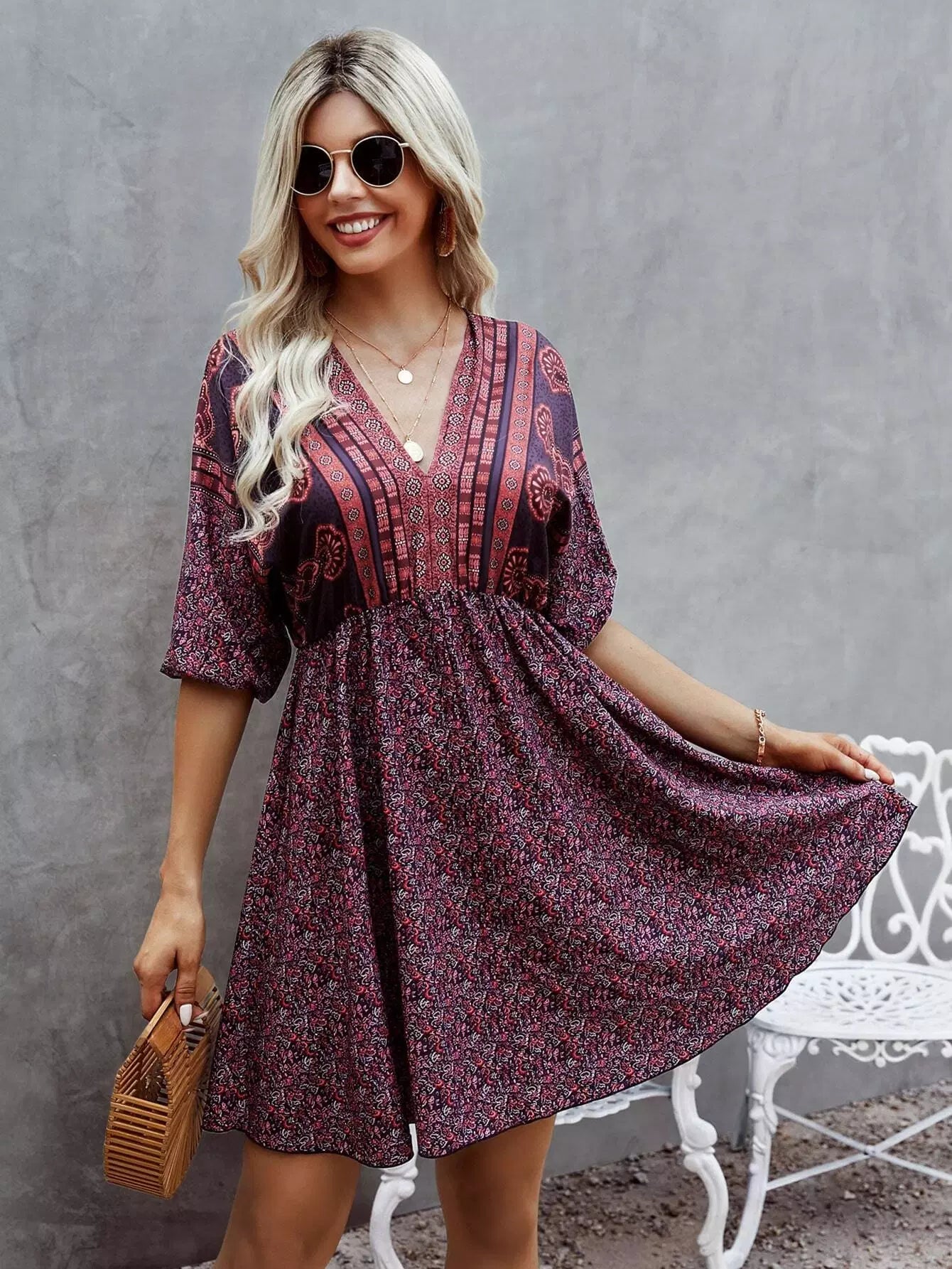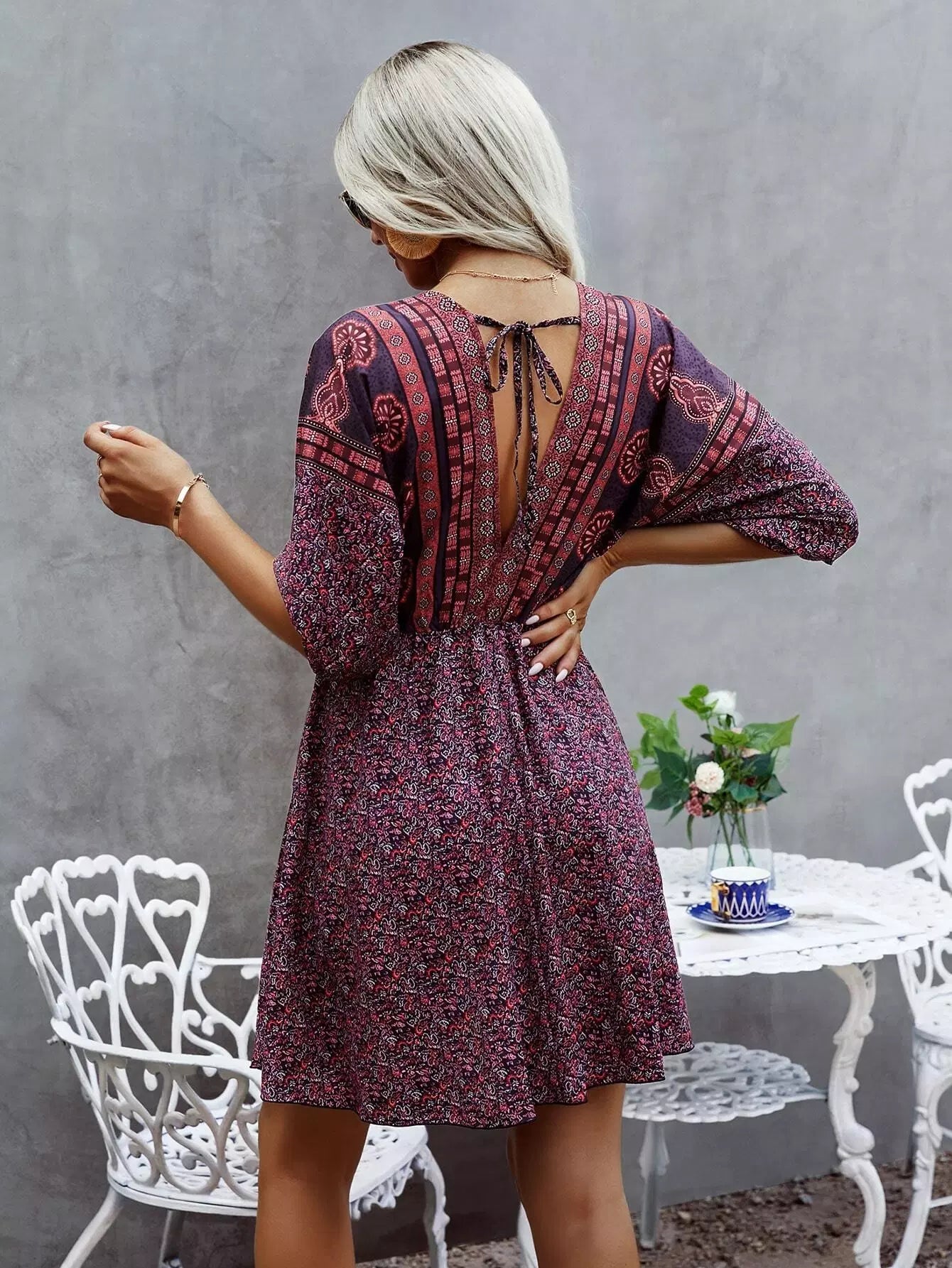 فستان بطبعات الأزهار مع رباط خلفي وأكمام خفاش
