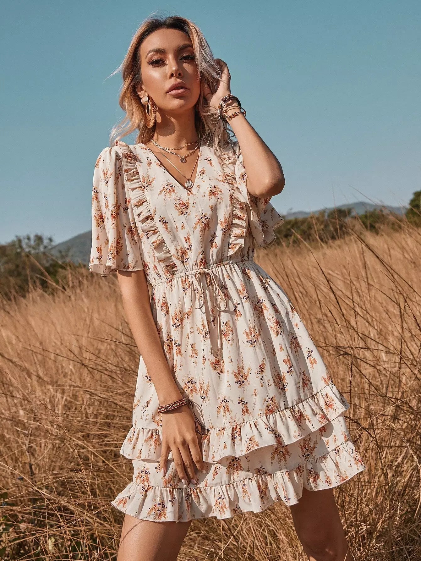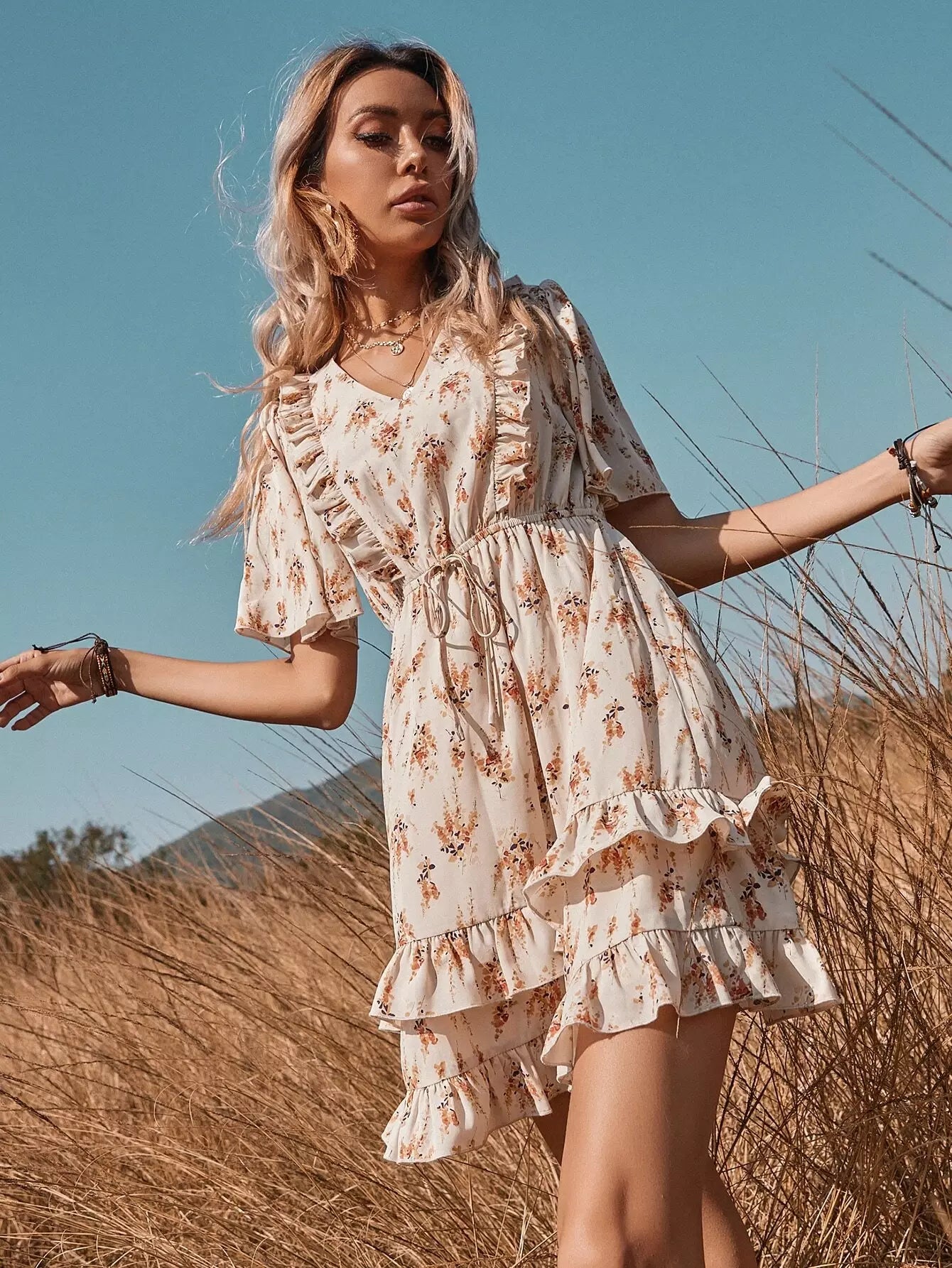فستان بطبعة زهور بياقة على شكل حرف A بياقة على شكل حرف V بحافة على شكل طبقات