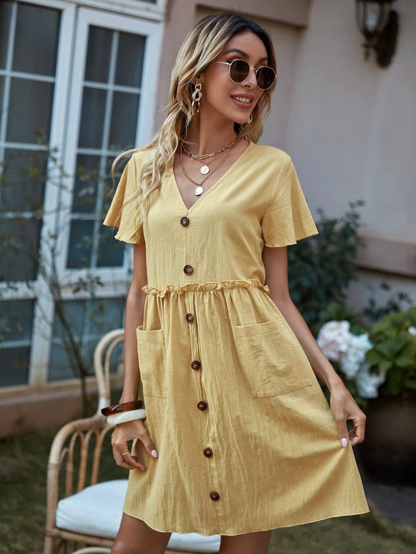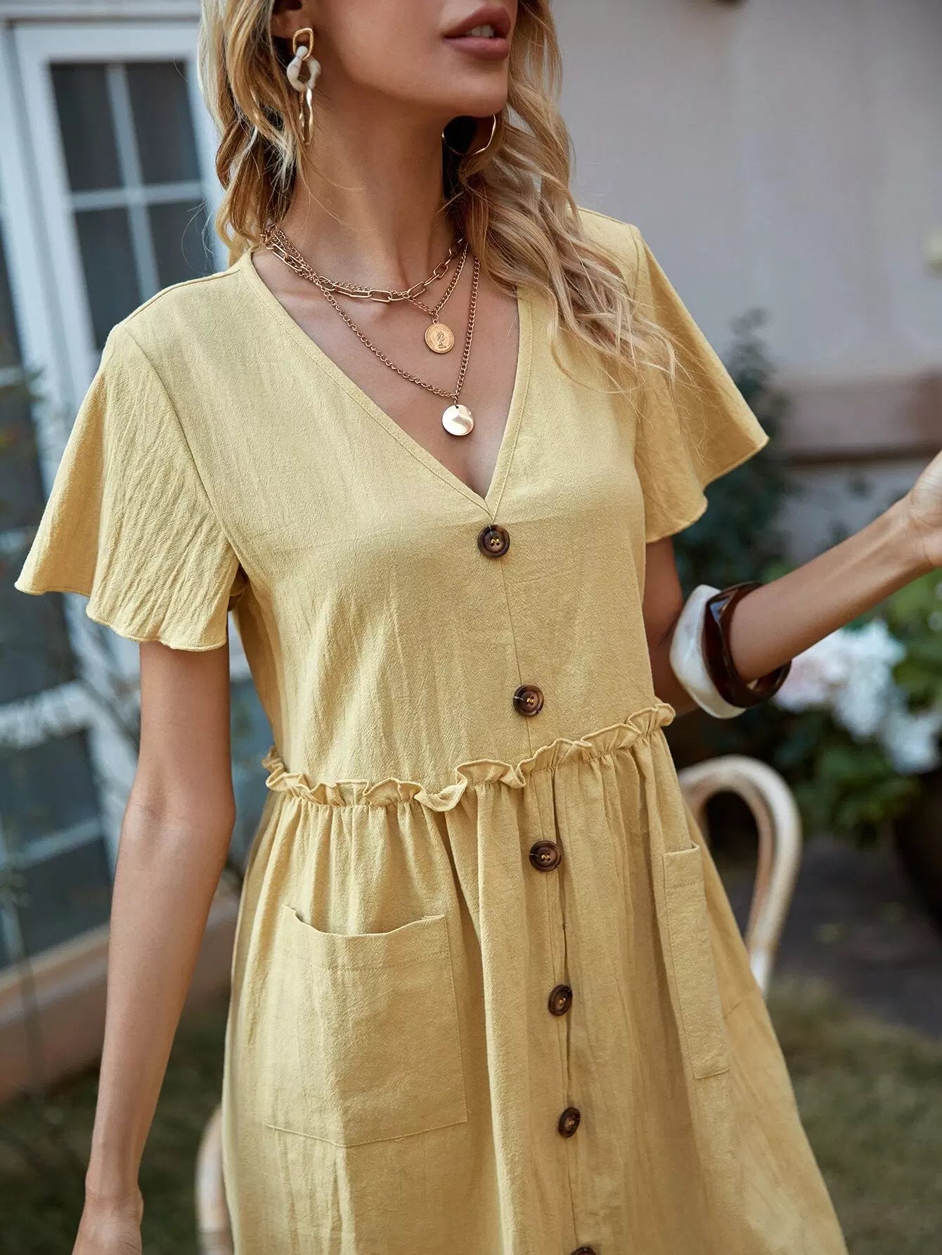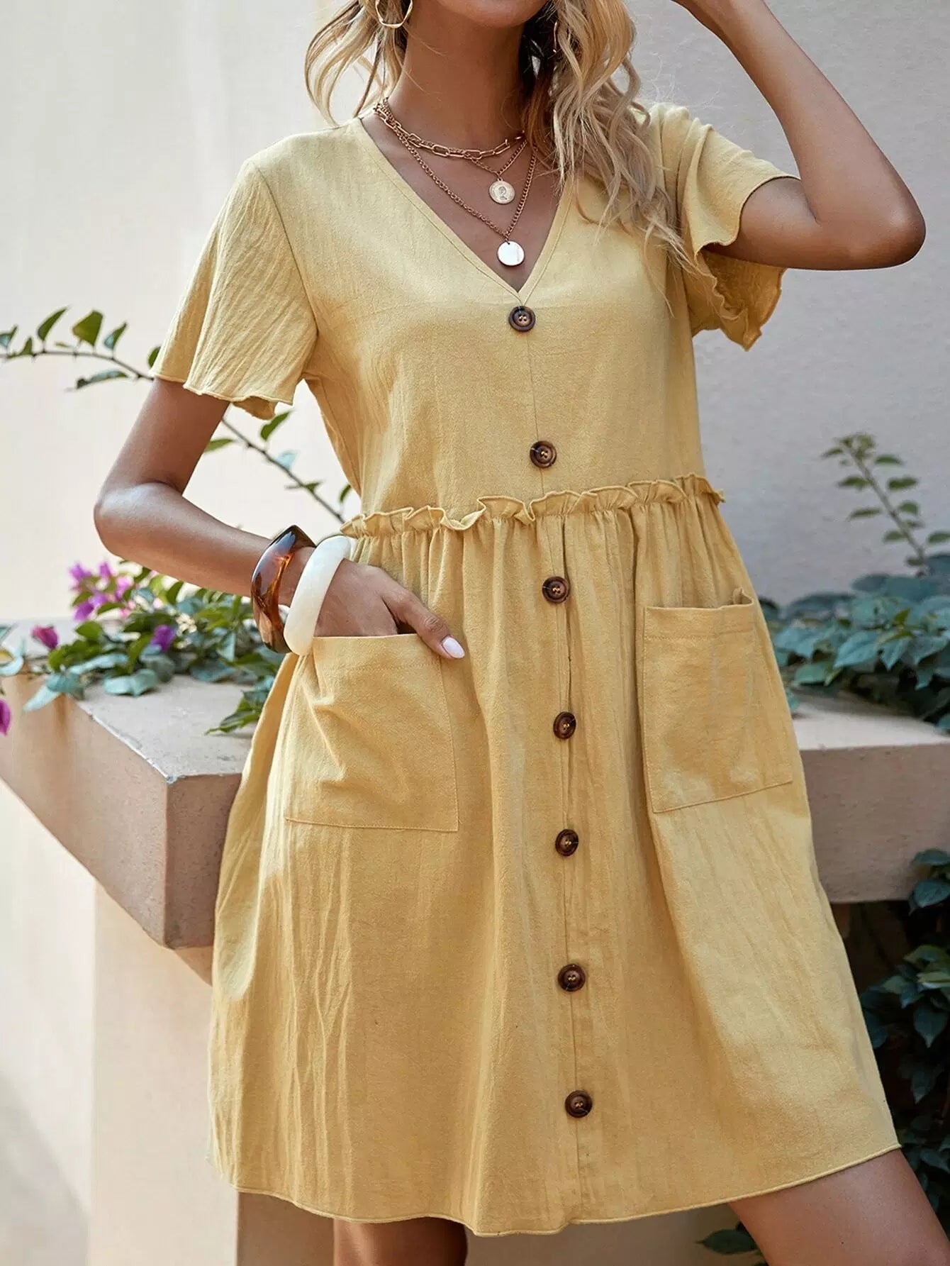 فستان كشكش بحواف كشكش بأزرار أمامية من الأمام