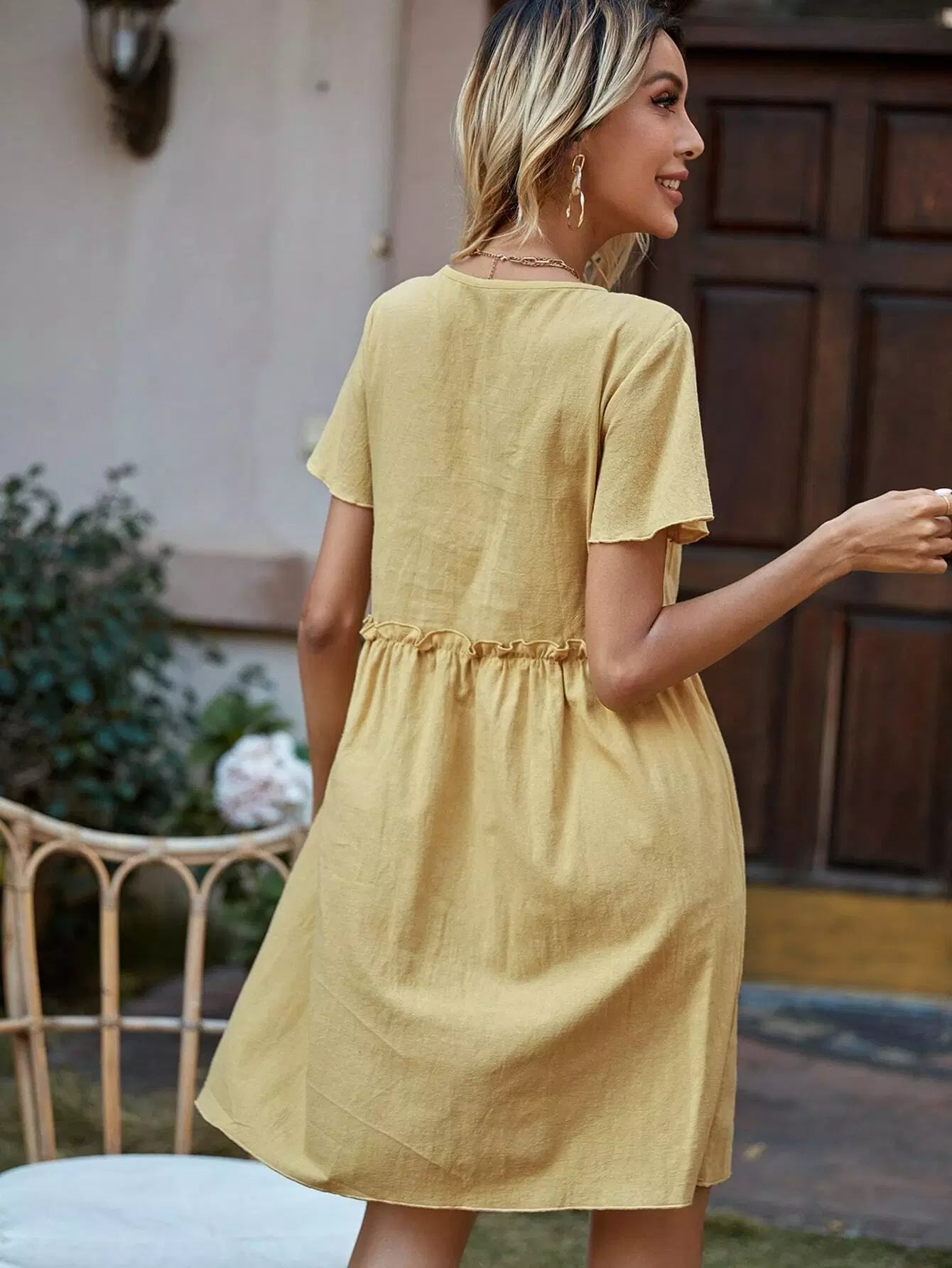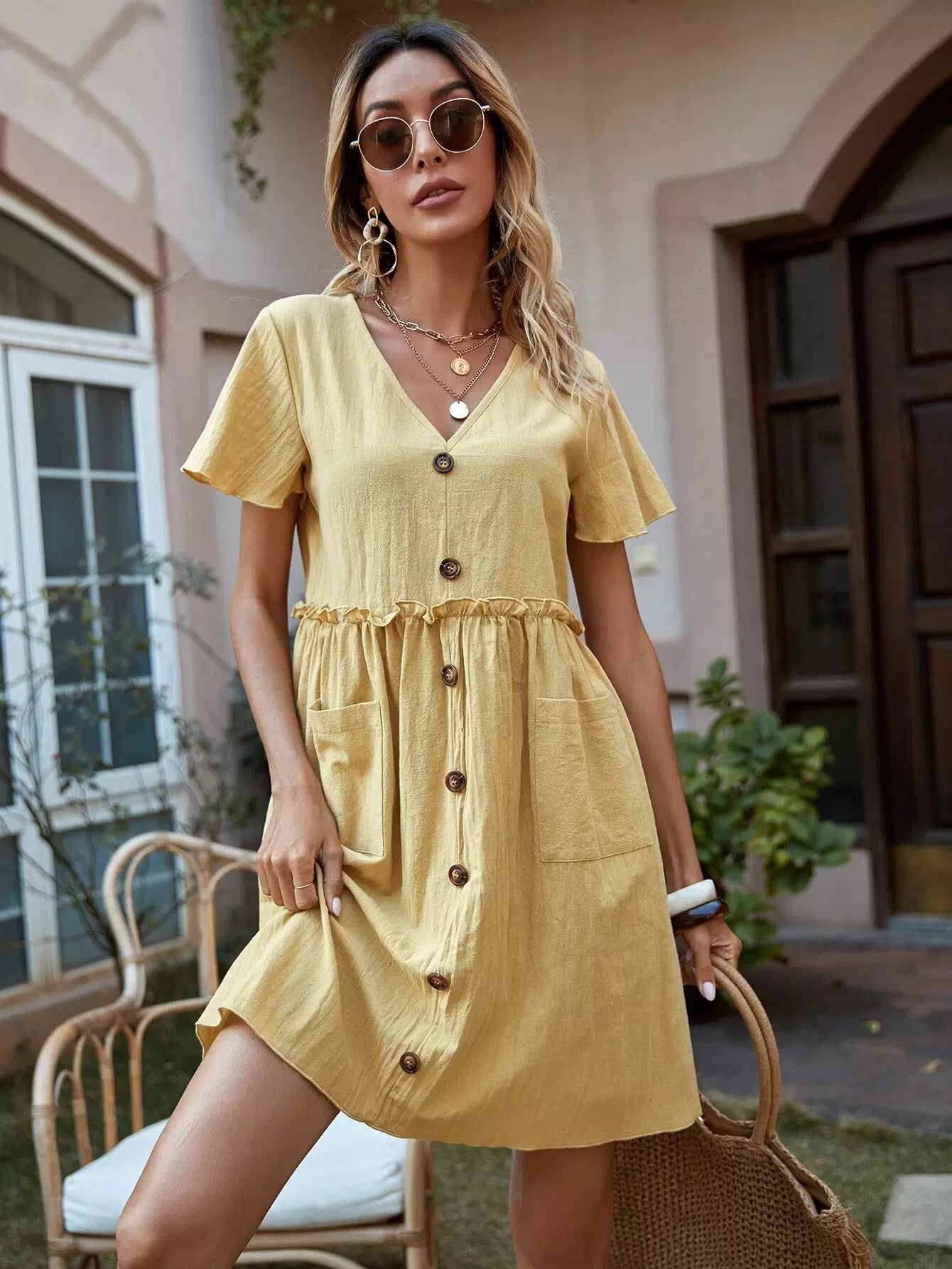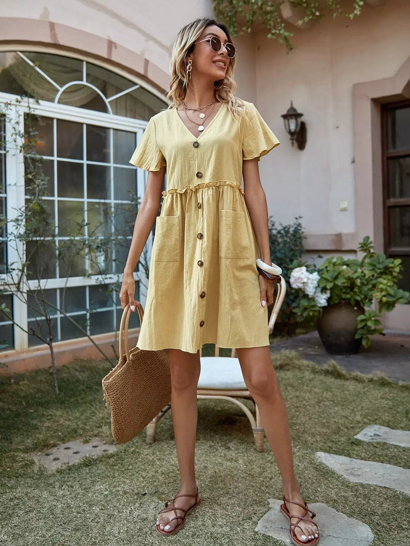 فستان كشكش بحواف كشكش بأزرار أمامية من الأمام
