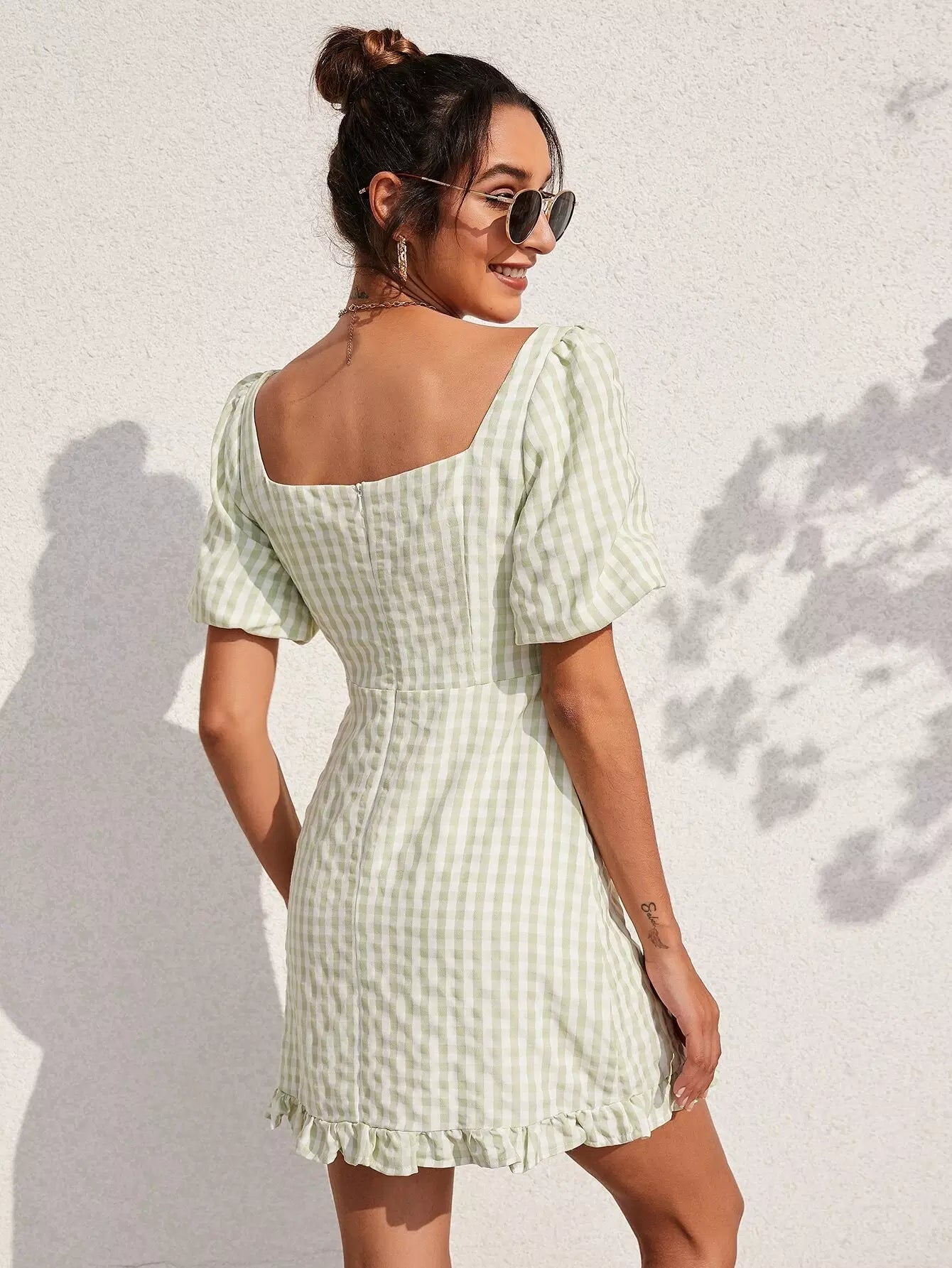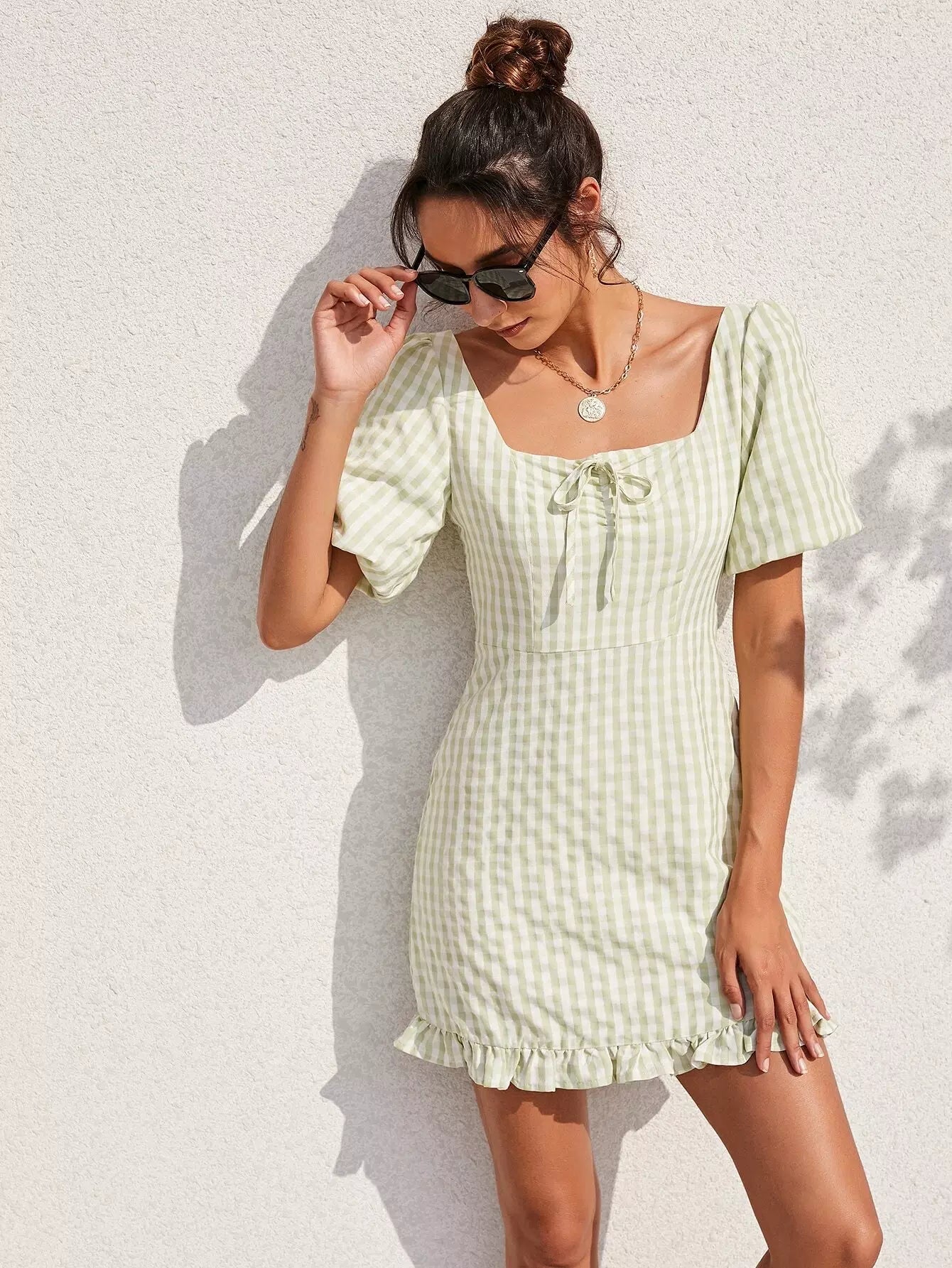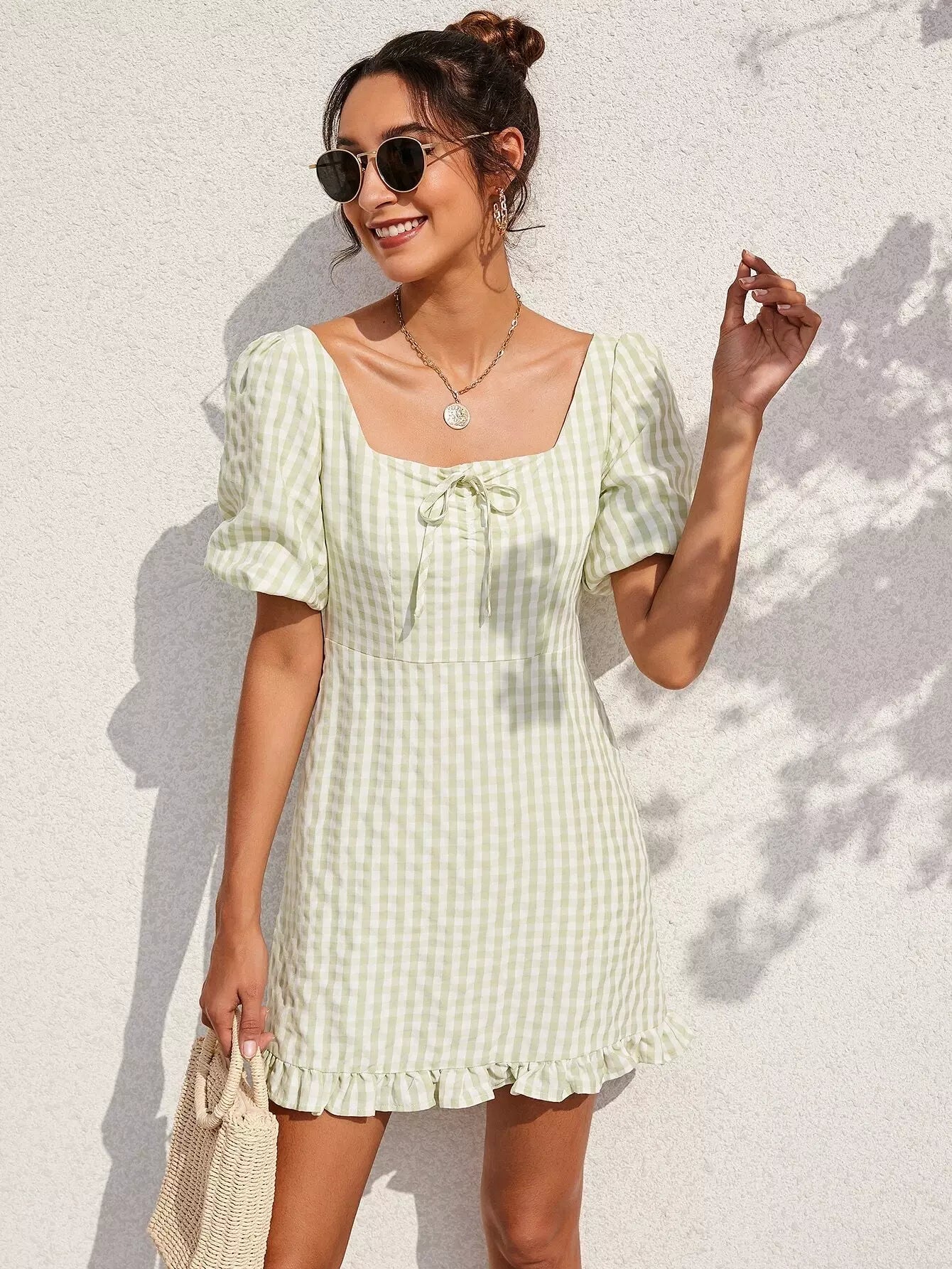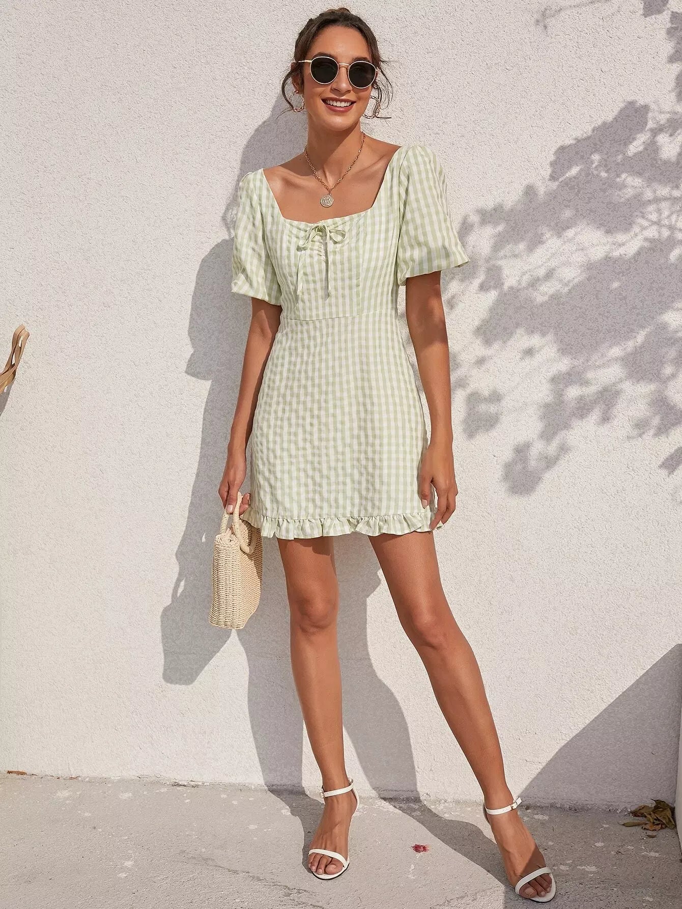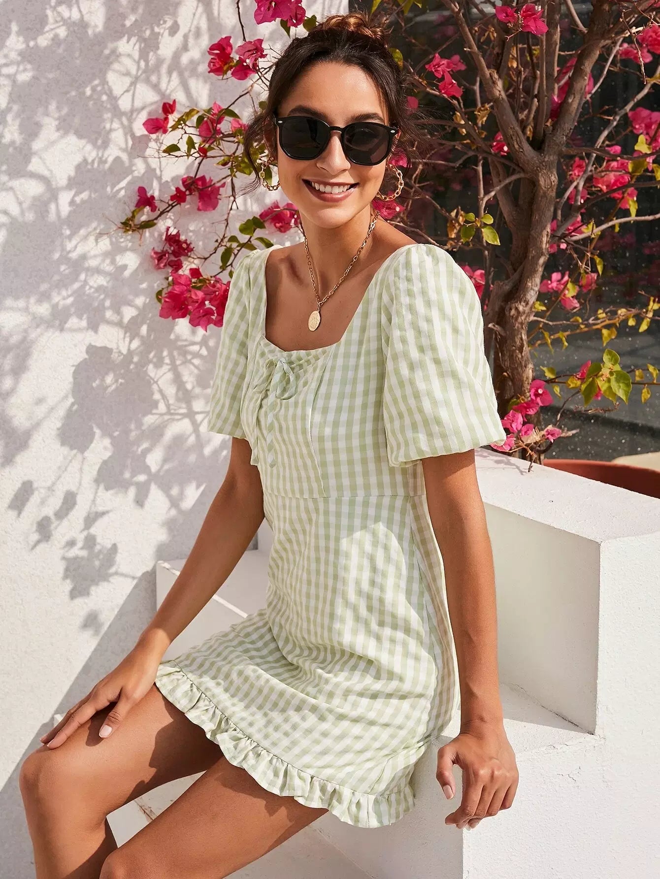 فستان من القماش القطني بربطة عنق أمامية مكشكشة من الأمام