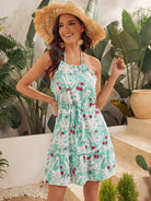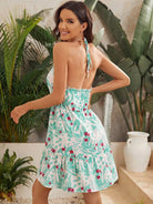 فستان قصير بياقة حول العنق مربوط من الخلف ومربوط من الخلف ومزين بالورود