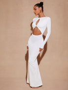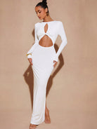 ملابس نسائية شتوية أنيقة بيضاء بفتحة أمامية ملتوية وأكتاف مبطنة وأكمام طويلة