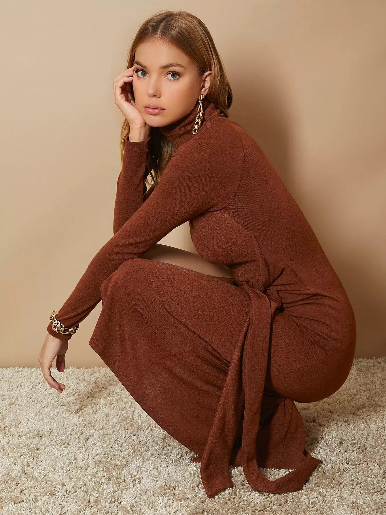 فستان بياقة عالية بفتحة رقبة عالية من الأمام بأكمام ملفوفة من الأمام